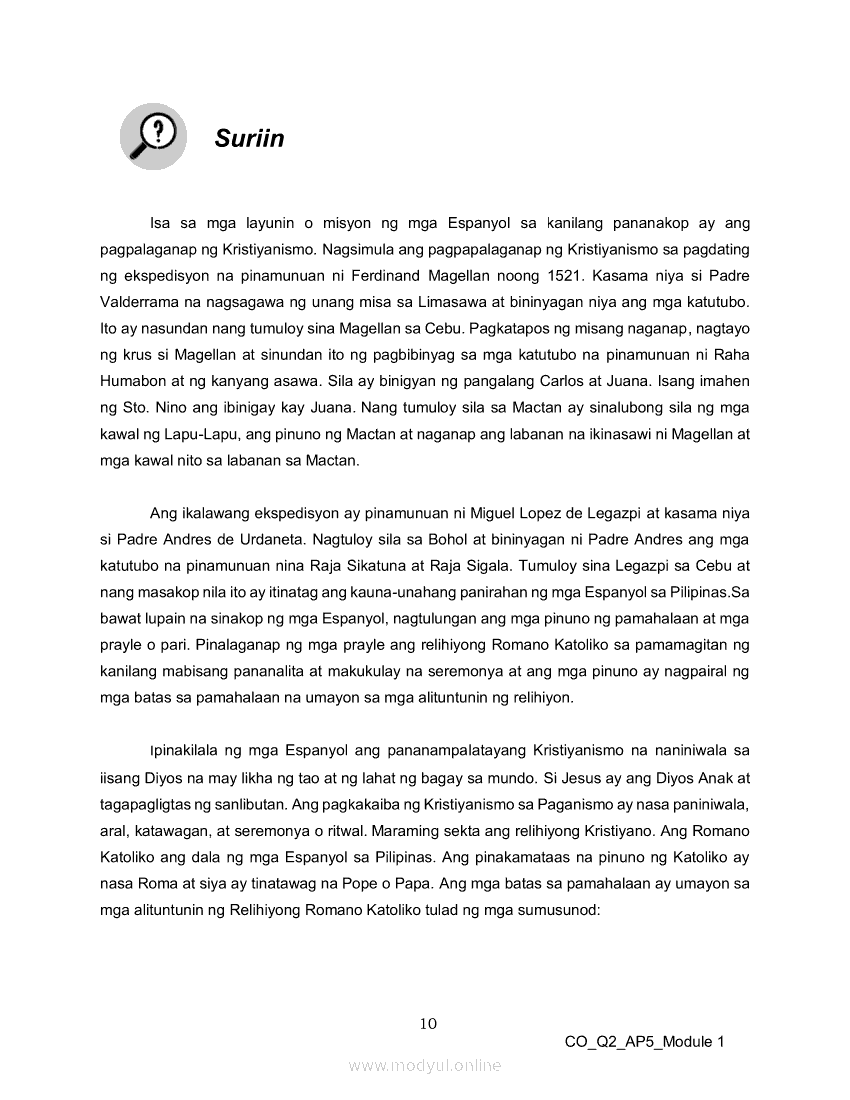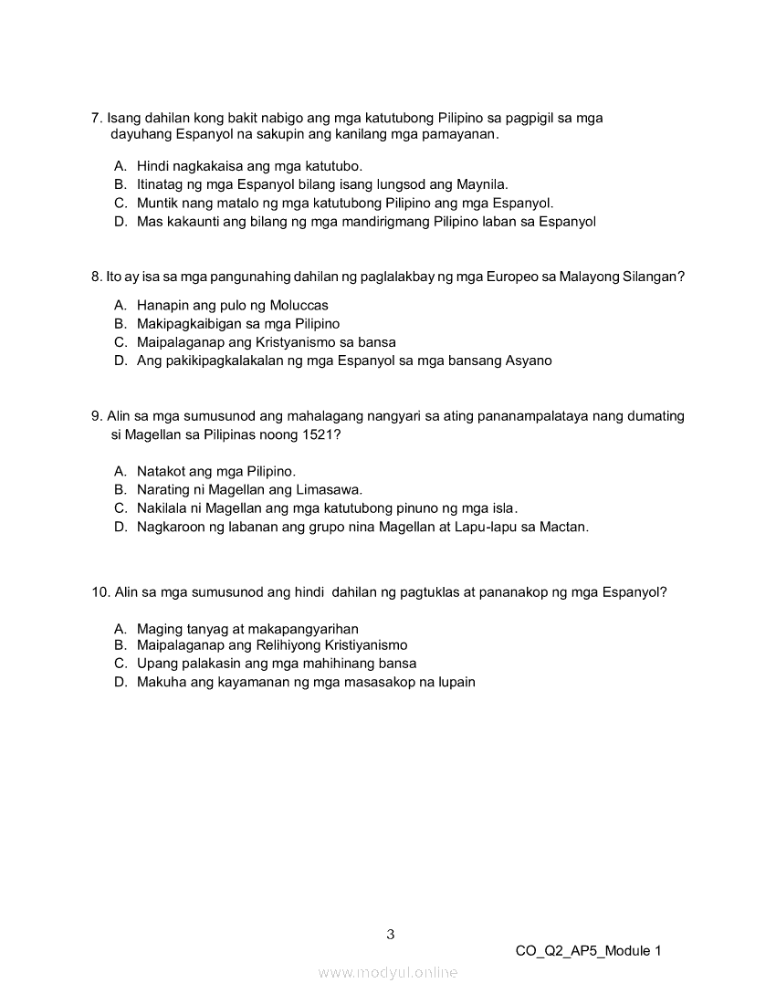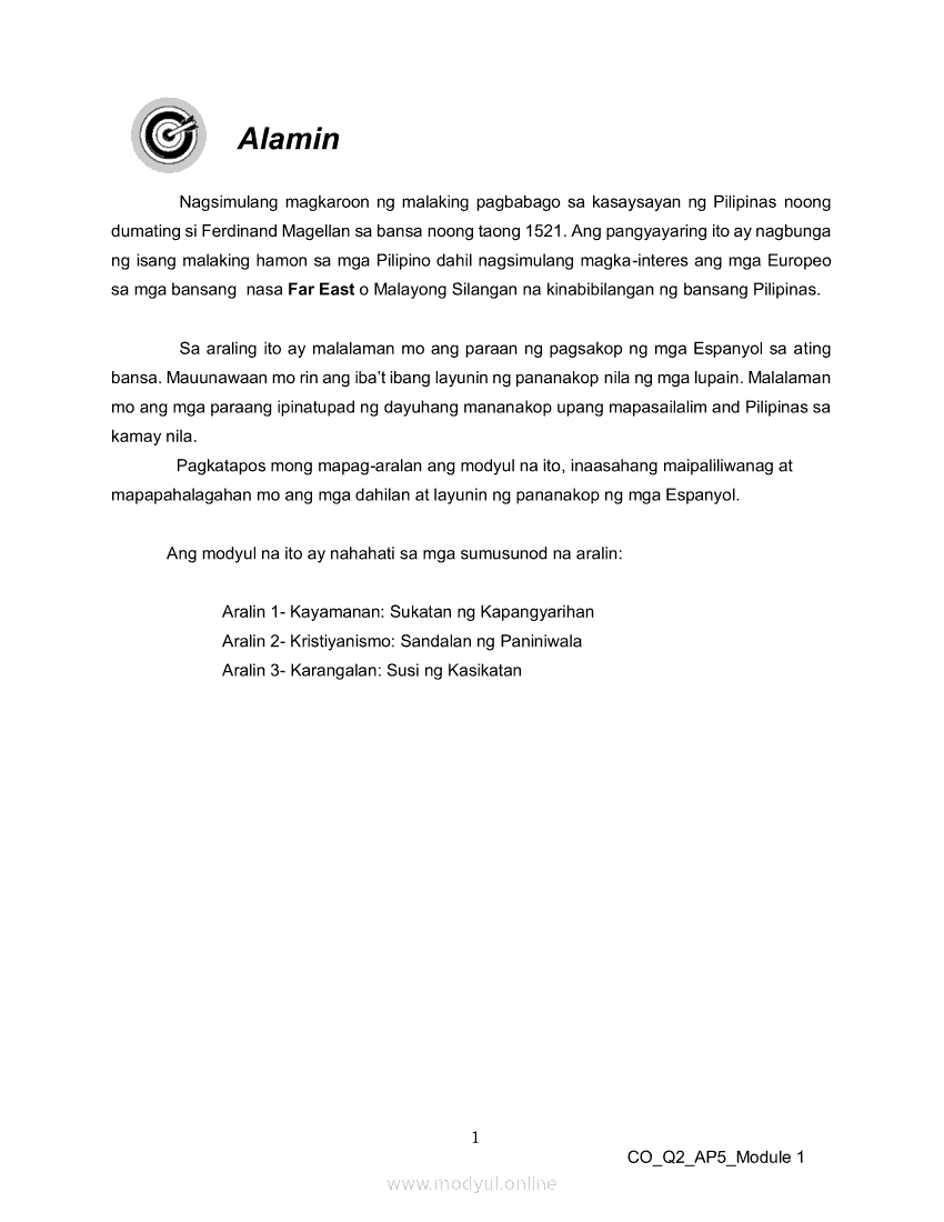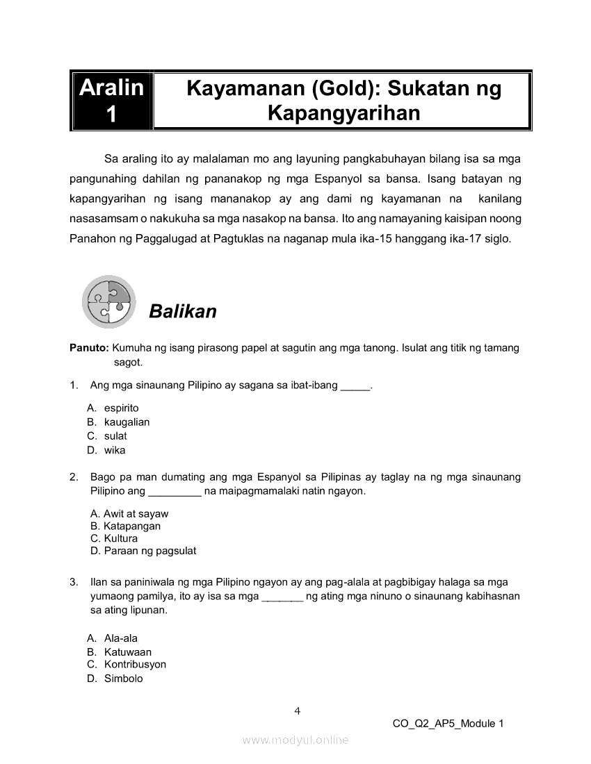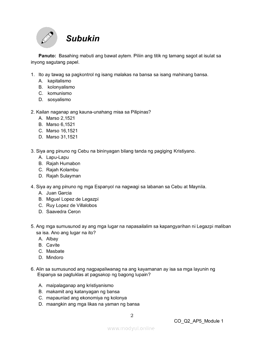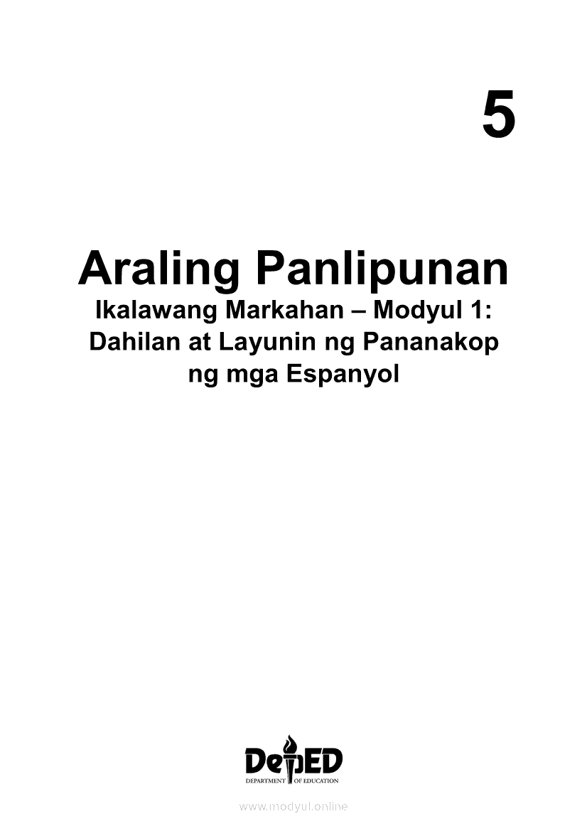 Araling Panlipunan 5 Modyul 1: Dahilan at Layunin ng Pananakop ng mga EspanyolApr 22, 2021 Grade 5Kiumo M901 Tablet for Kids — comprehensive protection in learning, safety, and entertainment for as low as **₱2,399!. Araling Panlipunan 5RelatedAraling Panlipunan Ikaapat na Markahan – Modyul 6: Ang Partisipasyon ng Iba’t ibang Rehiyon at Sektor (katutubo at kababaihan) sa pakikibaka ng bayanAraling Panlipunan Ikaapat na Markahan – Modyul 2: PAG-USBONG NG KAMALAYANG FILIPINO SA SEKULARISASYONAraling Panlipunan Ikaapat na Markahan – Modyul 4: Pananaw at Paniniwala ng mga Sultanato sa Pagpapanatili ng Kanilang Kalayaan (Ikalawang Bahagi)Araling Panlipunan Ikaapat na Markahan – Modyul 5: Mga Naunang Pag-aalsa Laban sa mga EspanyolAraling Panlipunan Ikaapat na Markahan – Modyul 8: Partisipasyon ng mga Kababaihan sa Pagsulong ng Kamalayang Pambansa