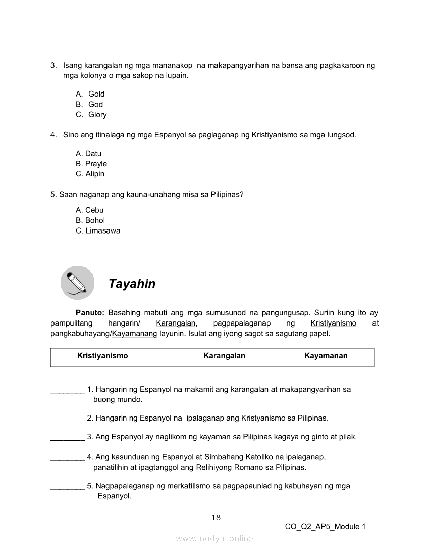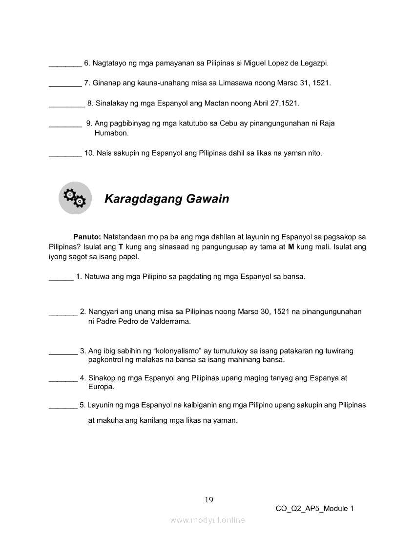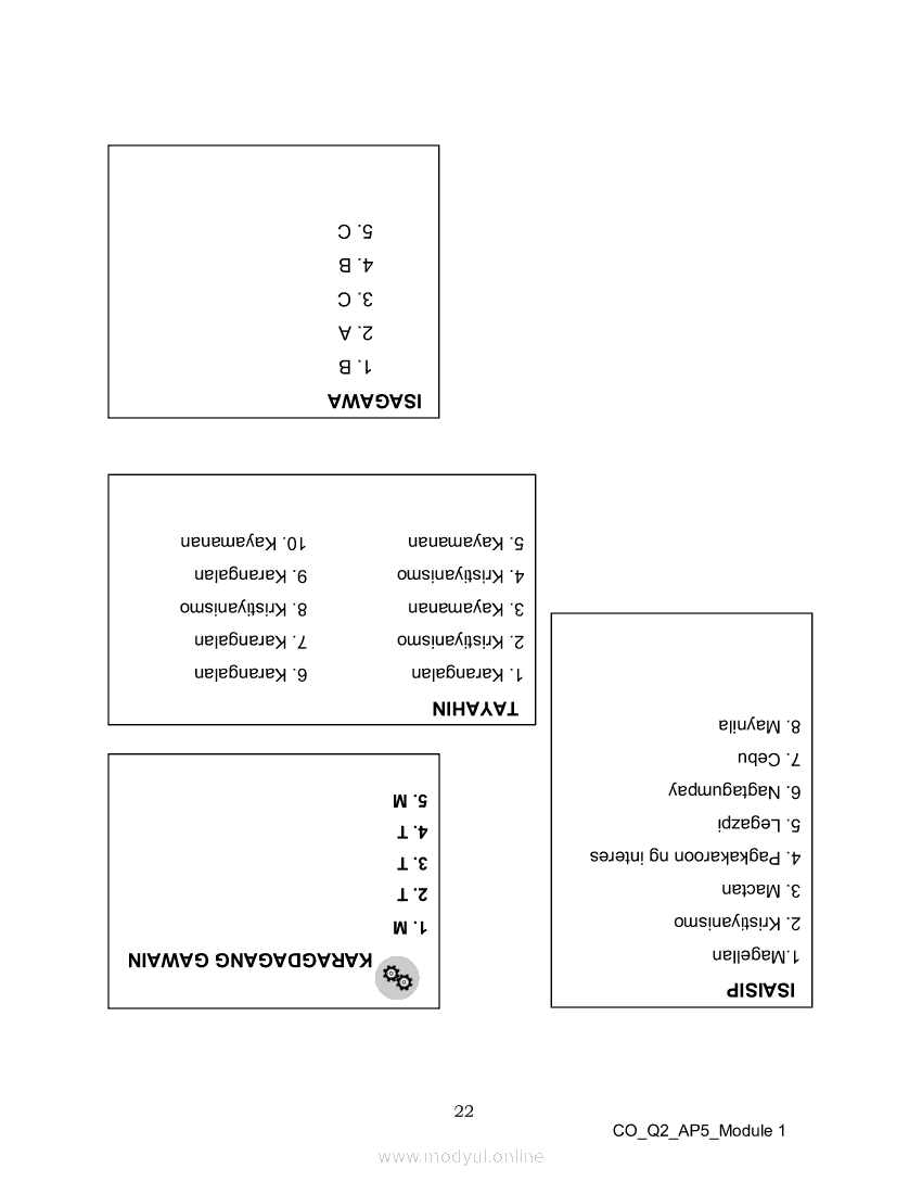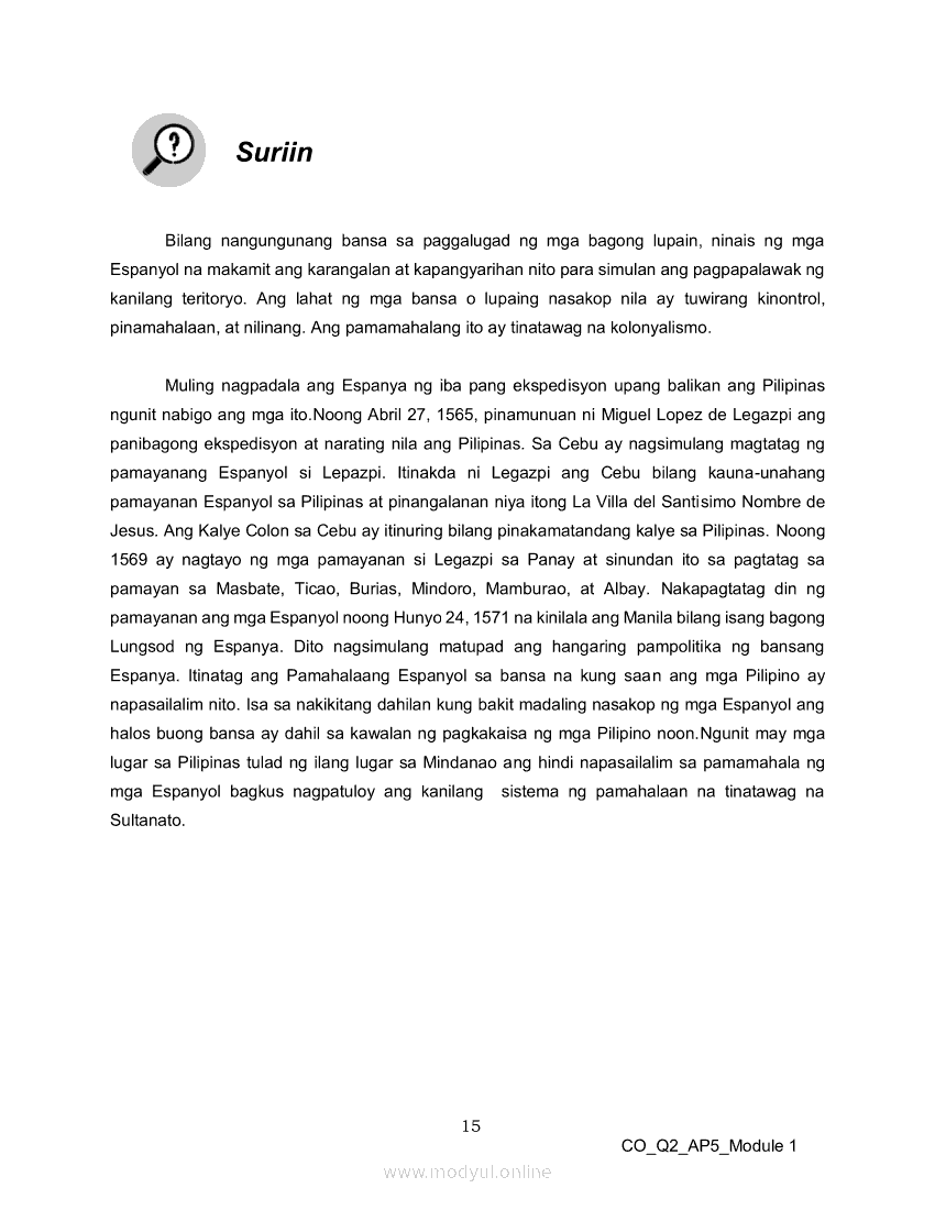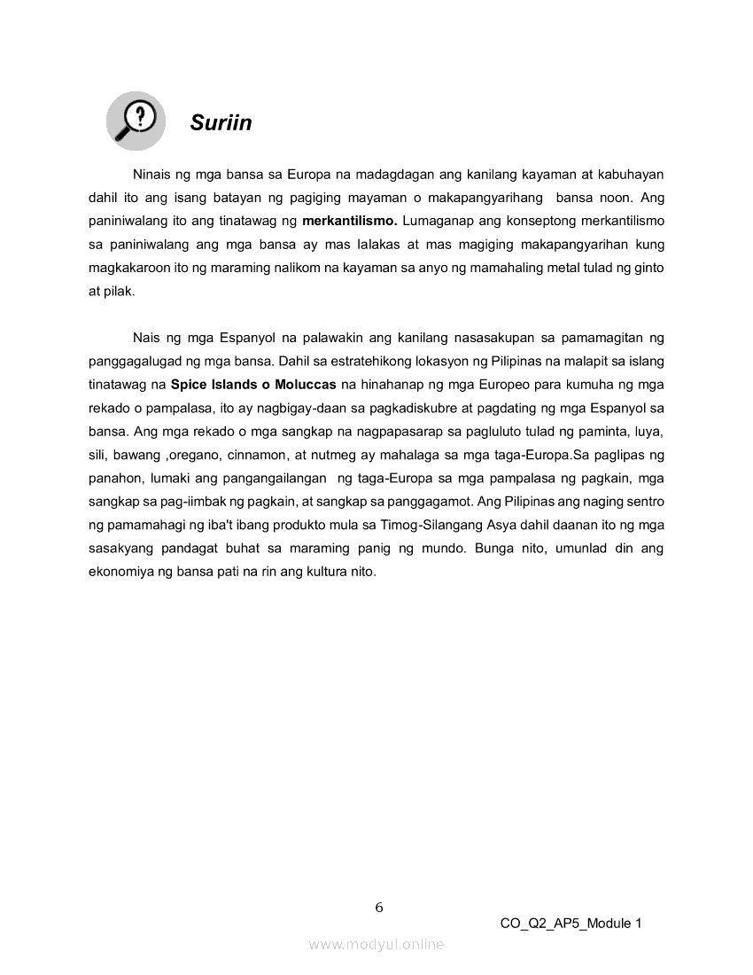 Araling Panlipunan 5 Modyul 1: Dahilan at Layunin ng Pananakop ng mga EspanyolApr 22, 2021 Grade 5Kiumo M901 Tablet for Kids — comprehensive protection in learning, safety, and entertainment for as low as **₱2,399!. Araling Panlipunan 5RelatedAraling Panlipunan Ikaapat na Markahan – Modyul 6: Ang Partisipasyon ng Iba’t ibang Rehiyon at Sektor (katutubo at kababaihan) sa pakikibaka ng bayanAraling Panlipunan Ikaapat na Markahan – Modyul 2: PAG-USBONG NG KAMALAYANG FILIPINO SA SEKULARISASYONAraling Panlipunan Ikaapat na Markahan – Modyul 4: Pananaw at Paniniwala ng mga Sultanato sa Pagpapanatili ng Kanilang Kalayaan (Ikalawang Bahagi)Araling Panlipunan Ikaapat na Markahan – Modyul 5: Mga Naunang Pag-aalsa Laban sa mga EspanyolAraling Panlipunan Ikaapat na Markahan – Modyul 8: Partisipasyon ng mga Kababaihan sa Pagsulong ng Kamalayang Pambansa