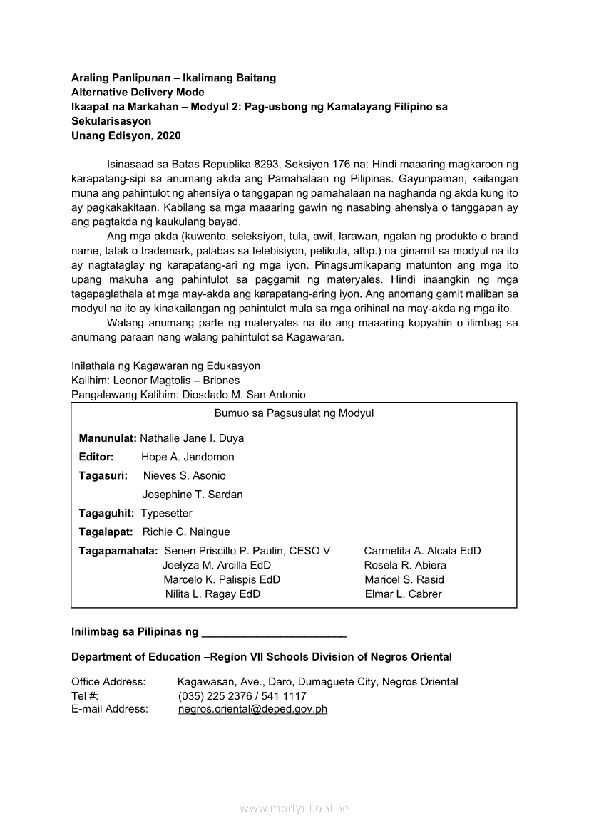 Araling Panlipunan Ikaapat na Markahan – Modyul 2: PAG-USBONG NG KAMALAYANG FILIPINO SA SEKULARISASYONMay 26, 2021 Grade 5Kiumo M901 Tablet for Kids — comprehensive protection in learning, safety, and entertainment for as low as **₱2,399!. Araling Panlipunan 5 4th QuarterRelatedAraling Panlipunan Ikaapat na Markahan – Modyul 6: Ang Partisipasyon ng Iba’t ibang Rehiyon at Sektor (katutubo at kababaihan) sa pakikibaka ng bayanAraling Panlipunan Ikaapat na Markahan – Modyul 8: Partisipasyon ng mga Kababaihan sa Pagsulong ng Kamalayang PambansaAraling Panlipunan Ikaapat na Markahan Modyul 1: Mga Salik na Nagbigay- Daan sa Pagusbong ng Nasyonalismong PilipinoAraling Panlipunan Ikaapat na Markahan – Modyul 4: Pananaw at Paniniwala ng mga Sultanato sa Pagpapanatili ng Kanilang Kalayaan (Ikalawang Bahagi)Araling Panlipunan Ikaapat na Markahan – Modyul 5: Mga Naunang Pag-aalsa Laban sa mga Espanyol