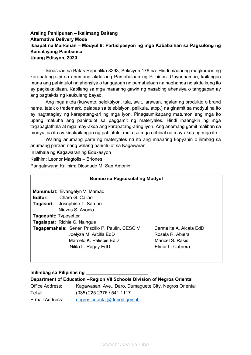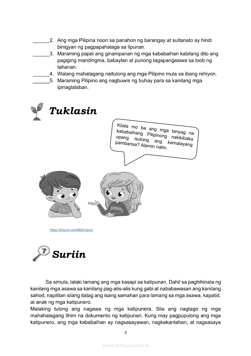 Araling Panlipunan Ikaapat na Markahan – Modyul 8: Partisipasyon ng mga Kababaihan sa Pagsulong ng Kamalayang PambansaMay 26, 2021 Grade 5Kiumo M901 Tablet for Kids — comprehensive protection in learning, safety, and entertainment for as low as **₱2,399!. Araling Panlipunan 5 4th QuarterRelatedAraling Panlipunan Ikaapat na Markahan – Modyul 3 Pananaw at Paniniwala ng mga Sultanato (Katutubong Muslim) sa Pagpapanatili ng Kanilang KalayaanAraling Panlipunan Ikaapat na Markahan – Modyul 6: Ang Partisipasyon ng Iba’t ibang Rehiyon at Sektor (katutubo at kababaihan) sa pakikibaka ng bayanAraling Panlipunan Ikaapat na Markahan – Modyul 2: PAG-USBONG NG KAMALAYANG FILIPINO SA SEKULARISASYONAraling Panlipunan Ikaapat na Markahan – Modyul 7 Kahalagahan ng Pakikilahok ng Iba’t - Ibang Rehiyon at Sektor ng mga KatutuboAraling Panlipunan Ikaapat na Markahan – Modyul 4: Pananaw at Paniniwala ng mga Sultanato sa Pagpapanatili ng Kanilang Kalayaan (Ikalawang Bahagi)