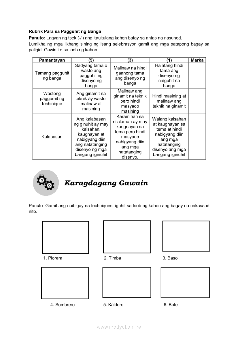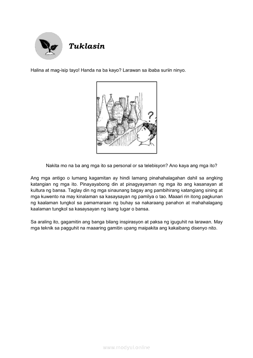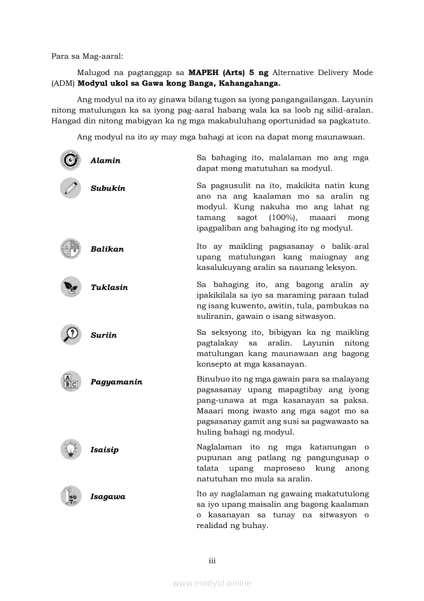Arts 5 Modyul 3: Mga Sinaunang Gusali sa BansaApr 22, 2021 Grade 5Kiumo M901 Tablet for Kids — comprehensive protection in learning, safety, and entertainment for as low as **₱2,399!. Arts 5RelatedARTS Ikaapat na Markahan – Modyul 4b: Paggawa ng 3-Dimensional Crafts: Mobile Art, Paper Mache at Paper BeadsARTS Ikaapat na Markahan – Modyul 4a: 3D at Eskultura: Ang Tradisyon ng Sining sa PilipinasArts 5 Modyul 2: Gawa Kong Banga: Kahanga-hangaArts 5 Modyul para sa Ikalawang Markahan (PIVOT)Arts 5 Modyul 4: Sinaunang Bagay, Ating Italakay