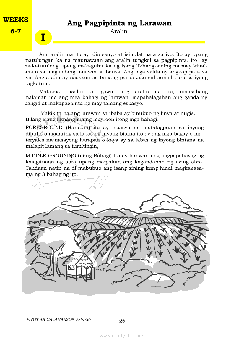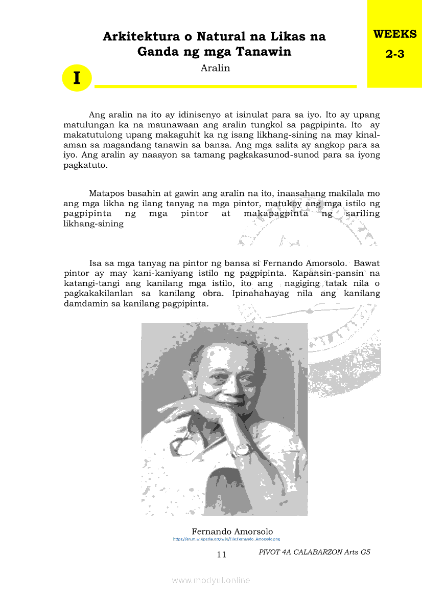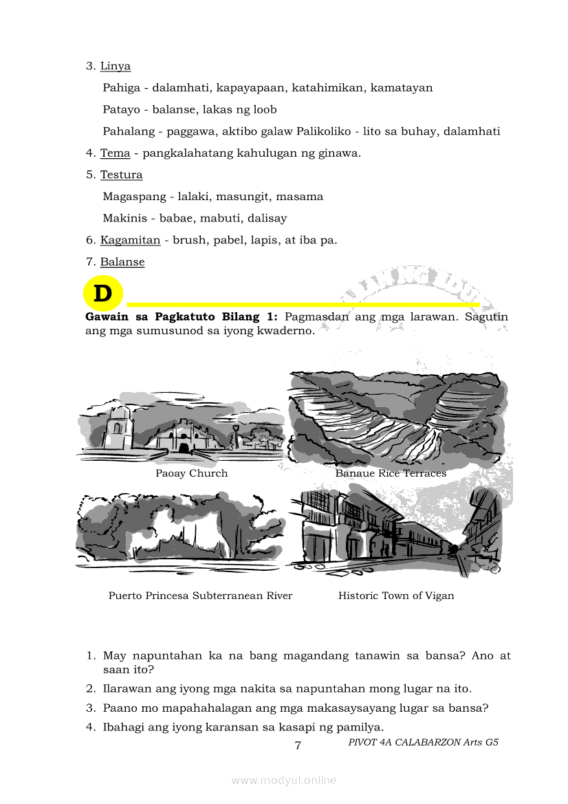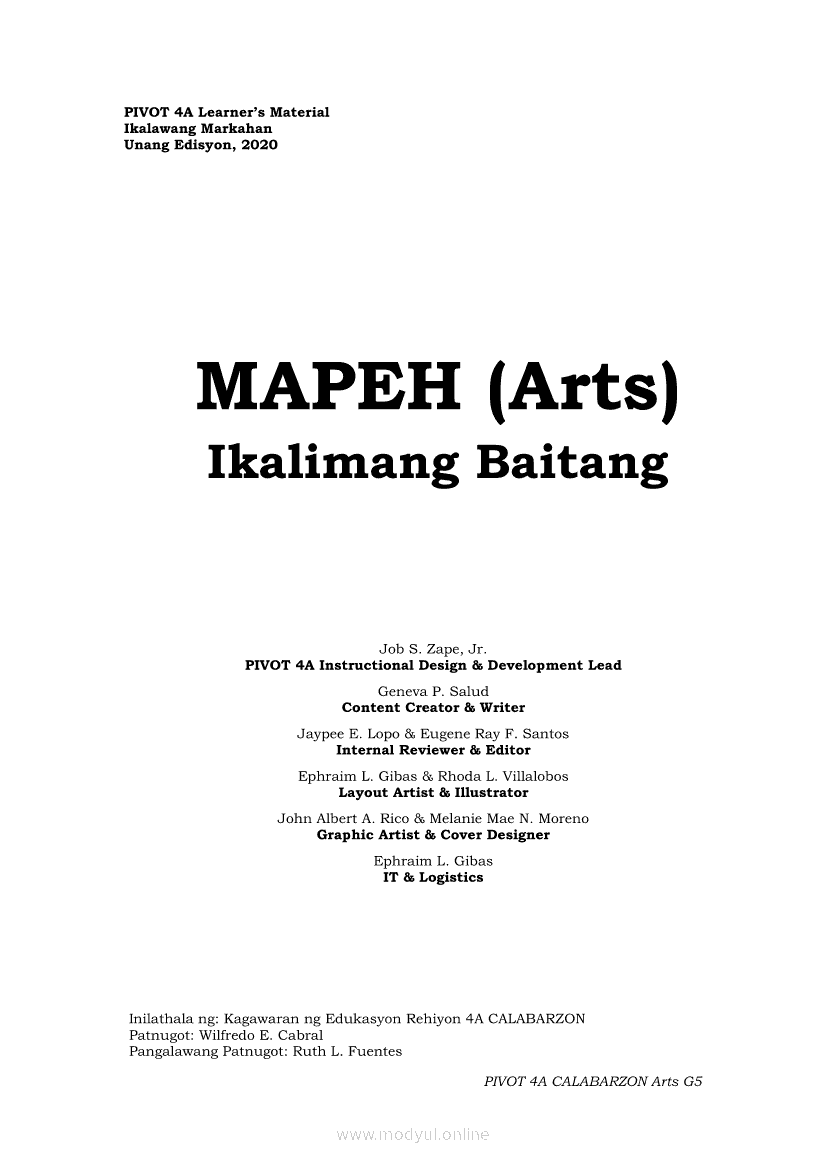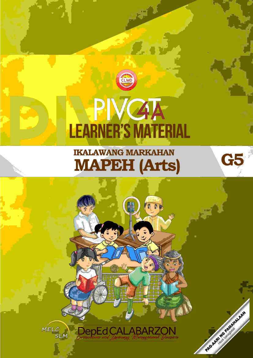 Arts 5 Modyul para sa Ikalawang Markahan (PIVOT)Apr 22, 2021 Grade 5Kiumo M901 Tablet for Kids — comprehensive protection in learning, safety, and entertainment for as low as **₱2,399!. Arts 5RelatedARTS Ikaapat na Markahan – Modyul 4a: 3D at Eskultura: Ang Tradisyon ng Sining sa PilipinasARTS Ikaapat na Markahan – Modyul 4b: Paggawa ng 3-Dimensional Crafts: Mobile Art, Paper Mache at Paper BeadsArts 5 Modyul 8: Ang Aking KomunidadArts 5 Modyul 7: Payak na Exhibit: MakibahagiArts 5 Modyul 3: Mga Sinaunang Gusali sa Bansa