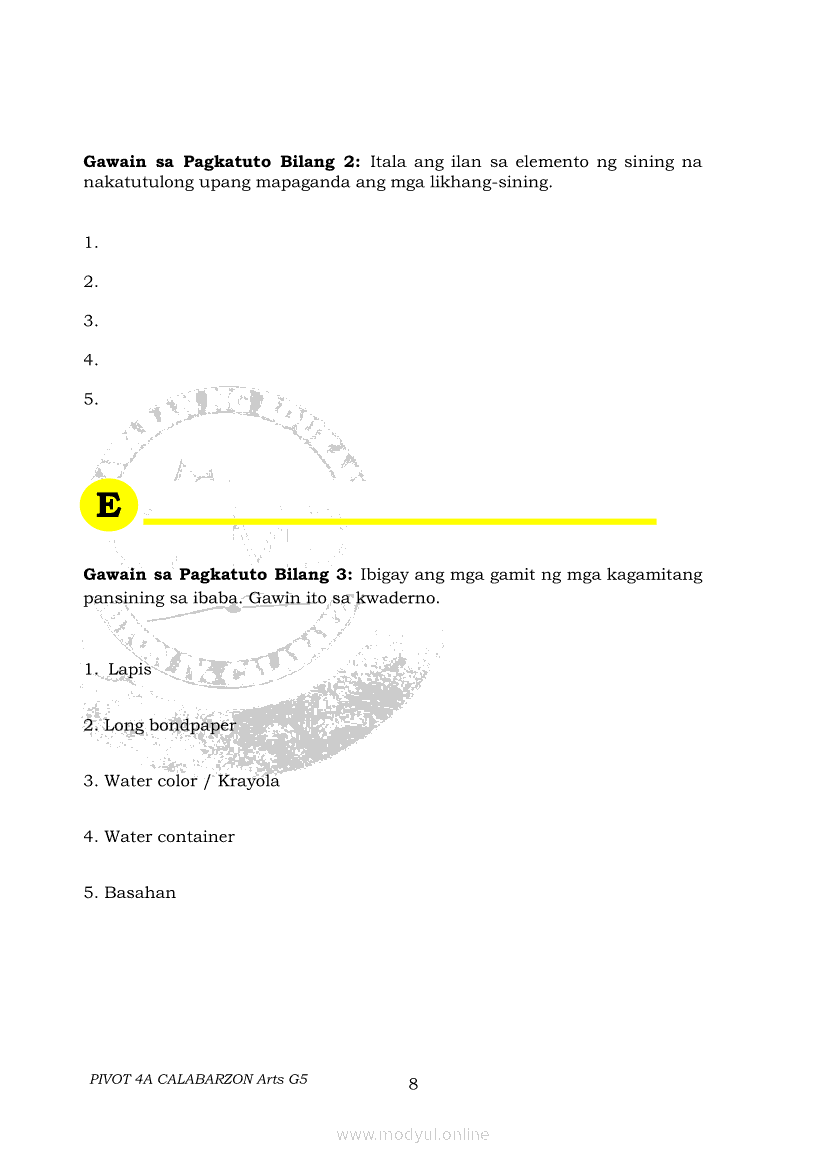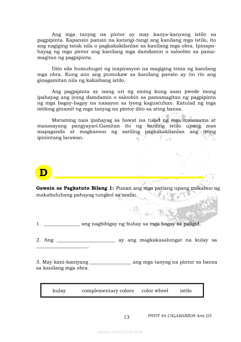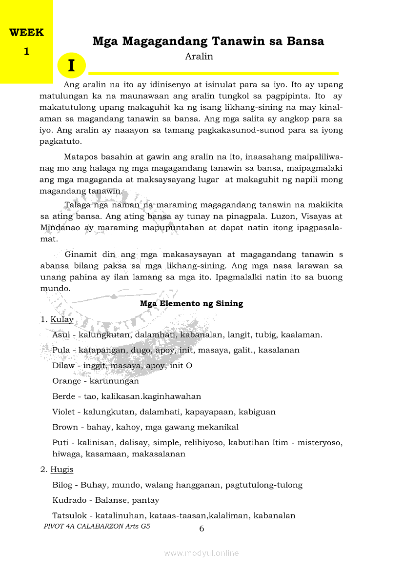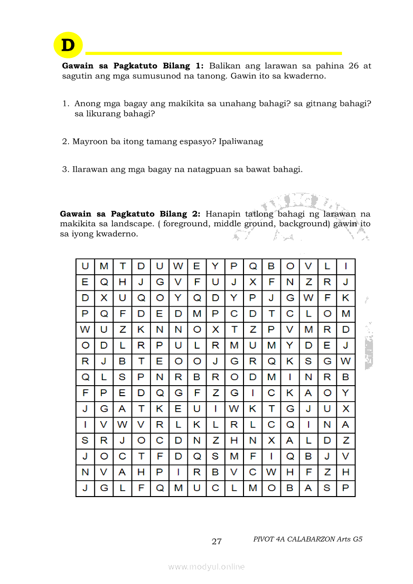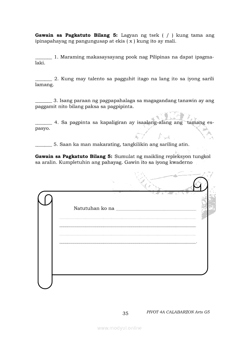 Arts 5 Modyul para sa Ikalawang Markahan (PIVOT)Apr 22, 2021 Grade 5Kiumo M901 Tablet for Kids — comprehensive protection in learning, safety, and entertainment for as low as **₱2,399!. Arts 5RelatedARTS Ikaapat na Markahan – Modyul 4a: 3D at Eskultura: Ang Tradisyon ng Sining sa PilipinasARTS Ikaapat na Markahan – Modyul 4b: Paggawa ng 3-Dimensional Crafts: Mobile Art, Paper Mache at Paper BeadsArts 5 Modyul 8: Ang Aking KomunidadArts 5 Modyul 7: Payak na Exhibit: MakibahagiArts 5 Modyul 3: Mga Sinaunang Gusali sa Bansa