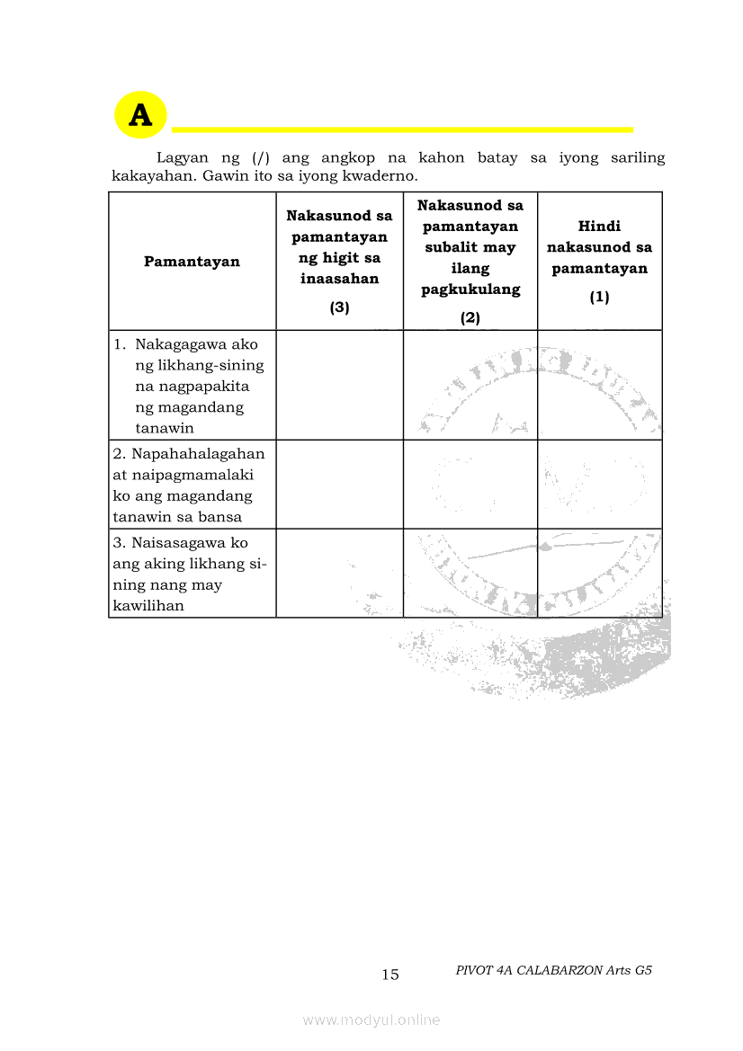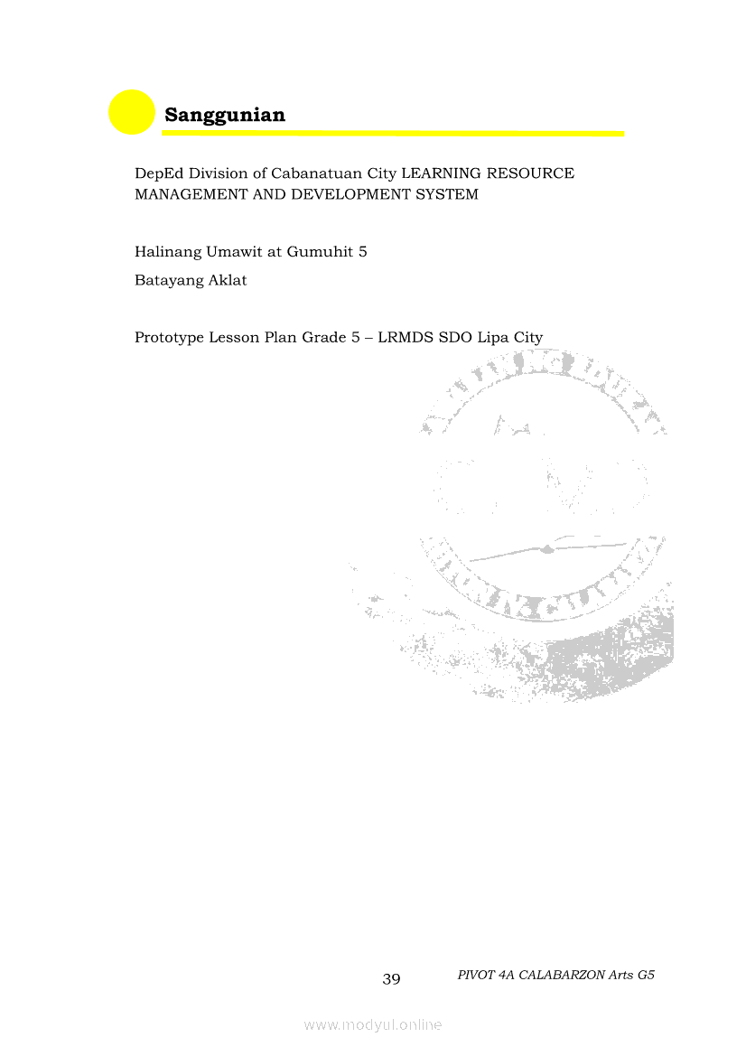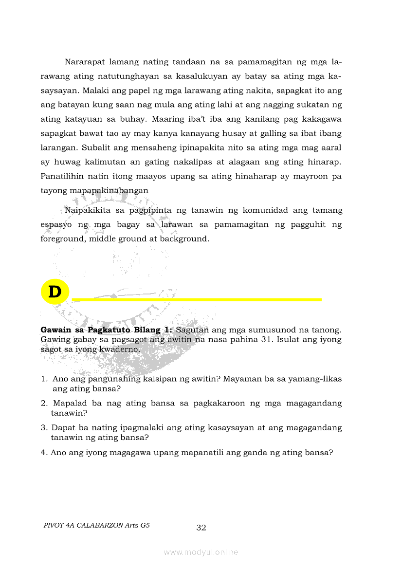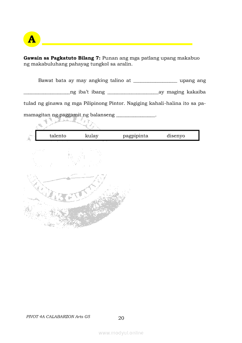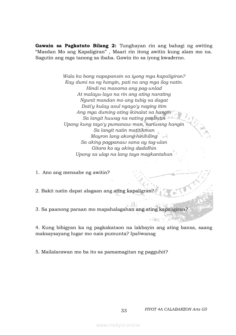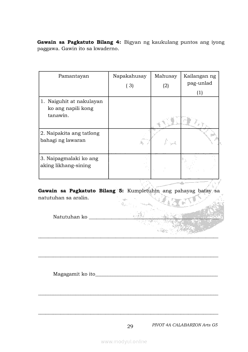 Arts 5 Modyul para sa Ikalawang Markahan (PIVOT)Apr 22, 2021 Grade 5Kiumo M901 Tablet for Kids — comprehensive protection in learning, safety, and entertainment for as low as **₱2,399!. Arts 5RelatedARTS Ikaapat na Markahan – Modyul 4a: 3D at Eskultura: Ang Tradisyon ng Sining sa PilipinasARTS Ikaapat na Markahan – Modyul 4b: Paggawa ng 3-Dimensional Crafts: Mobile Art, Paper Mache at Paper BeadsArts 5 Modyul 8: Ang Aking KomunidadArts 5 Modyul 7: Payak na Exhibit: MakibahagiArts 5 Modyul 3: Mga Sinaunang Gusali sa Bansa