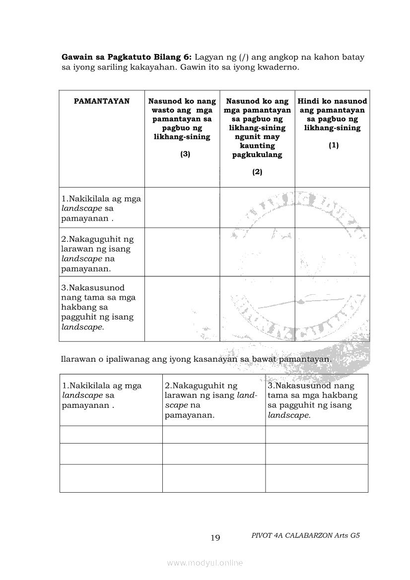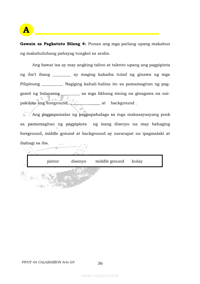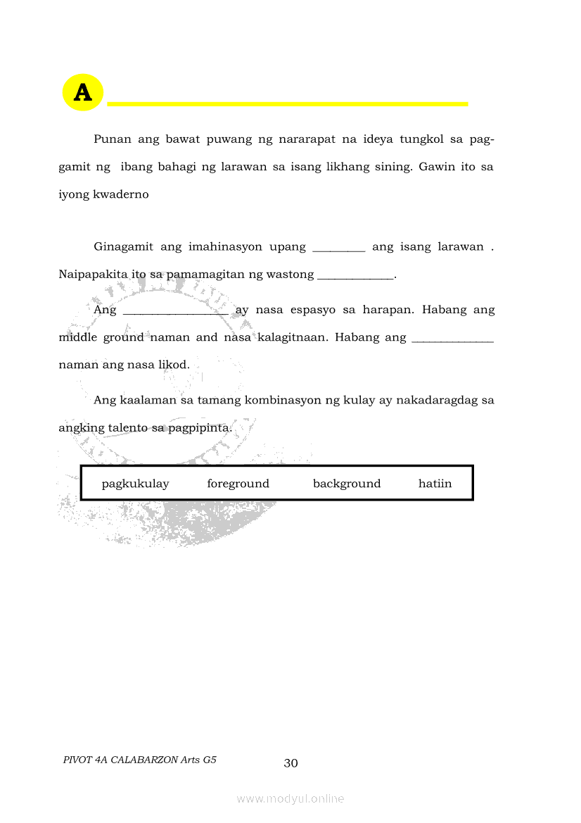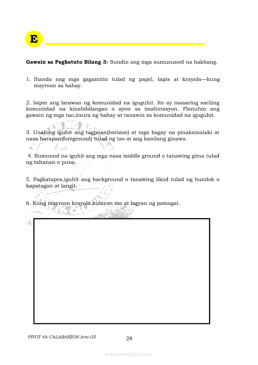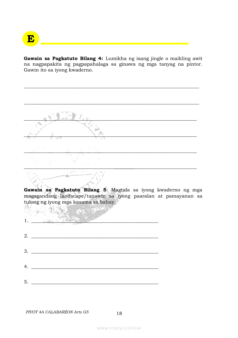Arts 5 Modyul para sa Ikalawang Markahan (PIVOT)Apr 22, 2021 Grade 5Kiumo M901 Tablet for Kids — comprehensive protection in learning, safety, and entertainment for as low as **₱2,399!. Arts 5RelatedARTS Ikaapat na Markahan – Modyul 4a: 3D at Eskultura: Ang Tradisyon ng Sining sa PilipinasARTS Ikaapat na Markahan – Modyul 4b: Paggawa ng 3-Dimensional Crafts: Mobile Art, Paper Mache at Paper BeadsArts 5 Modyul 8: Ang Aking KomunidadArts 5 Modyul 7: Payak na Exhibit: MakibahagiArts 5 Modyul 3: Mga Sinaunang Gusali sa Bansa