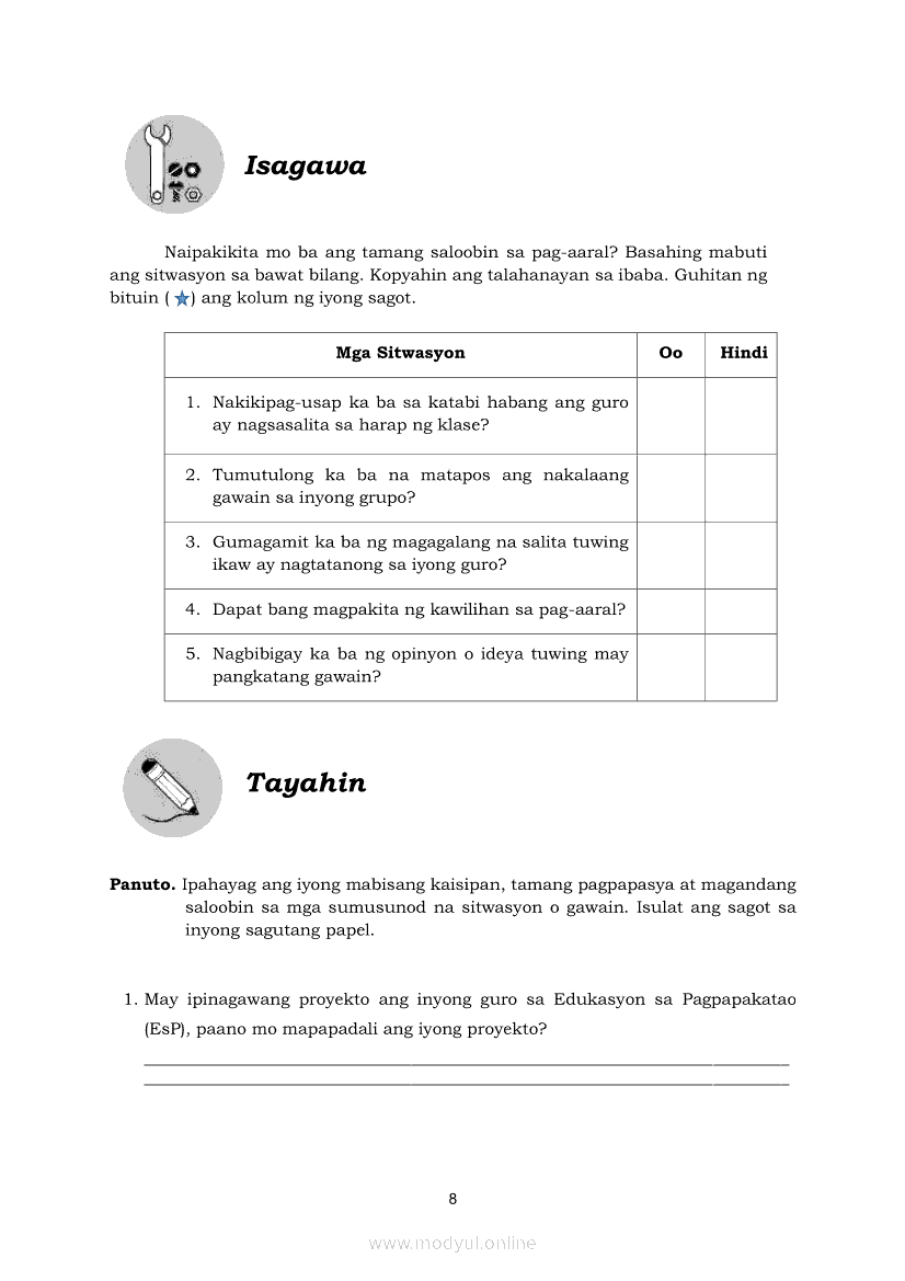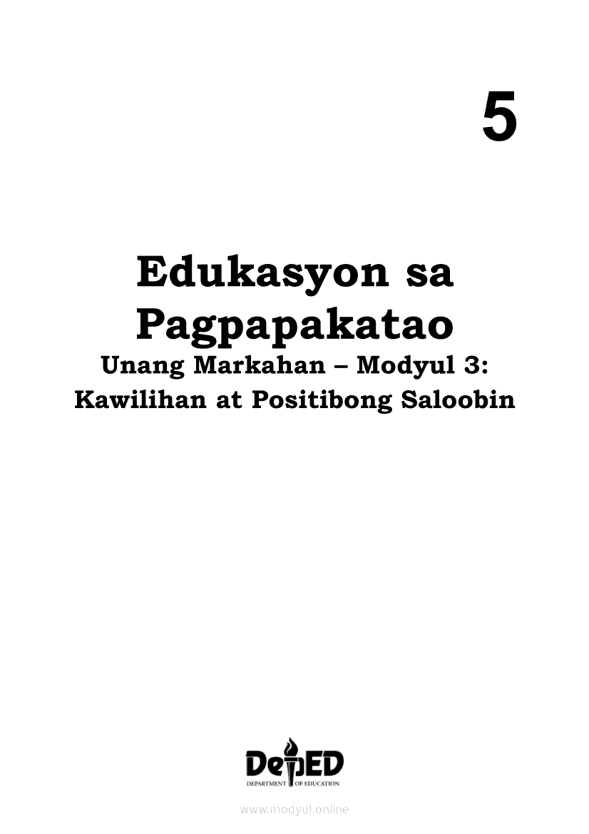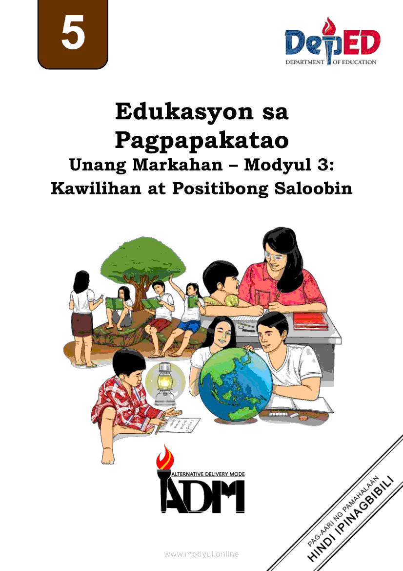 Edukasyon sa Pagpapakatao 5 Modyul 3: Kawilihan at Positibong SaloobinApr 22, 2021 Grade 5Kiumo M901 Tablet for Kids — comprehensive protection in learning, safety, and entertainment for as low as **₱2,399!. Edukasyon sa Pagpapakatao 5RelatedEdukasyon sa Pagpapakatao Ikaapat na Markahan – Modyul 1: Isinasaalang-alang Ko Ang Kapwa Ko (Linggo: Una)Edukasyon sa Pagpapakatao Ikaapat na Markahan – Modyul 2: Nananalig Ako sa Diyos (Linggo: Ikalawa)Edukasyon sa Pagpapakatao 5 Modyul para sa Ikalawang Markahan (PIVOT)Edukasyon sa Pagpapakatao 5 Modyul 5: Pagkakaisa sa Pagtatapos ng GawainEdukasyon sa Pagpapakatao 5 Modyul 4: Matapat na Paggawa sa Proyektong Pampaaralan