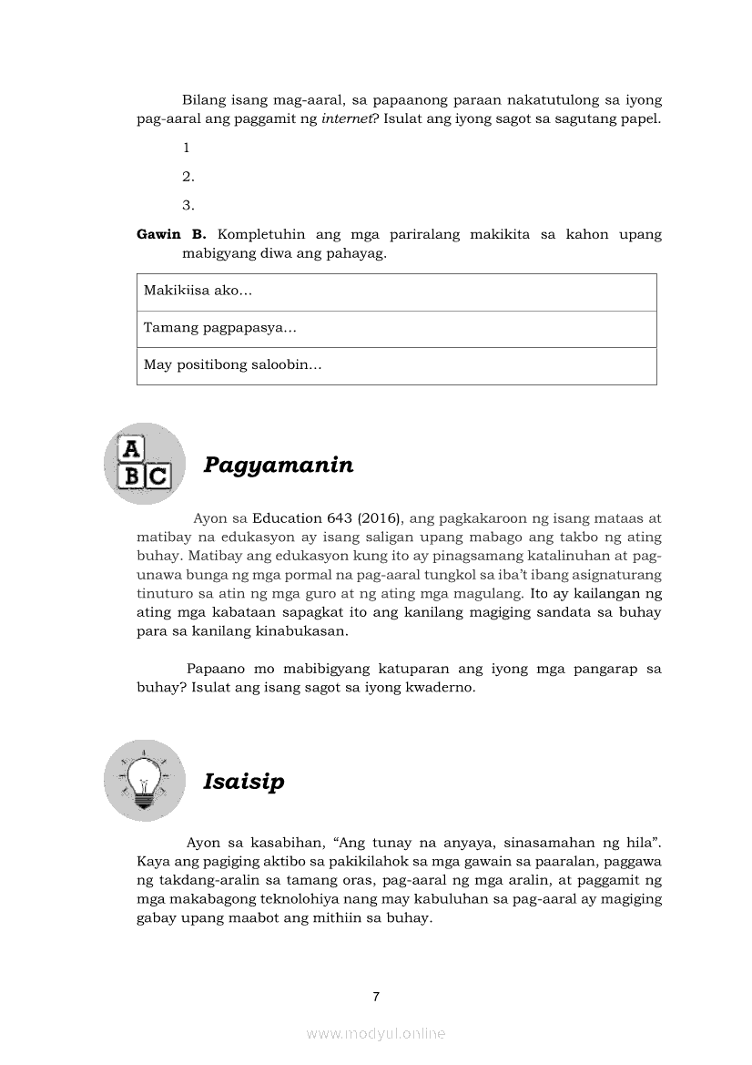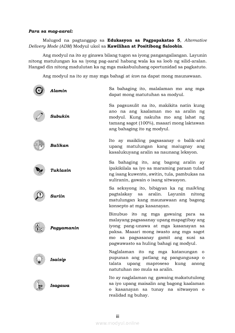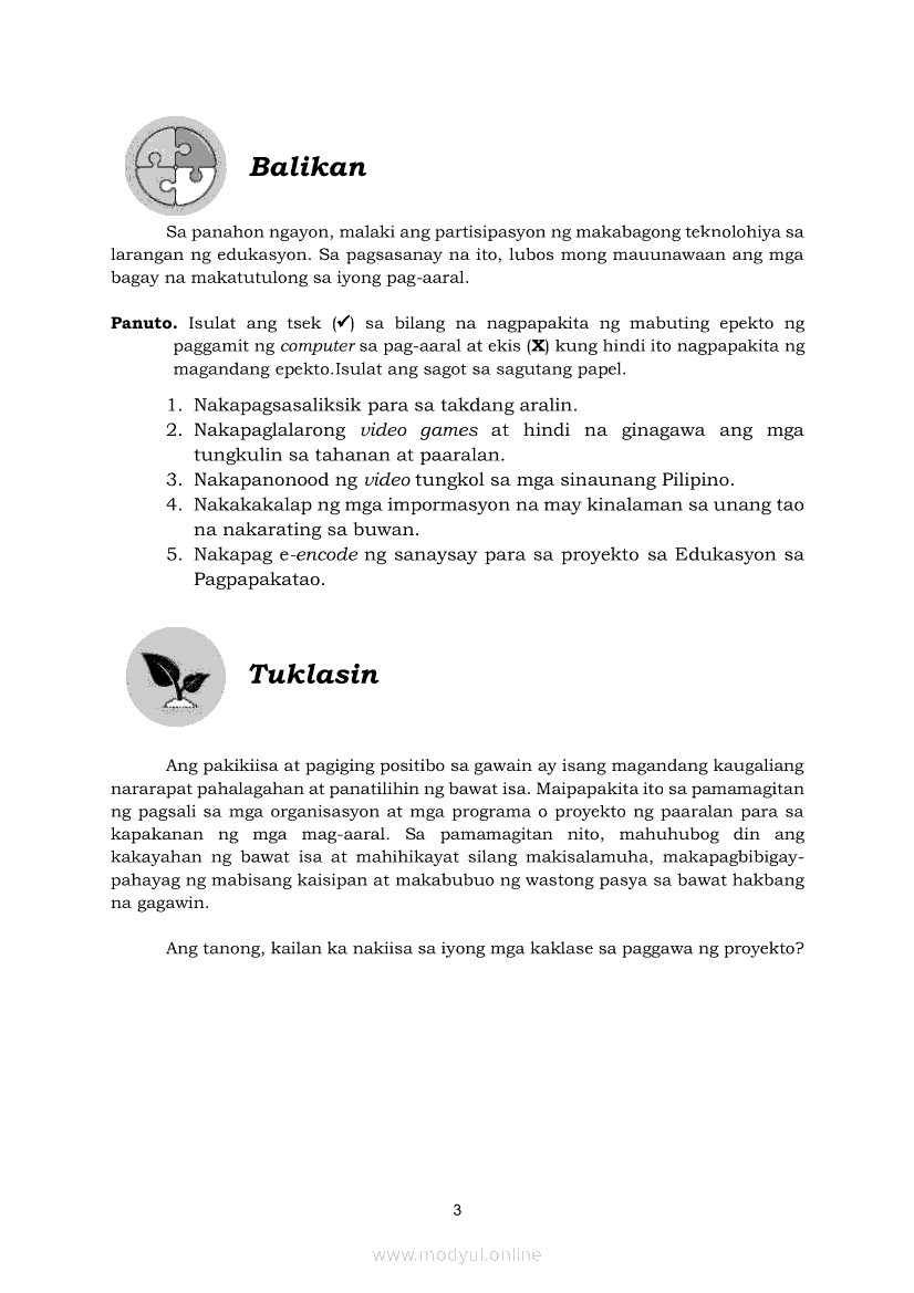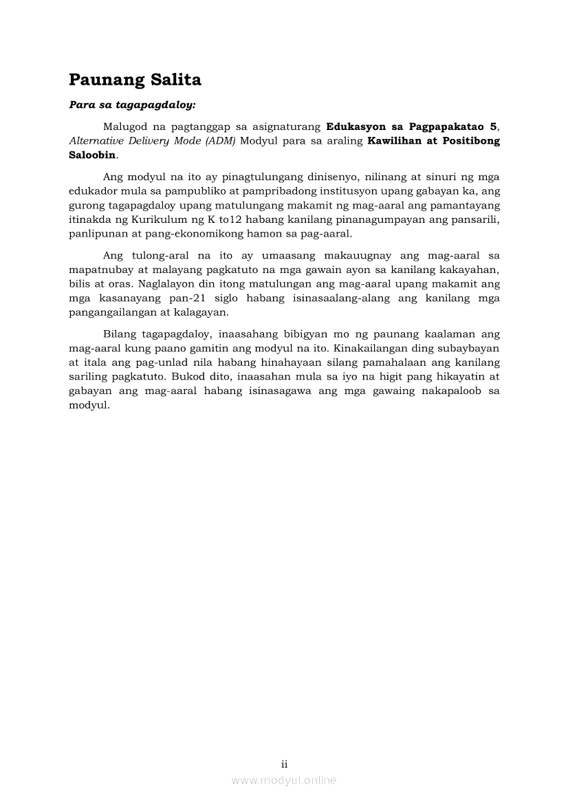 Edukasyon sa Pagpapakatao 5 Modyul 3: Kawilihan at Positibong SaloobinApr 22, 2021 Grade 5Kiumo M901 Tablet for Kids — comprehensive protection in learning, safety, and entertainment for as low as **₱2,399!. Edukasyon sa Pagpapakatao 5RelatedEdukasyon sa Pagpapakatao Ikaapat na Markahan – Modyul 1: Isinasaalang-alang Ko Ang Kapwa Ko (Linggo: Una)Edukasyon sa Pagpapakatao Ikaapat na Markahan – Modyul 2: Nananalig Ako sa Diyos (Linggo: Ikalawa)Edukasyon sa Pagpapakatao 5 Modyul para sa Ikalawang Markahan (PIVOT)Edukasyon sa Pagpapakatao 5 Modyul 5: Pagkakaisa sa Pagtatapos ng GawainEdukasyon sa Pagpapakatao 5 Modyul 4: Matapat na Paggawa sa Proyektong Pampaaralan