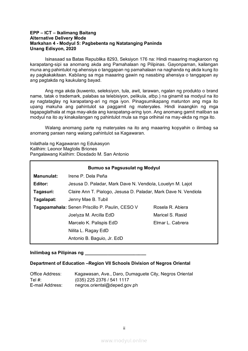 Edukasyon sa Pagpapakatao Ikaapat na Markahan – Modyul 2: Nananalig Ako sa Diyos (Linggo: Ikalawa)May 26, 2021 Grade 5Kiumo M901 Tablet for Kids — comprehensive protection in learning, safety, and entertainment for as low as **₱2,399!. Edukasyon sa Pagpapakatao 5 4th QuarterRelatedEdukasyon sa Pagpapakatao Ikaapat na Markahan – Modyul 1: Isinasaalang-alang Ko Ang Kapwa Ko (Linggo: Una)MUSIC Ikaapat na Markahan – Modyul 4a: Mga Antas ng Dynamics at TempoFilipino 5 Ikaapat na Markahan – Modyul 2 Paggamit ng Iba’t Ibang Uri ng Pangungusap sa Pagsasalaysay ng Napakinggang Balita at Pakikipagdebate Tungkol sa Isang IsyuMATHEMATICS Quarter 4 – Module 8 Analyzing and Solving Routine and Non-Routine Problems Involving Experimental ProbabilityMATHEMATICS Quarter 4: Module 4 Reading, Measuring and Solving Routine and Non-Routine Problems Involving Temperature in Real-Life Situations