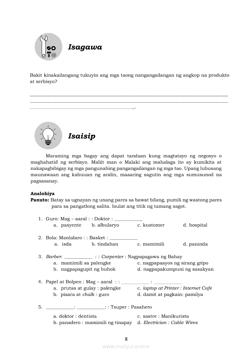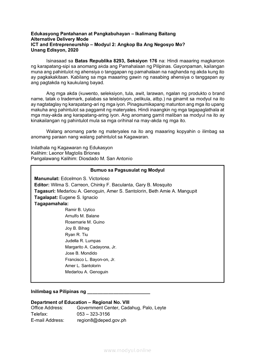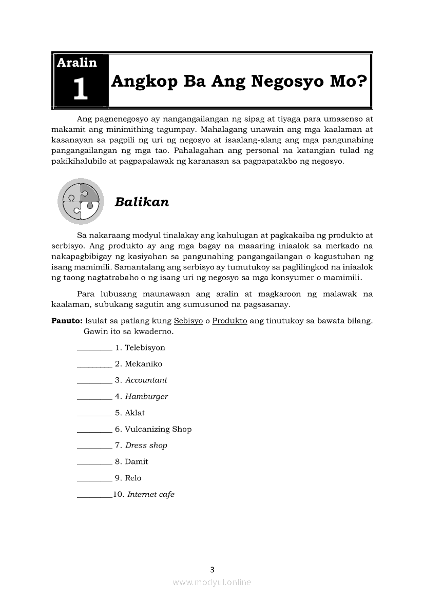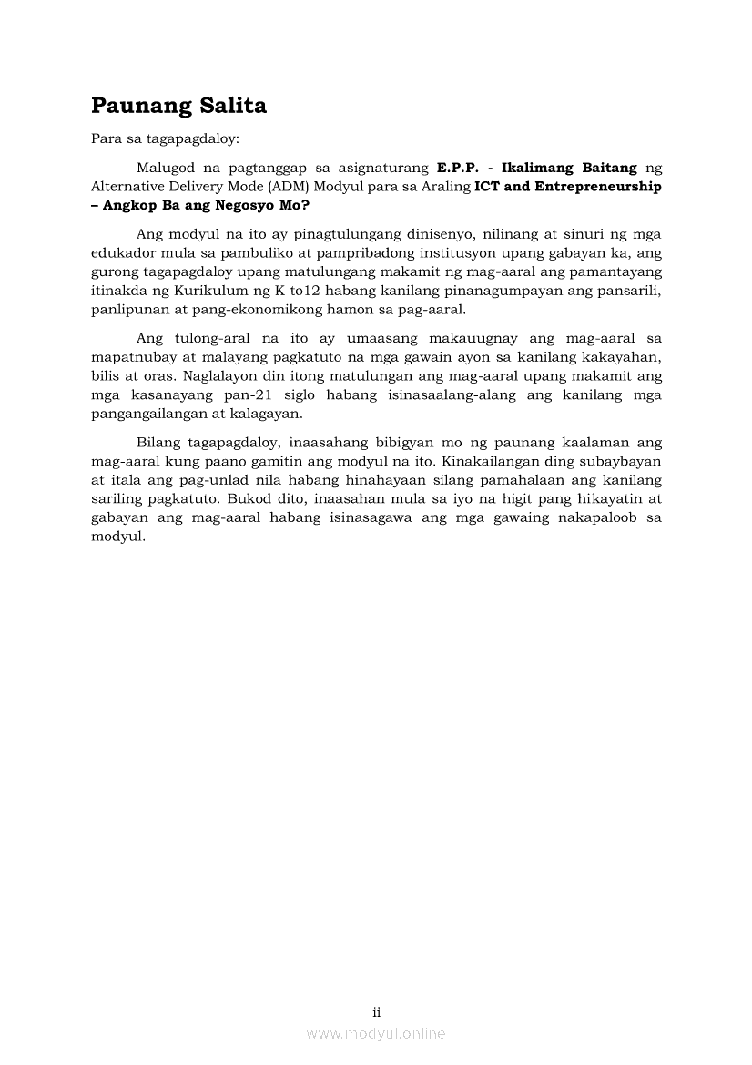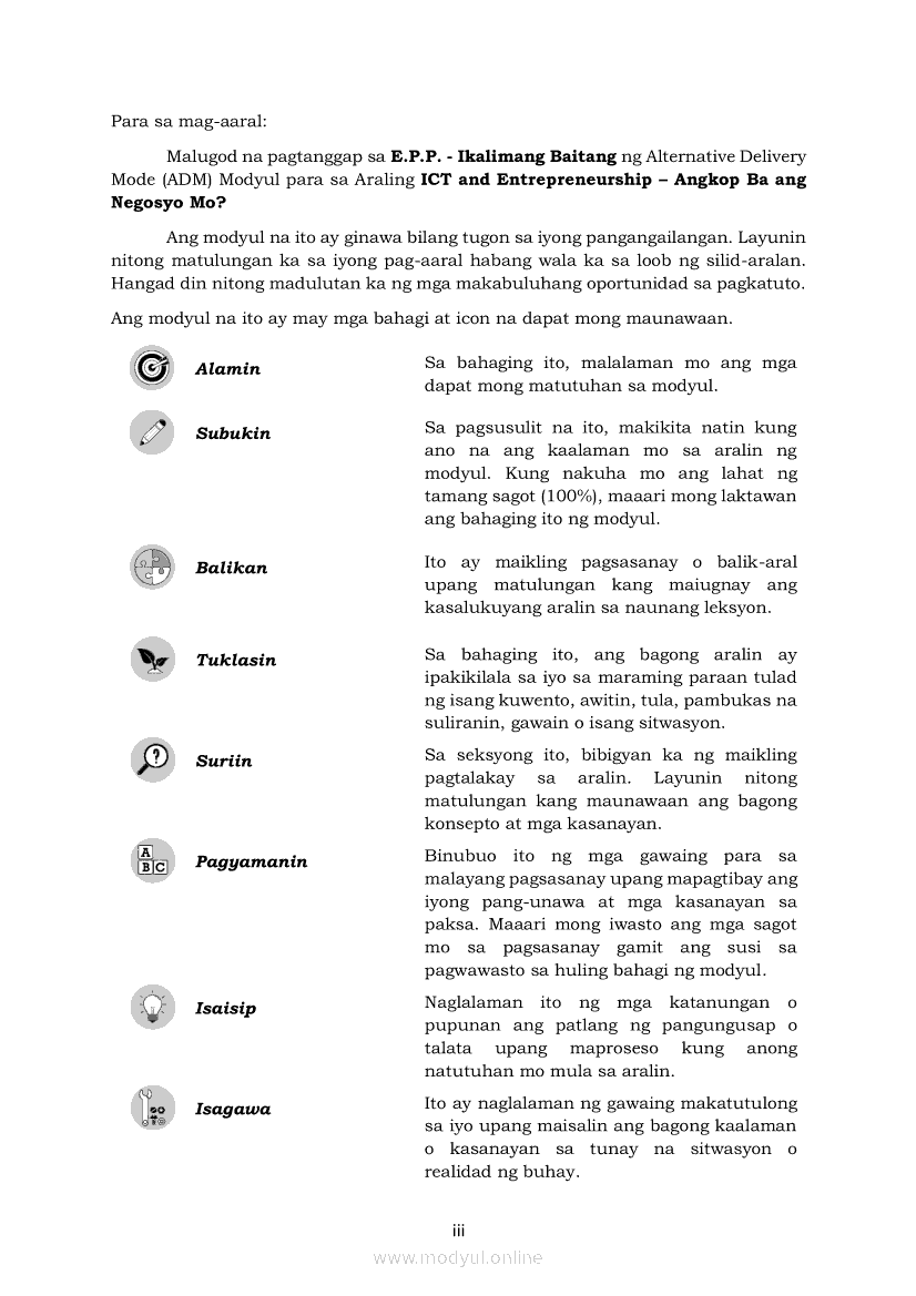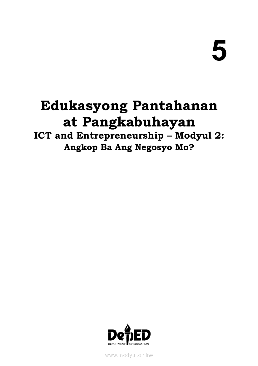 Edukasyong Pantahanan at Pangkabuhayan 5 Modyul 2: Angkop Ba Ang Negosyo Mo?Apr 22, 2021 Grade 5Kiumo M901 Tablet for Kids — comprehensive protection in learning, safety, and entertainment for as low as **₱2,399!. Edukasyong Pantahanan at Pangkabuhayan 5RelatedEPP - ICT Markahan 4 - Modyul 5: Pagbebenta ng Natatanging PanindaEPP - ICT Markahan 4 - Modyul 7: Pagsali sa Discussion Forum at Chat sa Ligtas at Responsableng PamamaraanEPP - ICT Markahan 4 - Modyul 6: Mga Panuntunan sa Pagsali sa Discussion Forum at ChatEPP - ICT Markahan 4 - Modyul 4: Mga Negosyong Maaaring Pagkakitaan sa Tahanan at PamayananEPP - ICT Markahan 4 - Modyul 1: Oportunidad na Maaaring Pagkakitaan (Produkto at Serbisyo) sa Tahanan at Pamayanan