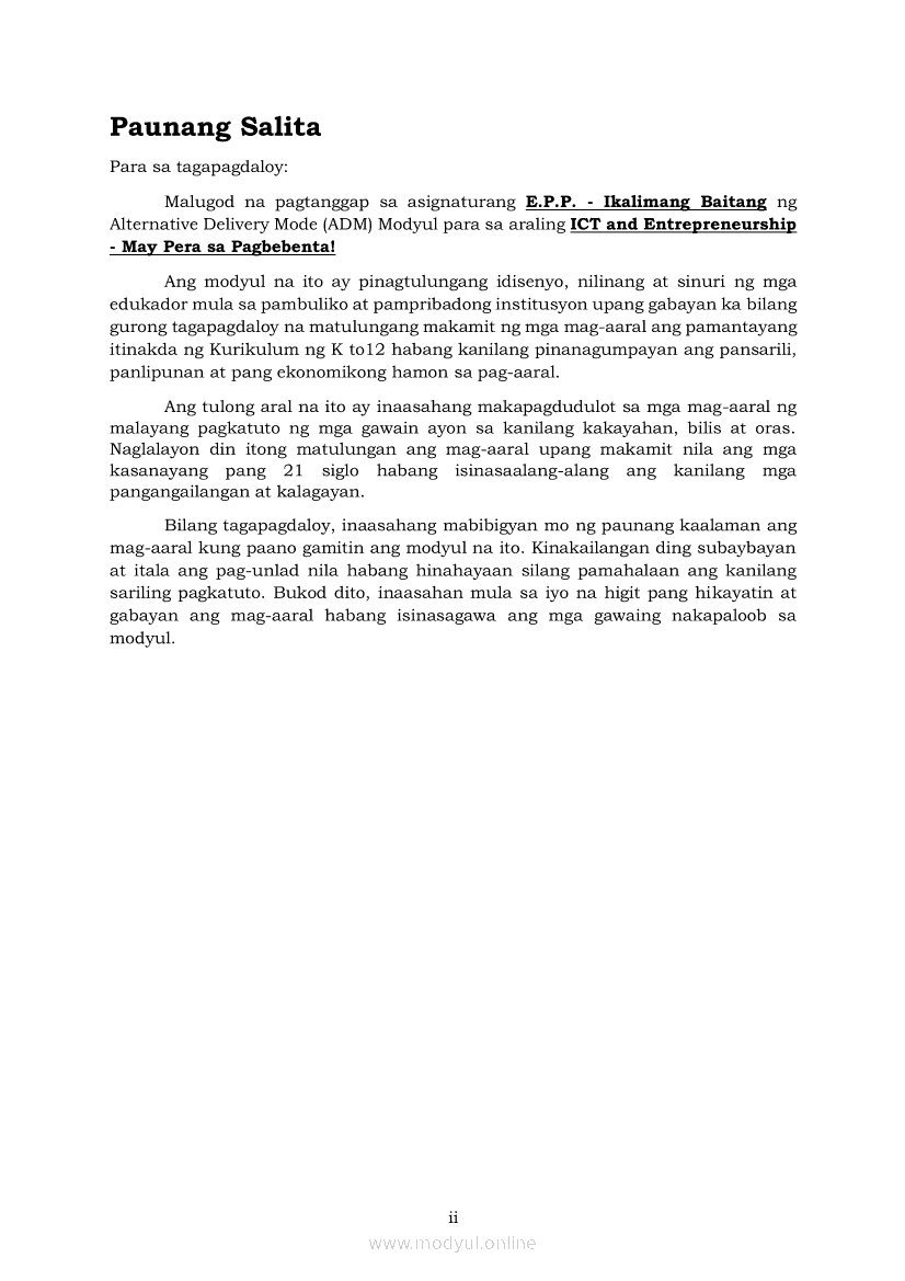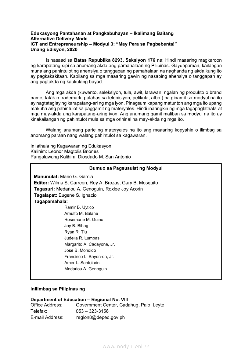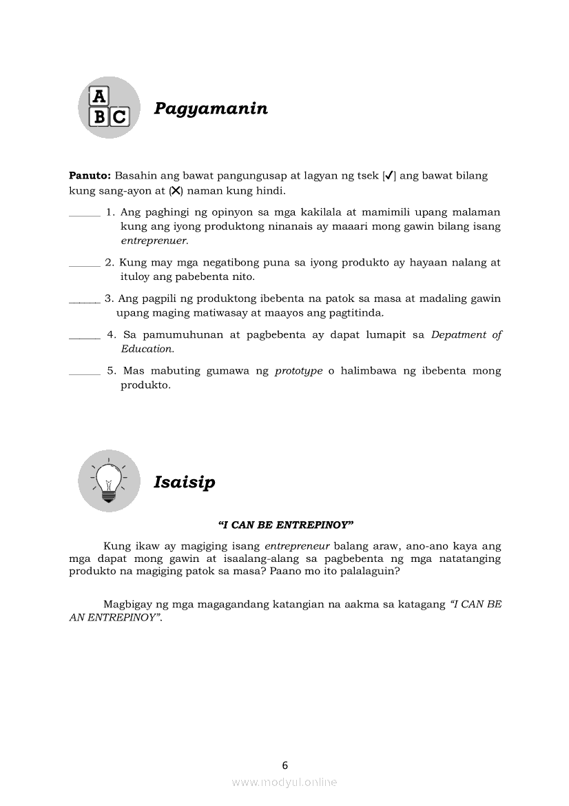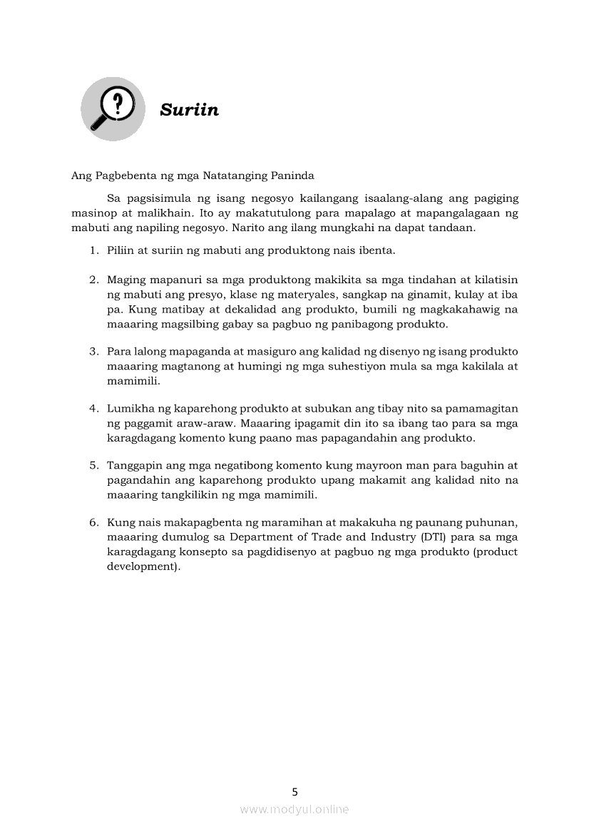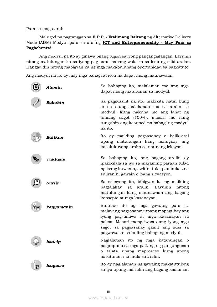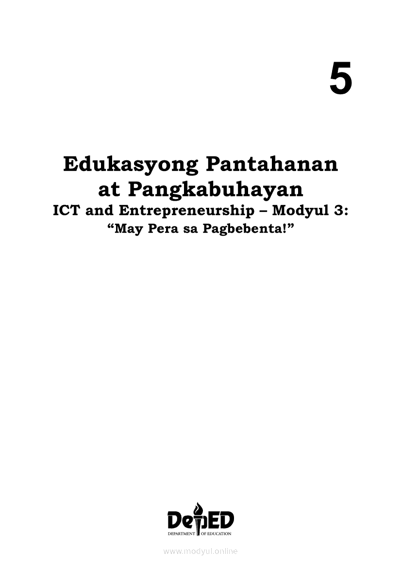 Edukasyong Pantahanan at Pangkabuhayan 5 Modyul 3: “May Pera sa Pagbebenta!”Apr 22, 2021 Grade 5Kiumo M901 Tablet for Kids — comprehensive protection in learning, safety, and entertainment for as low as **₱2,399!. Edukasyong Pantahanan at Pangkabuhayan 5RelatedEPP - ICT Markahan 4 - Modyul 3: Mga Taong Nangangailangan ng Angkop na Produkto at SerbisyoEPP - ICT Markahan 4 - Modyul 8: Pangangalap at Pagsusuri ng Impormasyon Gamit ang ICTEPP - ICT Markahan 4 - Modyul 7: Pagsali sa Discussion Forum at Chat sa Ligtas at Responsableng PamamaraanEPP - ICT Markahan 4 - Modyul 6: Mga Panuntunan sa Pagsali sa Discussion Forum at ChatEPP - ICT Markahan 4 - Modyul 2: Kahulugan at Pagkakaiba ng Produkto at Serbisyo