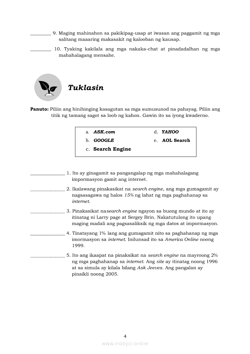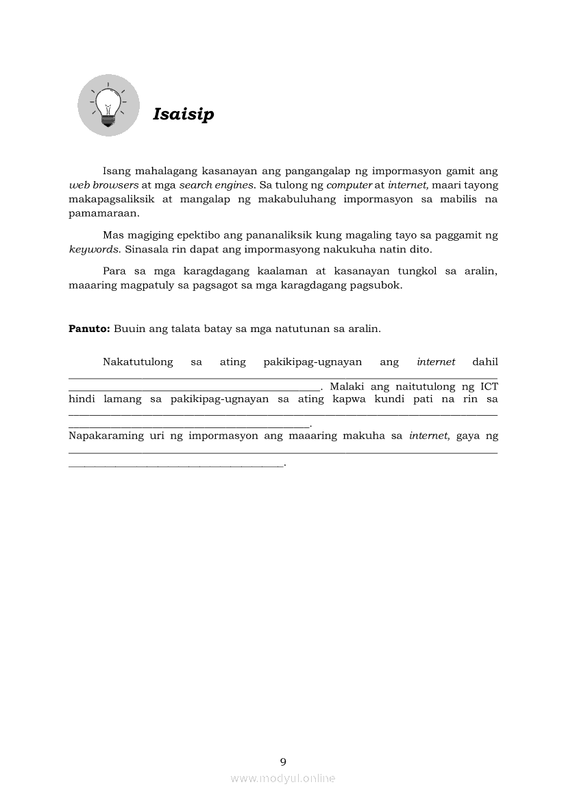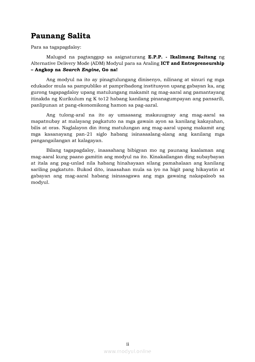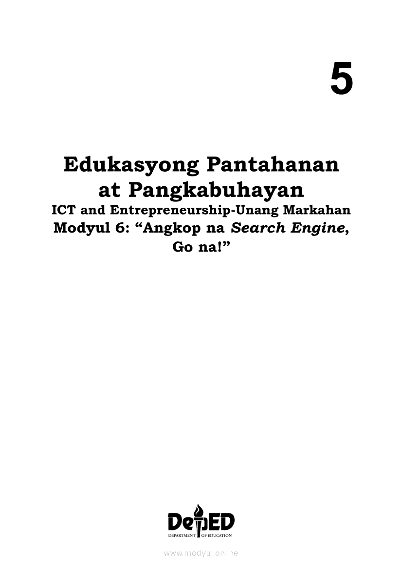 Edukasyong Pantahanan at Pangkabuhayan 5 Modyul 6: “Angkop na Search Engine, Go na!”Apr 22, 2021 Grade 5Kiumo M901 Tablet for Kids — comprehensive protection in learning, safety, and entertainment for as low as **₱2,399!. Edukasyong Pantahanan at Pangkabuhayan 5RelatedEPP - ICT Markahan 4 - Modyul 2: Kahulugan at Pagkakaiba ng Produkto at SerbisyoEPP - ICT Markahan 4 - Modyul 4: Mga Negosyong Maaaring Pagkakitaan sa Tahanan at PamayananEPP - ICT Markahan 4 - Modyul 7: Pagsali sa Discussion Forum at Chat sa Ligtas at Responsableng PamamaraanEPP - ICT Markahan 4 - Modyul 5: Pagbebenta ng Natatanging PanindaEPP - ICT Markahan 4 - Modyul 8: Pangangalap at Pagsusuri ng Impormasyon Gamit ang ICT