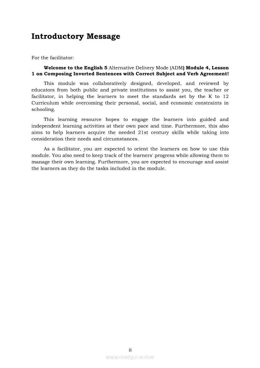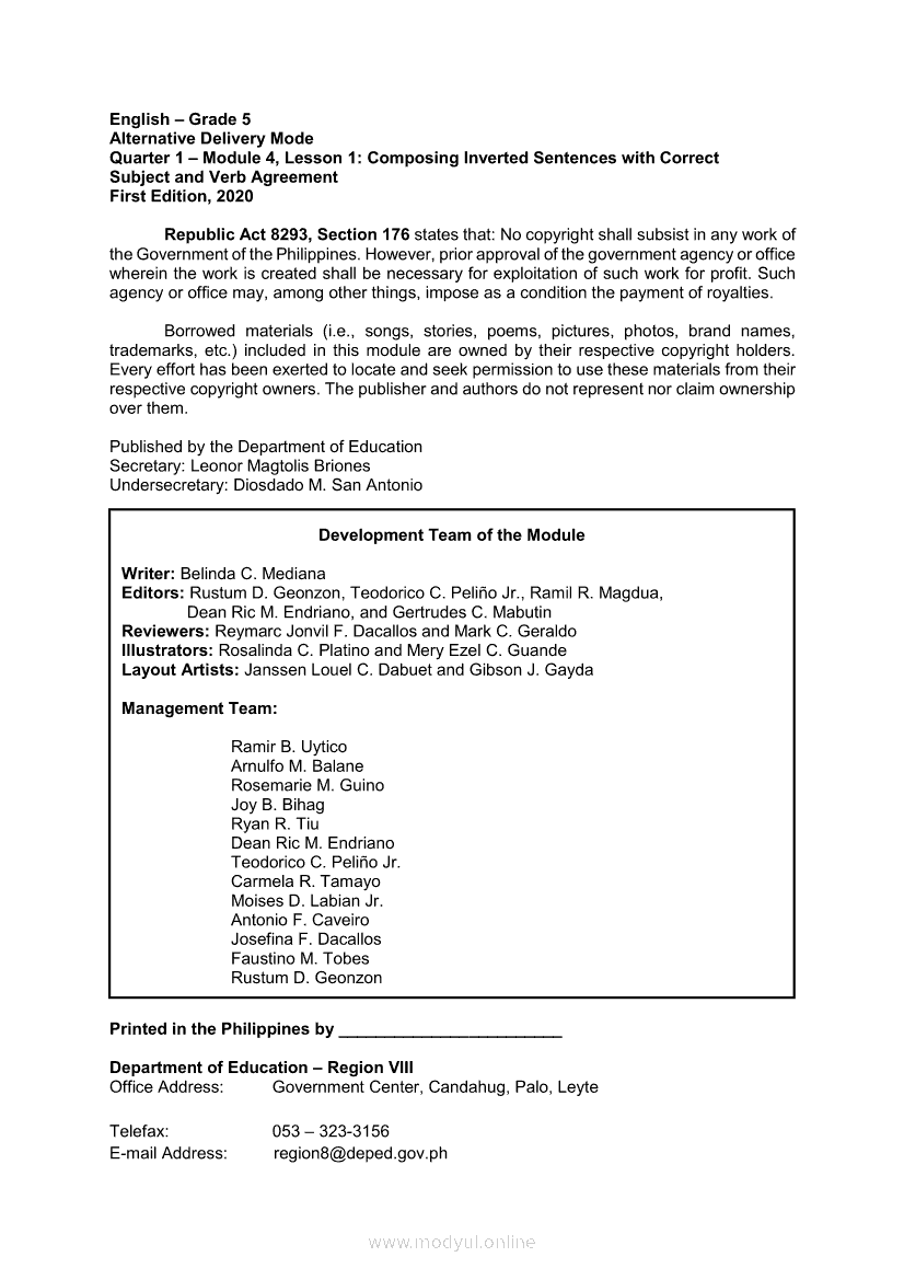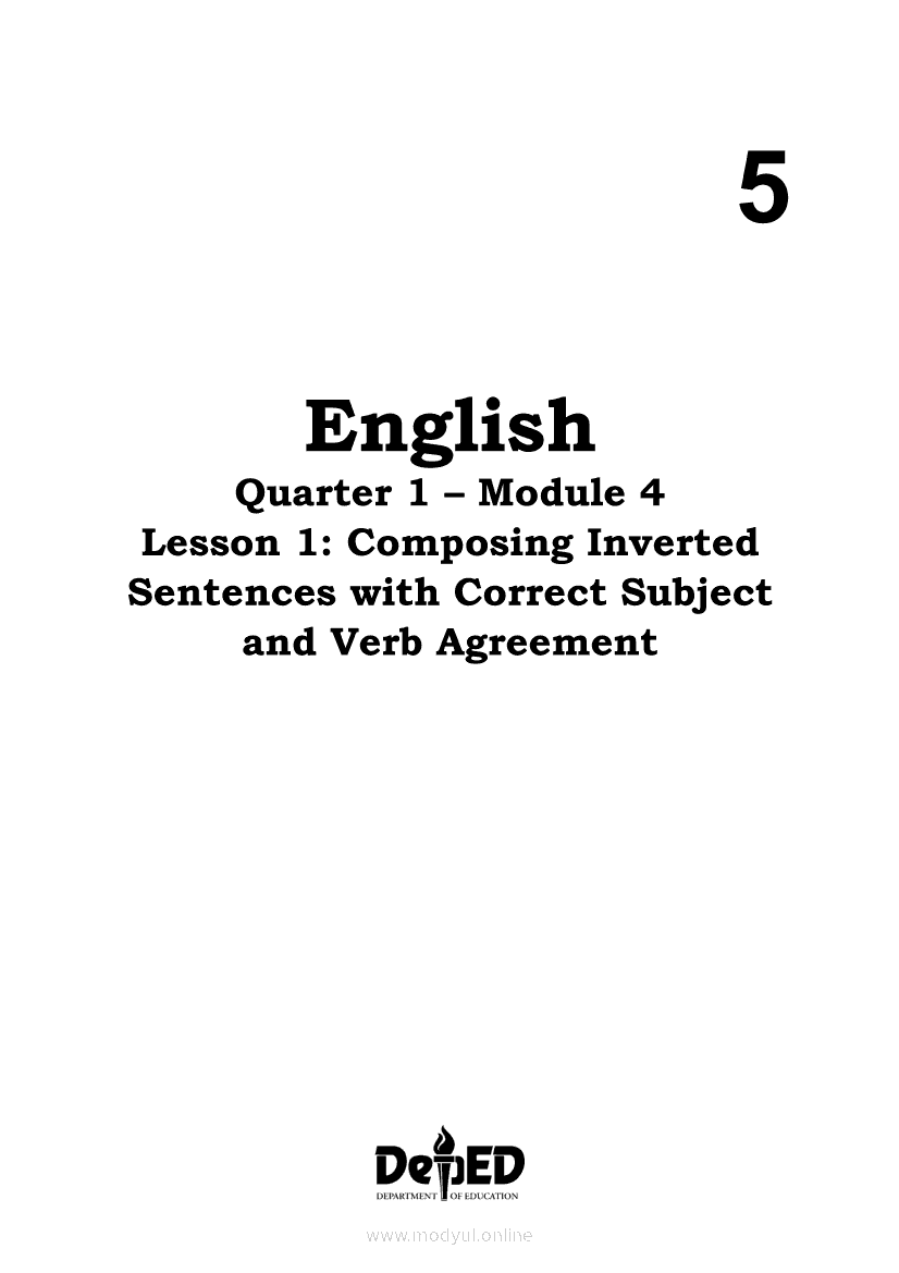 English 5 Module 4 Lesson 1: Composing Inverted Sentences with Correct Subject and Verb AgreementApr 22, 2021 Grade 5Kiumo M901 Tablet for Kids — comprehensive protection in learning, safety, and entertainment for as low as **₱2,399!. English 5RelatedEnglish Quarter 4 – Module 3: Writing a Paragraph Showing Problem-Solution RelationshipEnglish 5 Module 2 Lesson 2: Inferring the Meaning of Words with Affixes Using Context CluesEnglish 5 Module 2 Lesson 3: Inferring the Meaning of Blended Words Using Context CluesEnglish 5 Module 2 Lesson 1: Inferring the Meaning of Compound Words Using Context CluesEnglish 5 Module 4 Lesson 3: Composing Clear and Coherent Sentences Using Coordinating and Subordinating Conjunctions