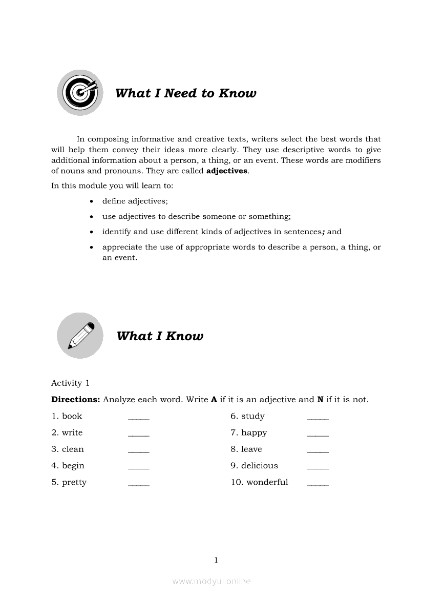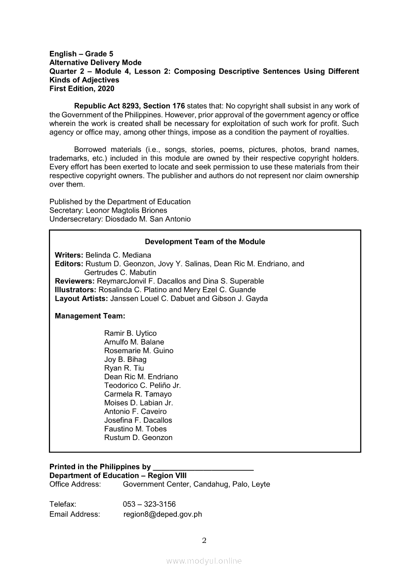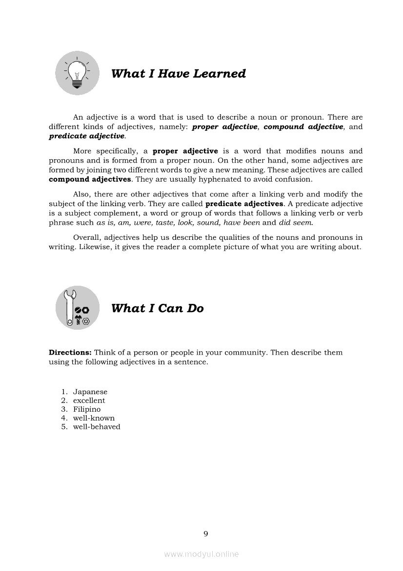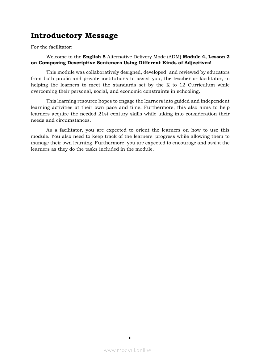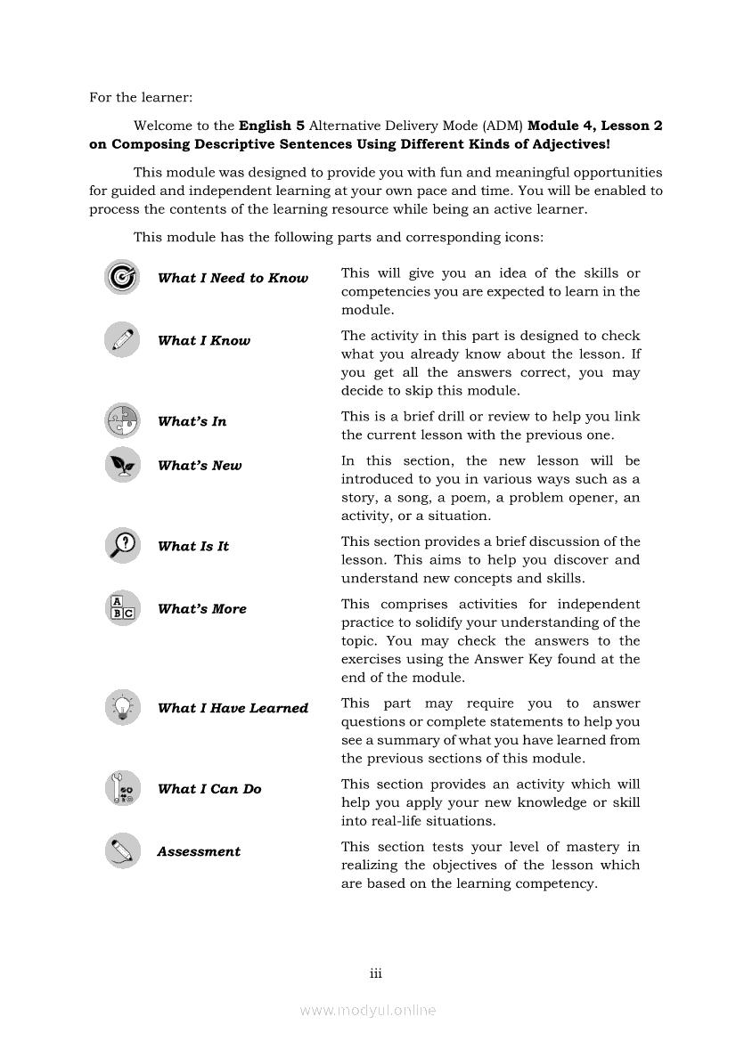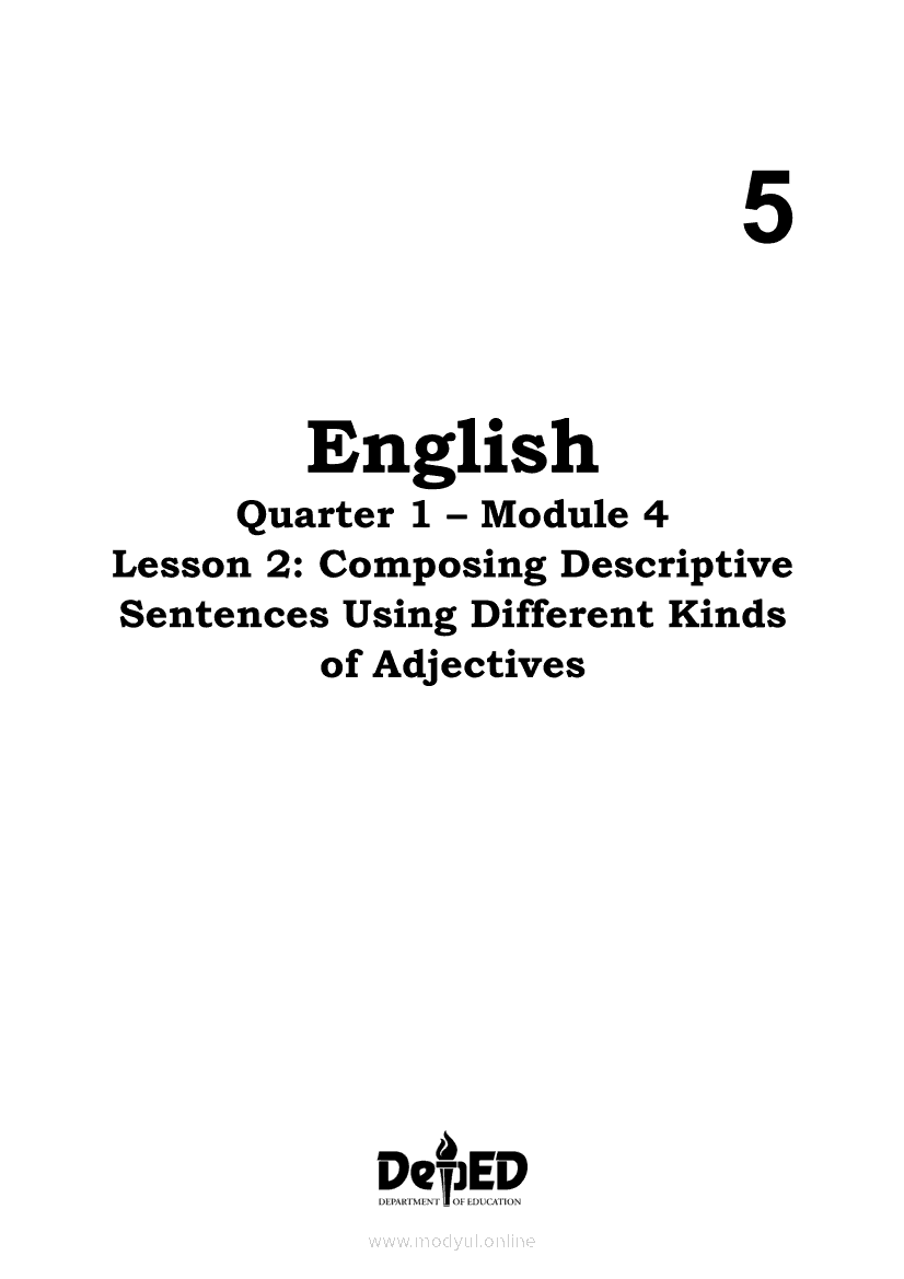 English 5 Module 4 Lesson 2: Composing Descriptive Sentences Using Different Kinds of AdjectivesApr 22, 2021 Grade 5Kiumo M901 Tablet for Kids — comprehensive protection in learning, safety, and entertainment for as low as **₱2,399!. English 5RelatedEnglish Quarter 4 – Module 3: Writing a Paragraph Showing Problem-Solution RelationshipEnglish 5 Second Quarter Module (PIVOT)English 5 Module 2 Lesson 1: Inferring the Meaning of Compound Words Using Context CluesEnglish 5 Module 2 Lesson 4: Inferring the Meaning of Clipped Words Using Context CluesEnglish 5 Module 1: Filling out Forms Accurately