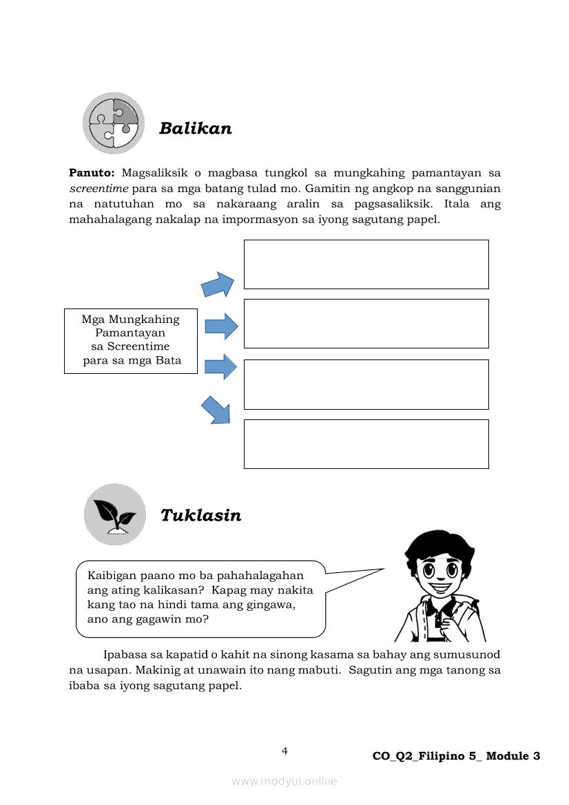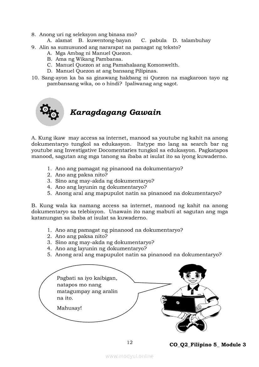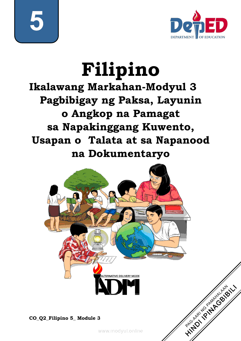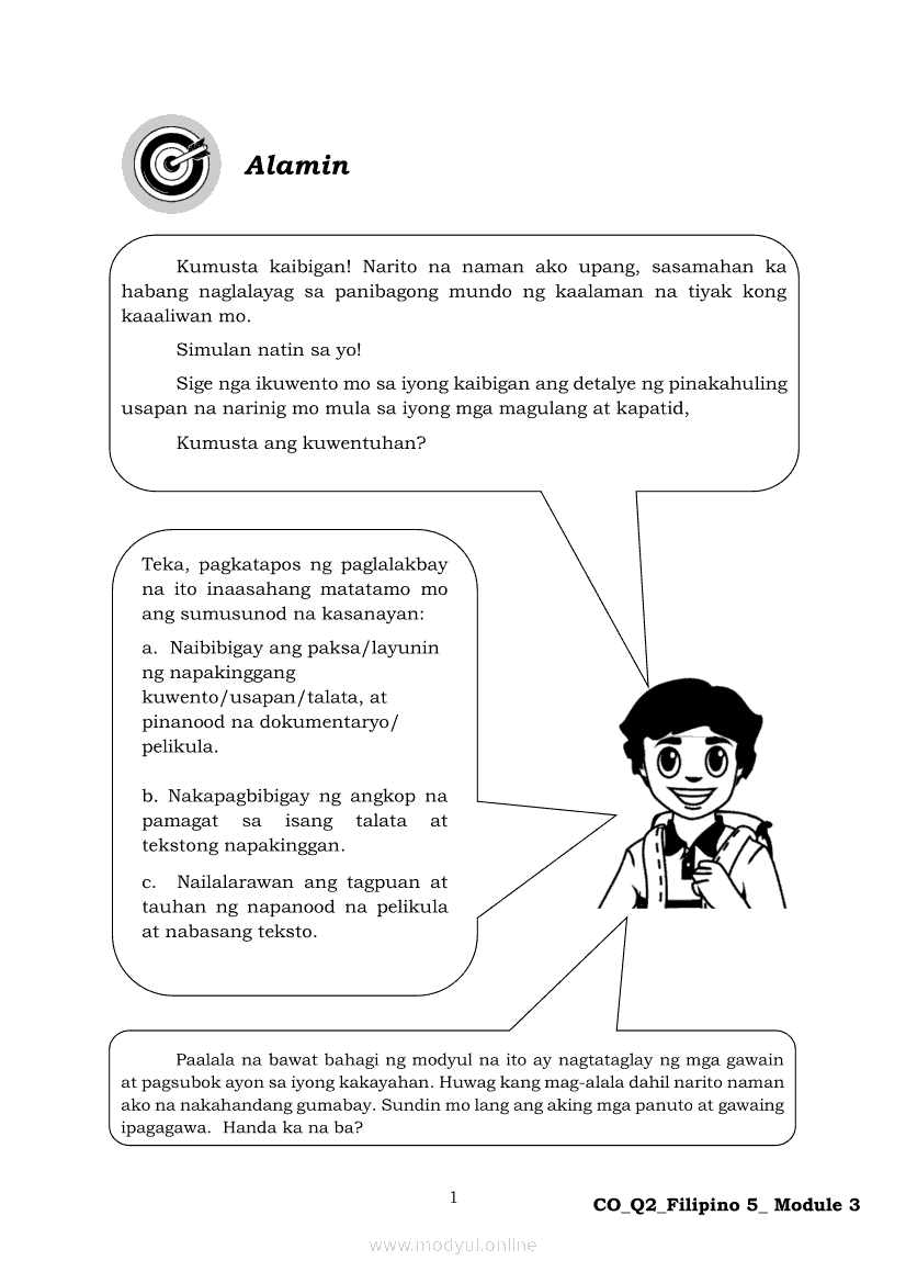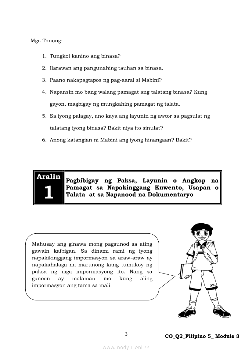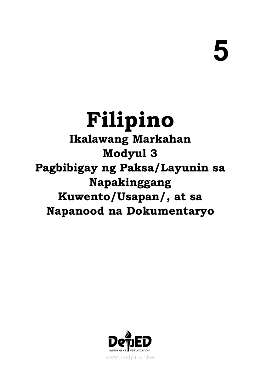 Filipino 5 Ikalawang Markahan-Modyul 3 Pagbibigay ng Paksa, Layunin o Angkop na Pamagat sa Napakinggang Kuwento, Usapan o Talata at sa Napanood na DokumentaryoApr 22, 2021 Grade 5Kiumo M901 Tablet for Kids — comprehensive protection in learning, safety, and entertainment for as low as **₱2,399!. Filipino 5RelatedFilipino 5 Ikaapat na Markahan – Modyul 1 Paggawa ng Dayagram ng Ugnayang Sanhi at Bunga Mula sa Tekstong Napakinggan o NabasaFilipino 5 Ikaapat na Markahan – Modyul 2 Paggamit ng Iba’t Ibang Uri ng Pangungusap sa Pagsasalaysay ng Napakinggang Balita at Pakikipagdebate Tungkol sa Isang IsyuFilipino 5 Modyul 4: Pagsulat ng Isang Maikling Tula, Talatang Nagsasalaysay at TalambuhayFilipino 5 Ikalawang Markahan – Modyul 1: Pagbibigay ng Mahahalagang Pangyayari/Pagsagot sa Nabasang Talaarawan, Journal, Talambuhay at AnekdotaFilipino 5 Modyul 1: Pag-uugnay ng Sariling Karanasan sa Napakinggang Teksto