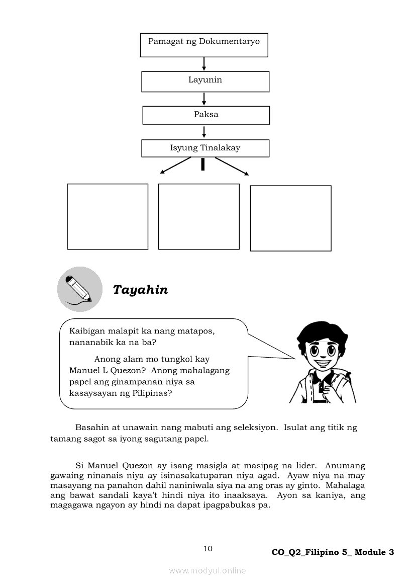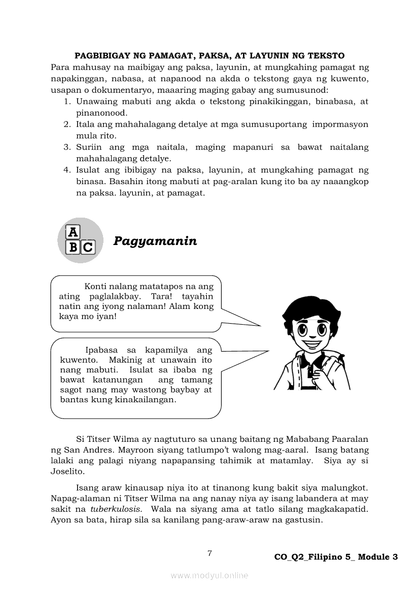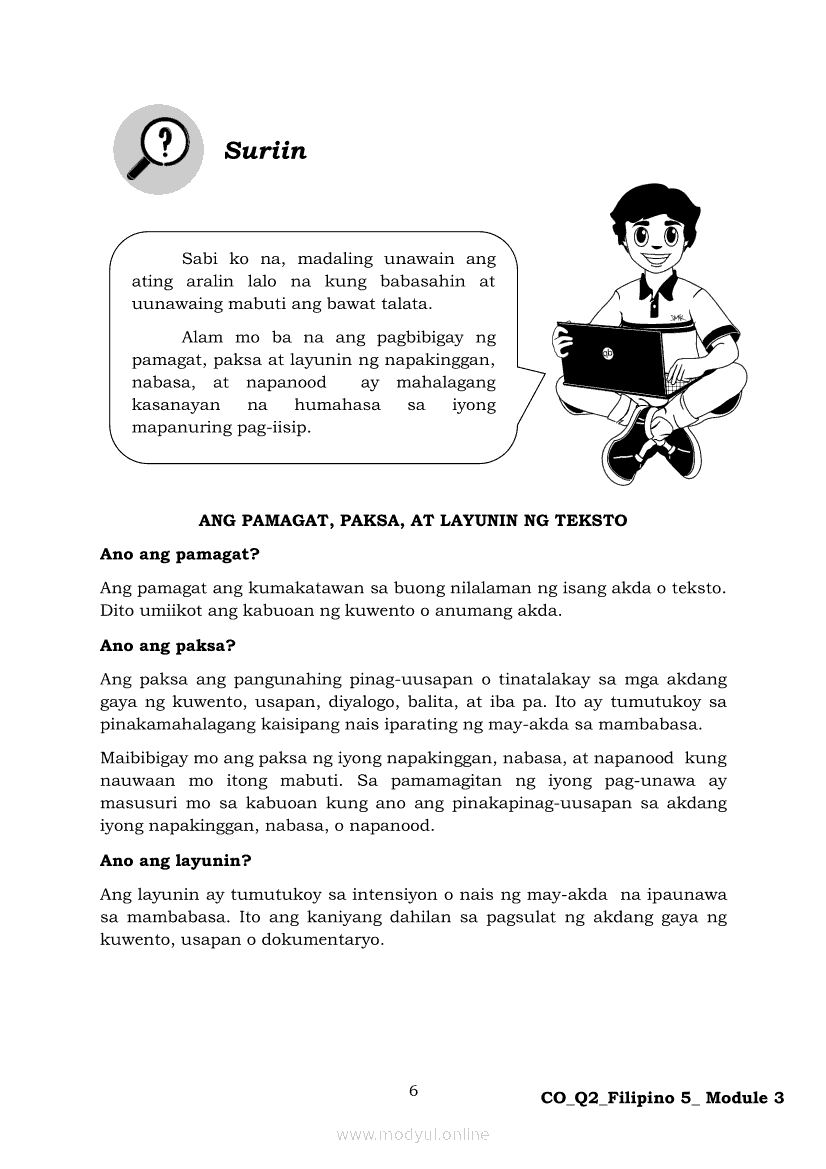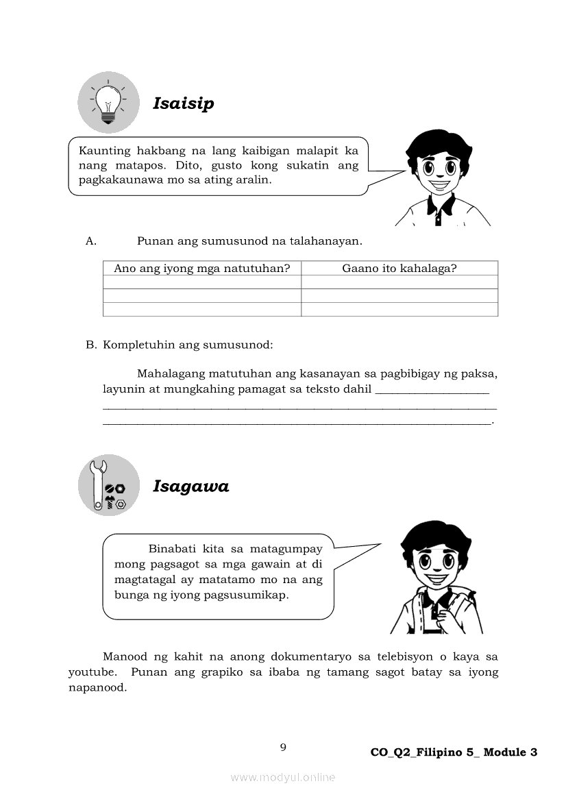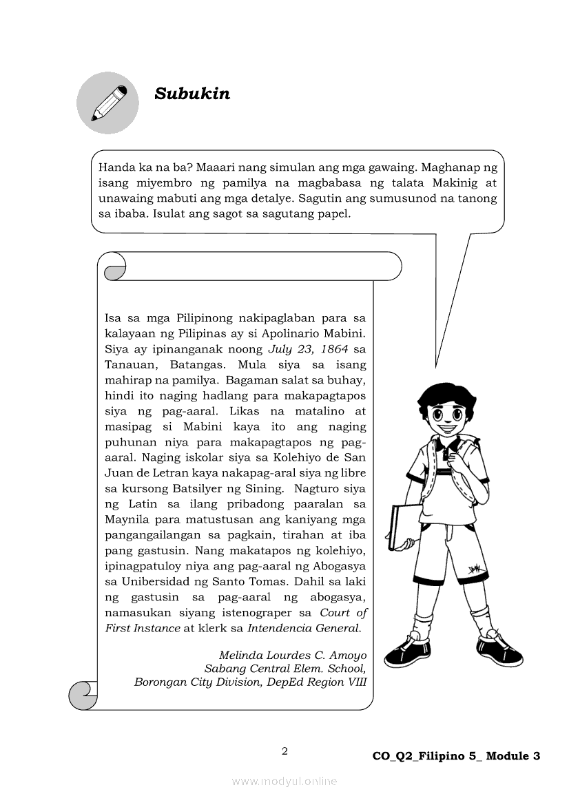 Filipino 5 Ikalawang Markahan-Modyul 3 Pagbibigay ng Paksa, Layunin o Angkop na Pamagat sa Napakinggang Kuwento, Usapan o Talata at sa Napanood na DokumentaryoApr 22, 2021 Grade 5Kiumo M901 Tablet for Kids — comprehensive protection in learning, safety, and entertainment for as low as **₱2,399!. Filipino 5RelatedFilipino 5 Ikaapat na Markahan – Modyul 1 Paggawa ng Dayagram ng Ugnayang Sanhi at Bunga Mula sa Tekstong Napakinggan o NabasaFilipino 5 Ikaapat na Markahan – Modyul 2 Paggamit ng Iba’t Ibang Uri ng Pangungusap sa Pagsasalaysay ng Napakinggang Balita at Pakikipagdebate Tungkol sa Isang IsyuFilipino 5 Modyul 4: Pagsulat ng Isang Maikling Tula, Talatang Nagsasalaysay at TalambuhayFilipino 5 Ikalawang Markahan – Modyul 1: Pagbibigay ng Mahahalagang Pangyayari/Pagsagot sa Nabasang Talaarawan, Journal, Talambuhay at AnekdotaFilipino 5 Modyul 1: Pag-uugnay ng Sariling Karanasan sa Napakinggang Teksto