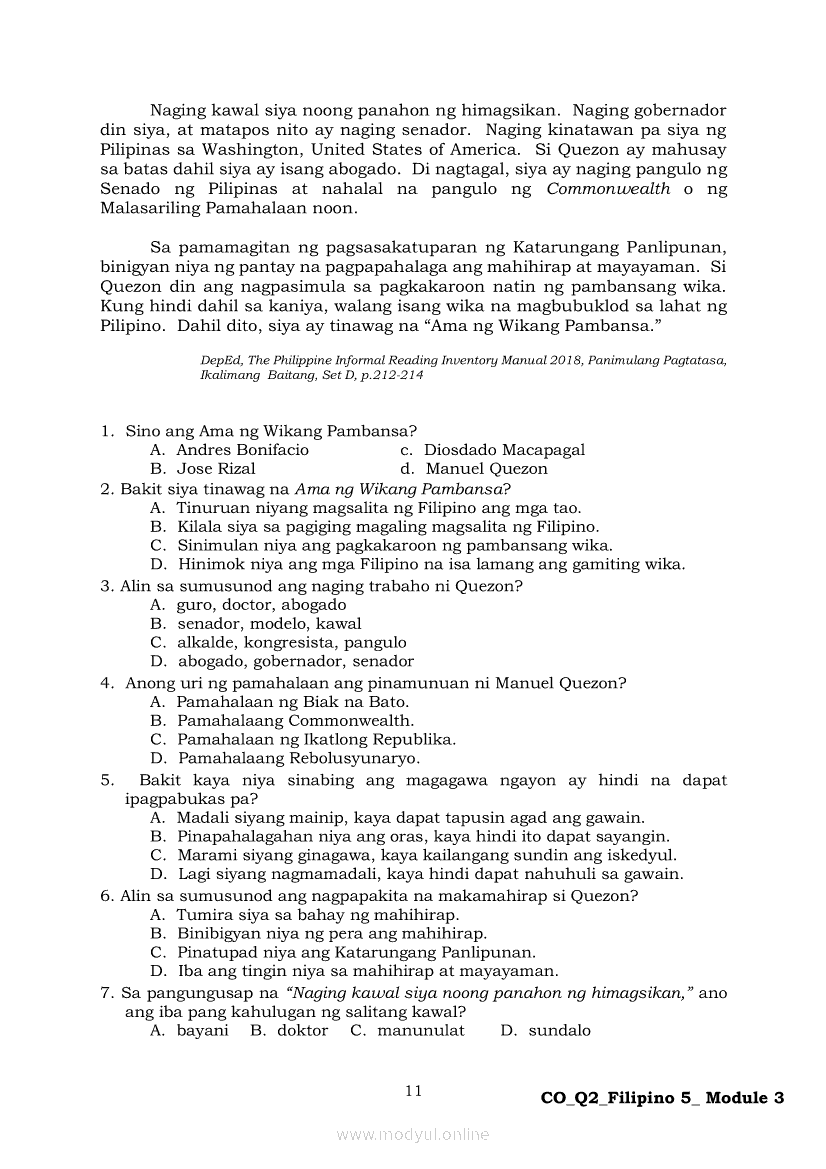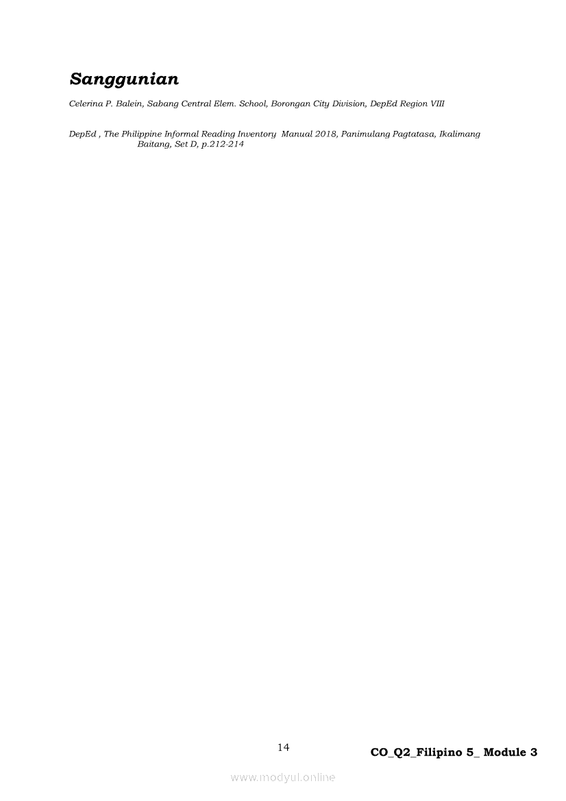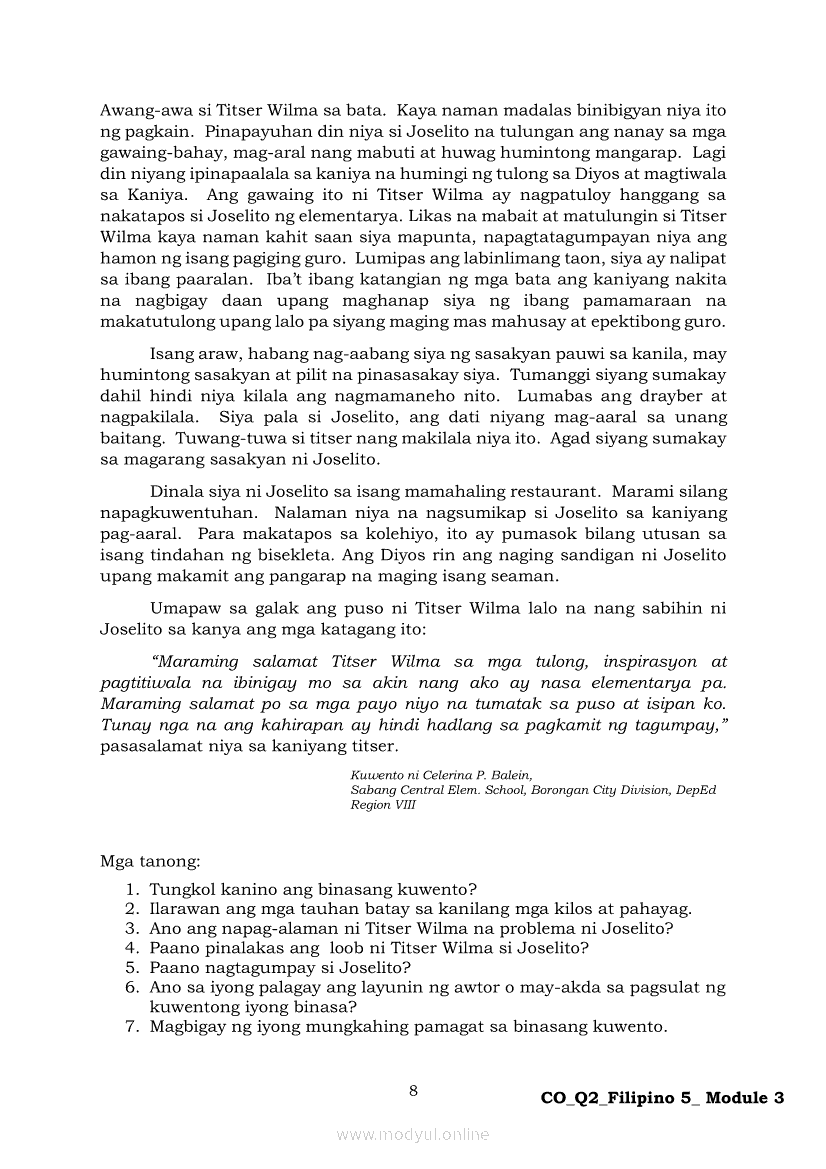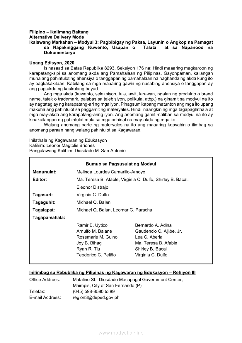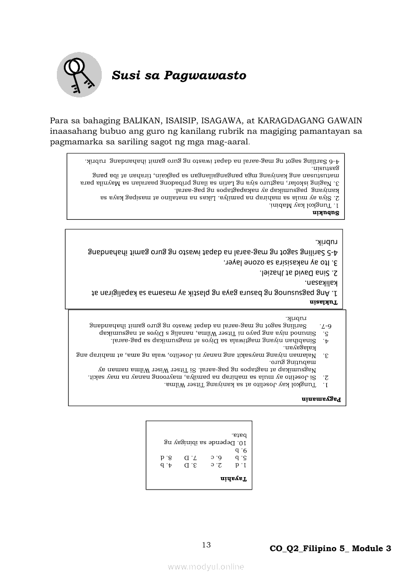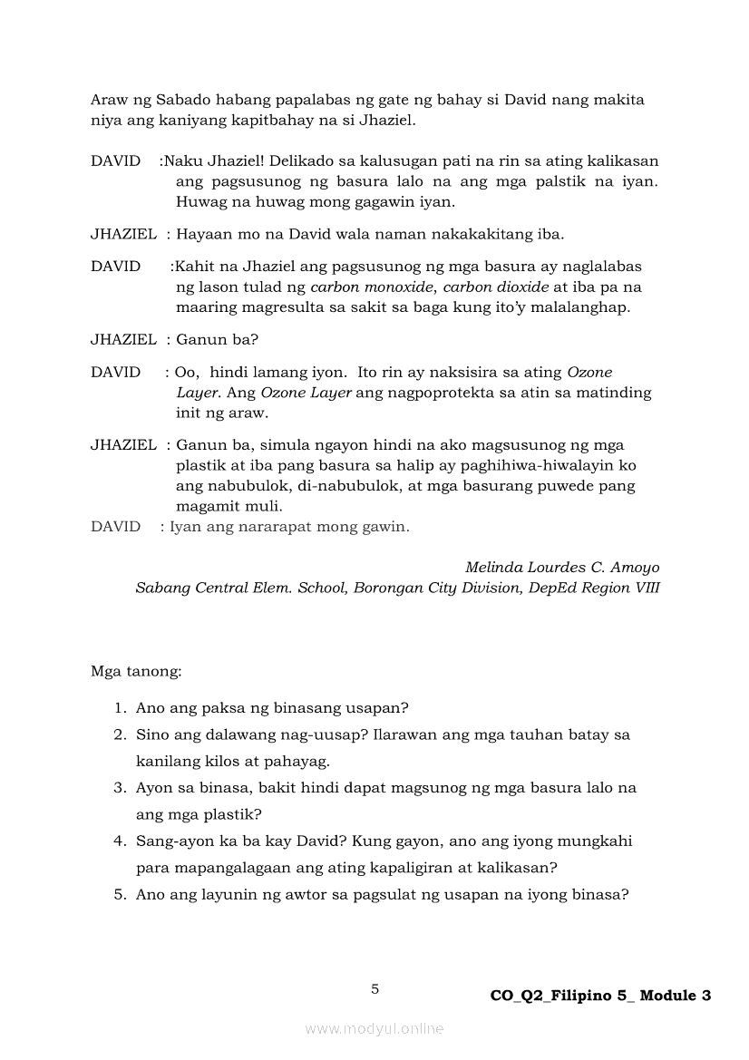 Filipino 5 Ikalawang Markahan-Modyul 3 Pagbibigay ng Paksa, Layunin o Angkop na Pamagat sa Napakinggang Kuwento, Usapan o Talata at sa Napanood na DokumentaryoApr 22, 2021 Grade 5Kiumo M901 Tablet for Kids — comprehensive protection in learning, safety, and entertainment for as low as **₱2,399!. Filipino 5RelatedFilipino 5 Ikaapat na Markahan – Modyul 1 Paggawa ng Dayagram ng Ugnayang Sanhi at Bunga Mula sa Tekstong Napakinggan o NabasaFilipino 5 Ikaapat na Markahan – Modyul 2 Paggamit ng Iba’t Ibang Uri ng Pangungusap sa Pagsasalaysay ng Napakinggang Balita at Pakikipagdebate Tungkol sa Isang IsyuFilipino 5 Modyul 4: Pagsulat ng Isang Maikling Tula, Talatang Nagsasalaysay at TalambuhayFilipino 5 Ikalawang Markahan – Modyul 1: Pagbibigay ng Mahahalagang Pangyayari/Pagsagot sa Nabasang Talaarawan, Journal, Talambuhay at AnekdotaFilipino 5 Modyul 1: Pag-uugnay ng Sariling Karanasan sa Napakinggang Teksto