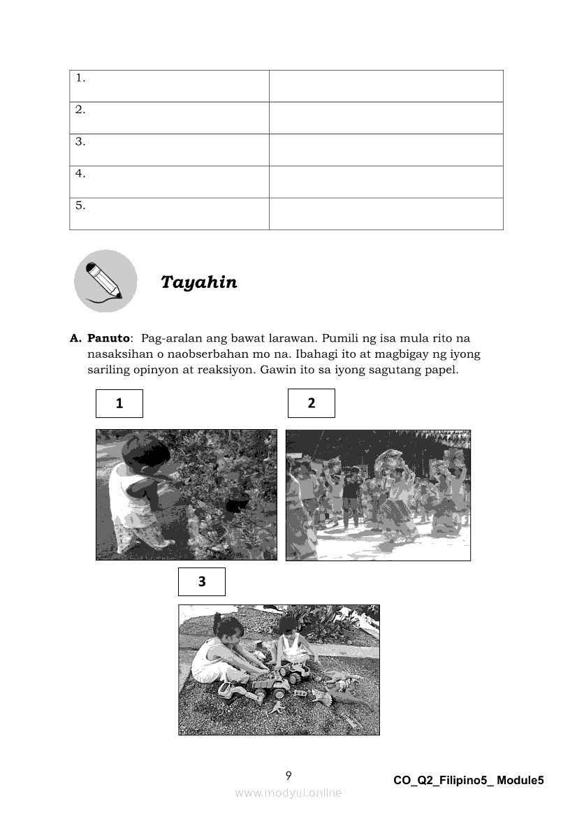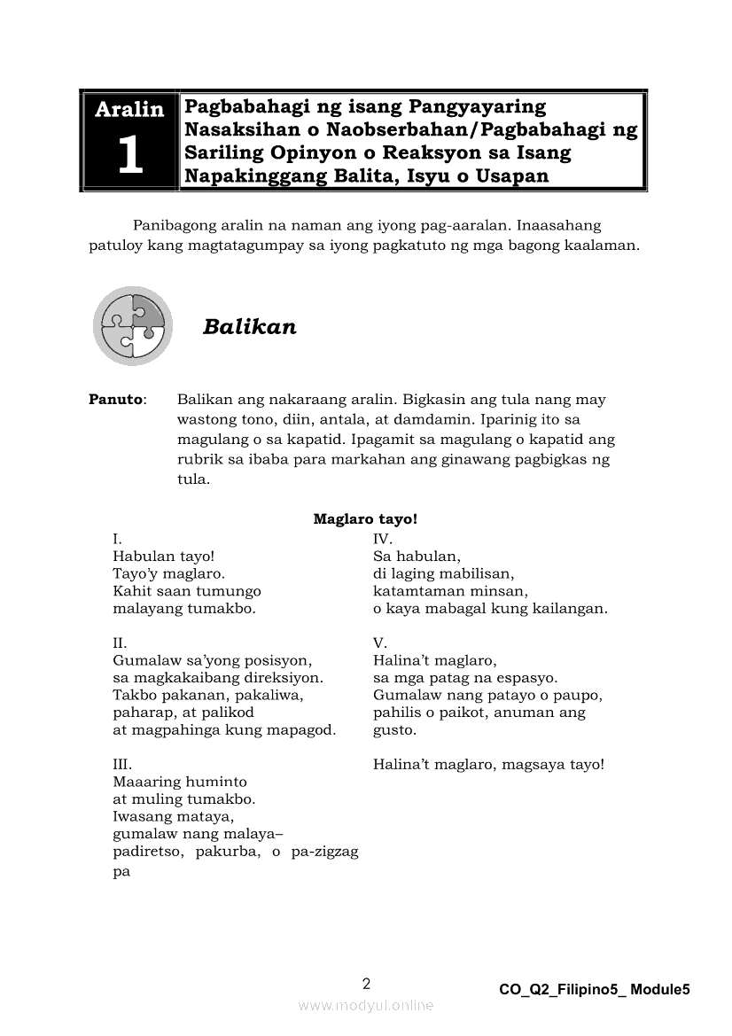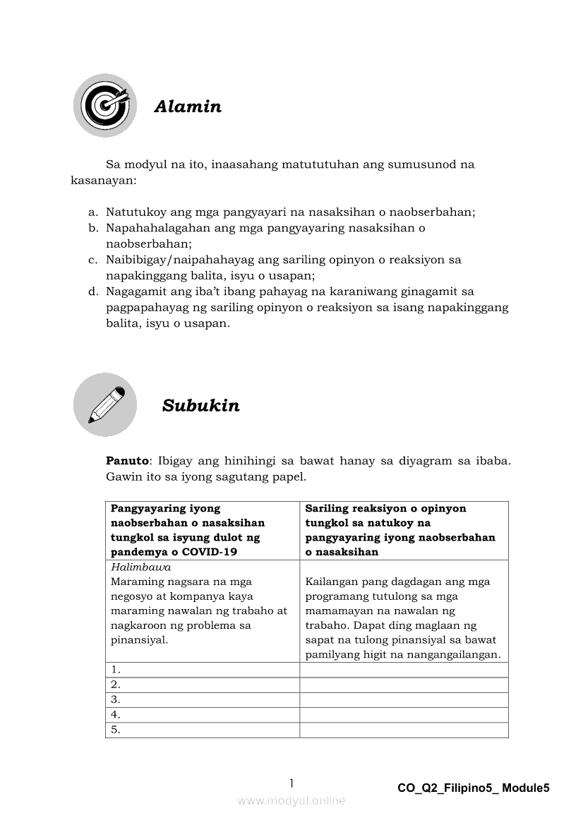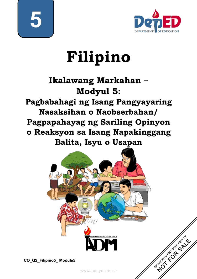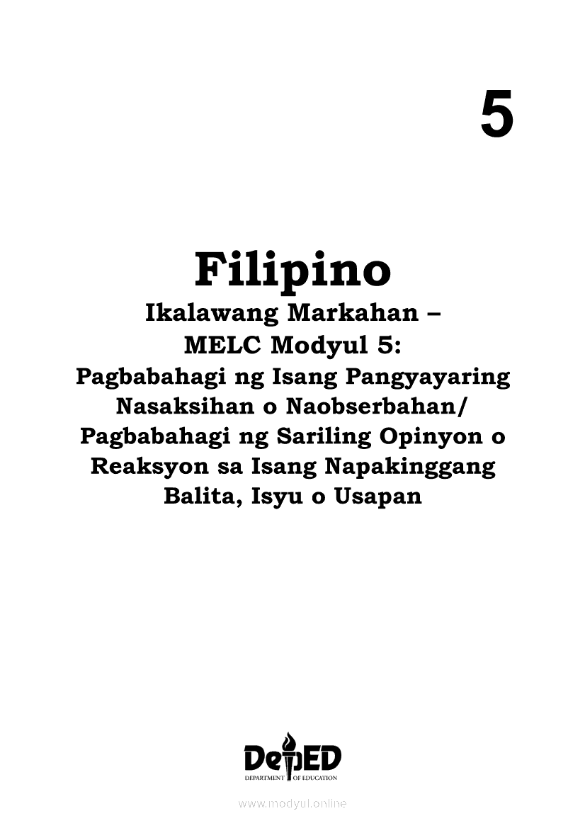 Filipino 5 Ikalawang Markahan – Modyul 5: Pagbabahagi ng Isang Pangyayaring Nasaksihan o Naobserbahan/ Pagpapahayag ng Sariling Opinyon o Reaksyon sa Isang Napakinggang Balita, Isyu o UsapanApr 22, 2021 Grade 5Kiumo M901 Tablet for Kids — comprehensive protection in learning, safety, and entertainment for as low as **₱2,399!. Filipino 5RelatedFilipino 5 Ikaapat na Markahan – Modyul 1 Paggawa ng Dayagram ng Ugnayang Sanhi at Bunga Mula sa Tekstong Napakinggan o NabasaFilipino 5 Ikaapat na Markahan – Modyul 2 Paggamit ng Iba’t Ibang Uri ng Pangungusap sa Pagsasalaysay ng Napakinggang Balita at Pakikipagdebate Tungkol sa Isang IsyuFilipino 5 Ikalawang Markahan-Modyul 3 Pagbibigay ng Paksa, Layunin o Angkop na Pamagat sa Napakinggang Kuwento, Usapan o Talata at sa Napanood na DokumentaryoFilipino 5 Ikalawang Markahan-Modyul 4 Pagbigkas nang may Wastong Tono, Diin, Antala at Damdamin sa Napakinggang TulaFilipino 5 Modyul 9: Pagbibigay Kahulugan ng Pamilyar at Di-Pamilyar na mga Salita