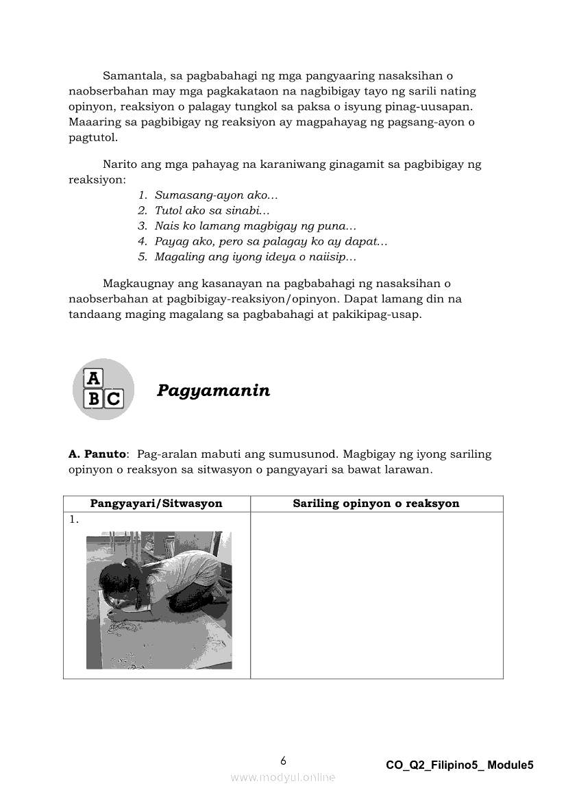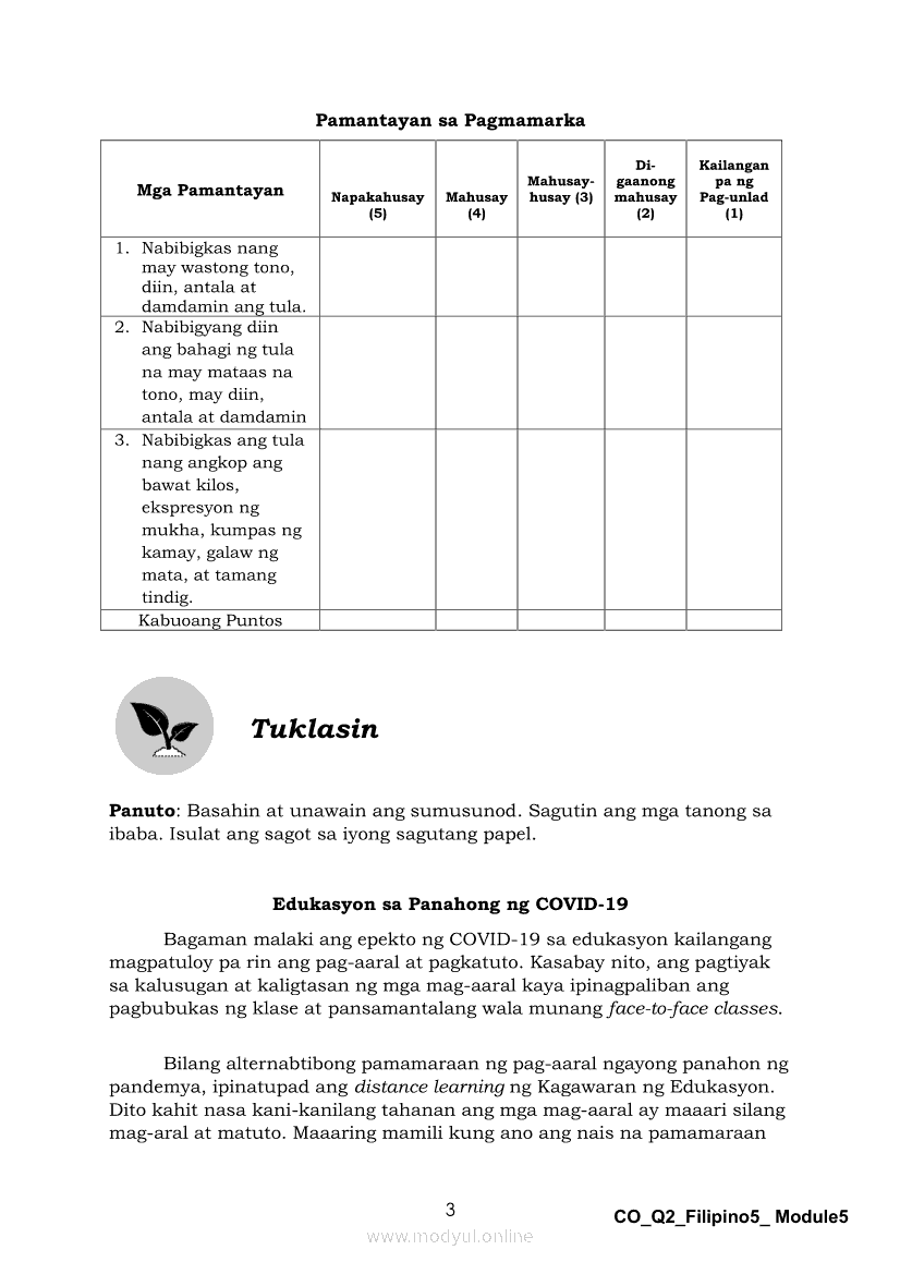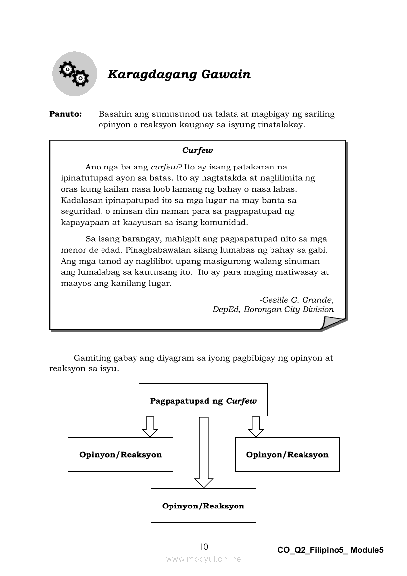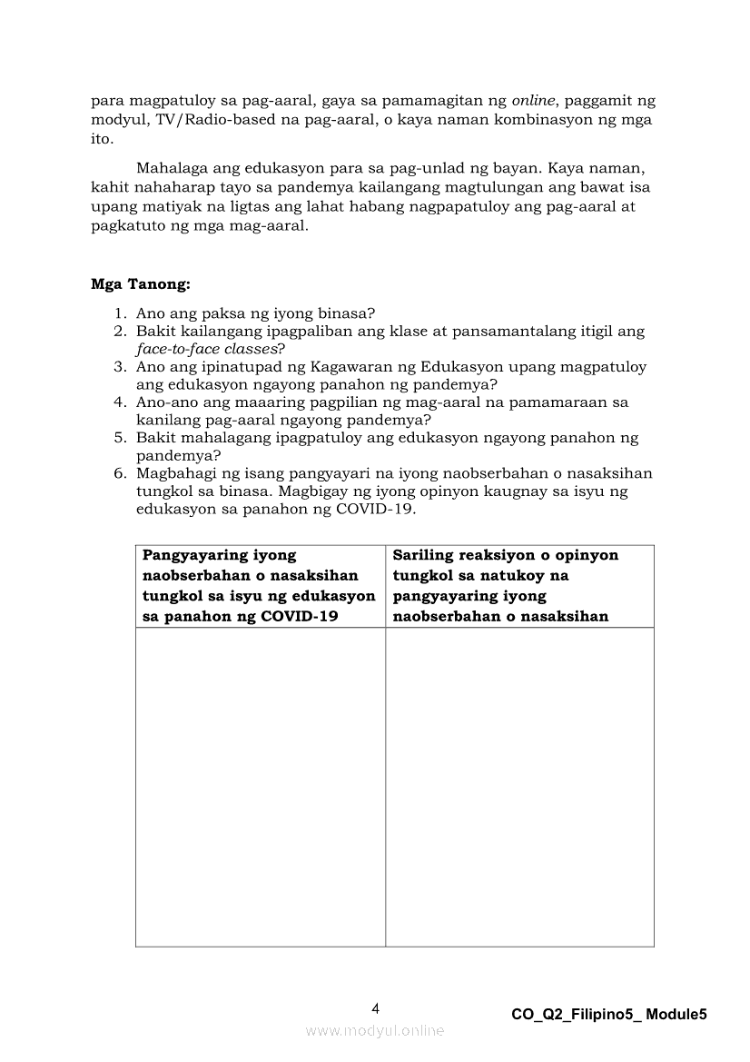 Filipino 5 Ikalawang Markahan – Modyul 5: Pagbabahagi ng Isang Pangyayaring Nasaksihan o Naobserbahan/ Pagpapahayag ng Sariling Opinyon o Reaksyon sa Isang Napakinggang Balita, Isyu o UsapanApr 22, 2021 Grade 5Kiumo M901 Tablet for Kids — comprehensive protection in learning, safety, and entertainment for as low as **₱2,399!. Filipino 5RelatedFilipino 5 Ikaapat na Markahan – Modyul 1 Paggawa ng Dayagram ng Ugnayang Sanhi at Bunga Mula sa Tekstong Napakinggan o NabasaFilipino 5 Ikaapat na Markahan – Modyul 2 Paggamit ng Iba’t Ibang Uri ng Pangungusap sa Pagsasalaysay ng Napakinggang Balita at Pakikipagdebate Tungkol sa Isang IsyuFilipino 5 Ikalawang Markahan-Modyul 3 Pagbibigay ng Paksa, Layunin o Angkop na Pamagat sa Napakinggang Kuwento, Usapan o Talata at sa Napanood na DokumentaryoFilipino 5 Ikalawang Markahan-Modyul 4 Pagbigkas nang may Wastong Tono, Diin, Antala at Damdamin sa Napakinggang TulaFilipino 5 Modyul 9: Pagbibigay Kahulugan ng Pamilyar at Di-Pamilyar na mga Salita