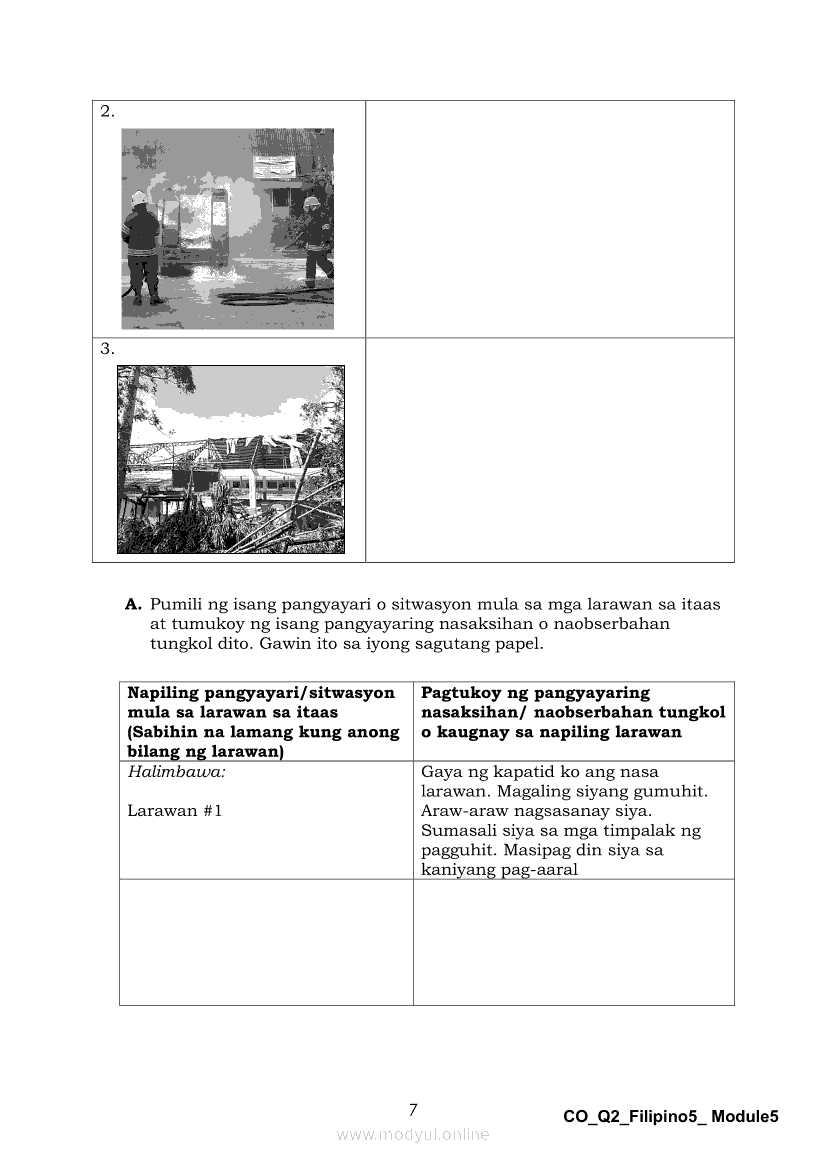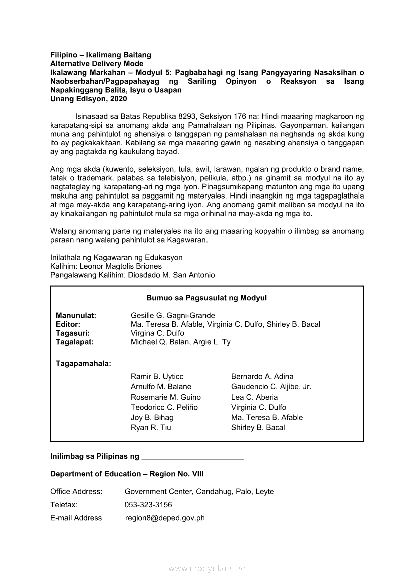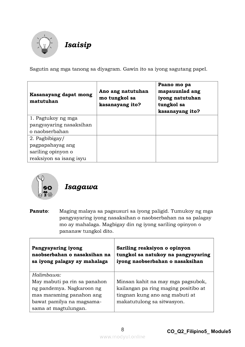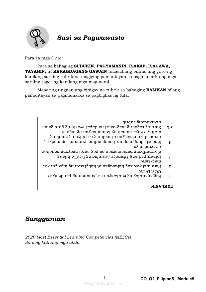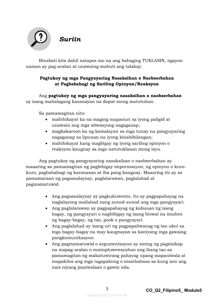 Filipino 5 Ikalawang Markahan – Modyul 5: Pagbabahagi ng Isang Pangyayaring Nasaksihan o Naobserbahan/ Pagpapahayag ng Sariling Opinyon o Reaksyon sa Isang Napakinggang Balita, Isyu o UsapanApr 22, 2021 Grade 5Kiumo M901 Tablet for Kids — comprehensive protection in learning, safety, and entertainment for as low as **₱2,399!. Filipino 5RelatedFilipino 5 Ikaapat na Markahan – Modyul 1 Paggawa ng Dayagram ng Ugnayang Sanhi at Bunga Mula sa Tekstong Napakinggan o NabasaFilipino 5 Ikaapat na Markahan – Modyul 2 Paggamit ng Iba’t Ibang Uri ng Pangungusap sa Pagsasalaysay ng Napakinggang Balita at Pakikipagdebate Tungkol sa Isang IsyuFilipino 5 Ikalawang Markahan-Modyul 3 Pagbibigay ng Paksa, Layunin o Angkop na Pamagat sa Napakinggang Kuwento, Usapan o Talata at sa Napanood na DokumentaryoFilipino 5 Ikalawang Markahan-Modyul 4 Pagbigkas nang may Wastong Tono, Diin, Antala at Damdamin sa Napakinggang TulaFilipino 5 Modyul 9: Pagbibigay Kahulugan ng Pamilyar at Di-Pamilyar na mga Salita