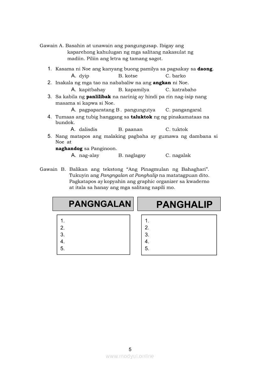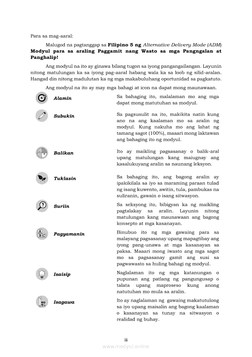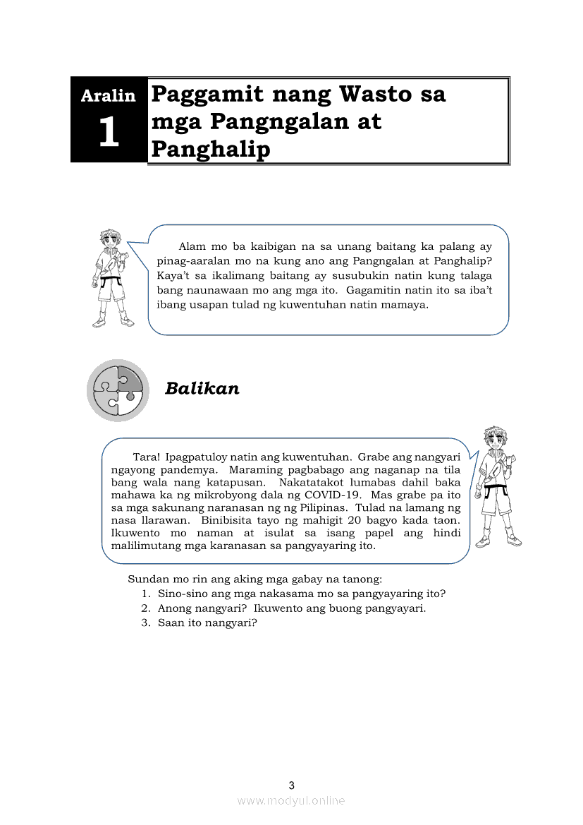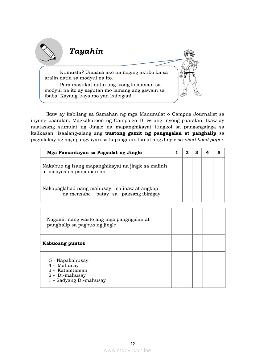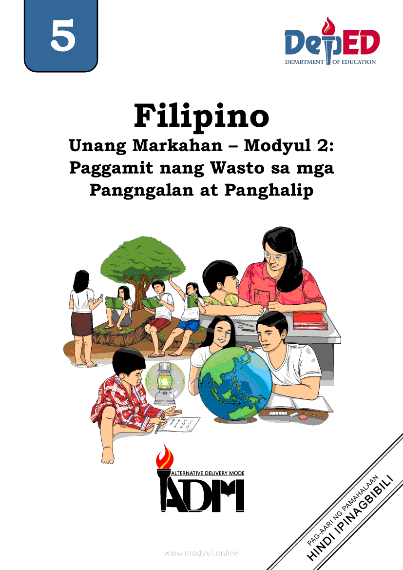 Filipino 5 Modyul 2: Paggamit nang Wasto sa mga Pangngalan at PanghalipApr 22, 2021 Grade 5Kiumo M901 Tablet for Kids — comprehensive protection in learning, safety, and entertainment for as low as **₱2,399!. Filipino 5RelatedFilipino 5 Ikaapat na Markahan – Modyul 2 Paggamit ng Iba’t Ibang Uri ng Pangungusap sa Pagsasalaysay ng Napakinggang Balita at Pakikipagdebate Tungkol sa Isang IsyuFilipino 5 Ikaapat na Markahan – Modyul 1 Paggawa ng Dayagram ng Ugnayang Sanhi at Bunga Mula sa Tekstong Napakinggan o NabasaFilipino 5 Ikalawang Markahan-Modyul 4 Pagbigkas nang may Wastong Tono, Diin, Antala at Damdamin sa Napakinggang TulaFilipino 5 Ikalawang Markahan-Modyul 3 Pagbibigay ng Paksa, Layunin o Angkop na Pamagat sa Napakinggang Kuwento, Usapan o Talata at sa Napanood na DokumentaryoFilipino 5 Modyul 5: Pagpapahayag ng Sariling Opinyon o Reaksiyon sa Isang Napakinggang Balita, Isyu o Usapan