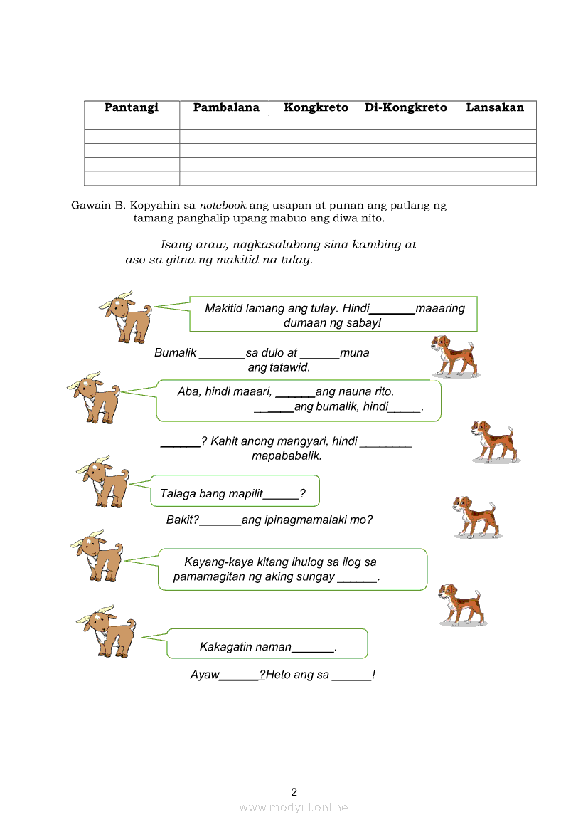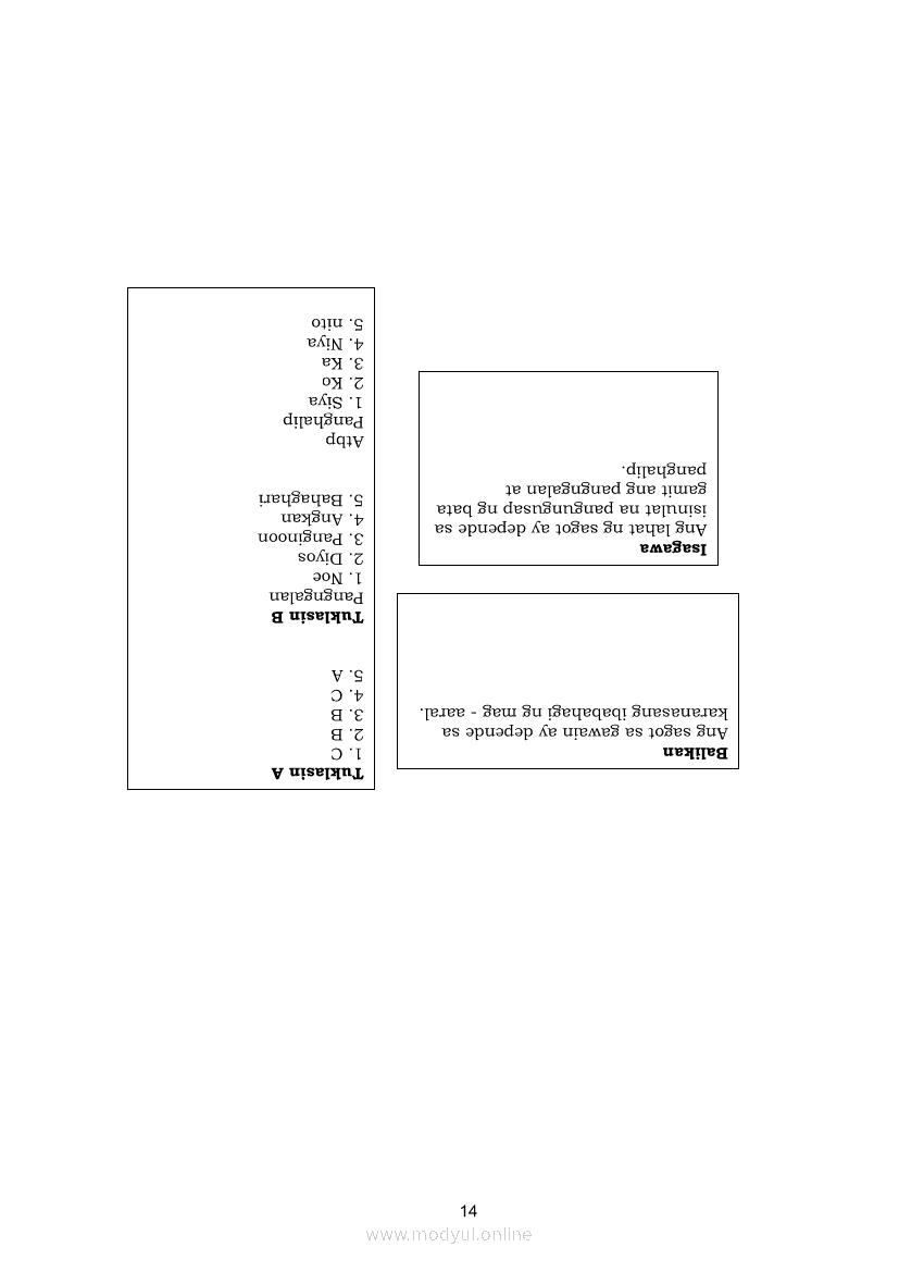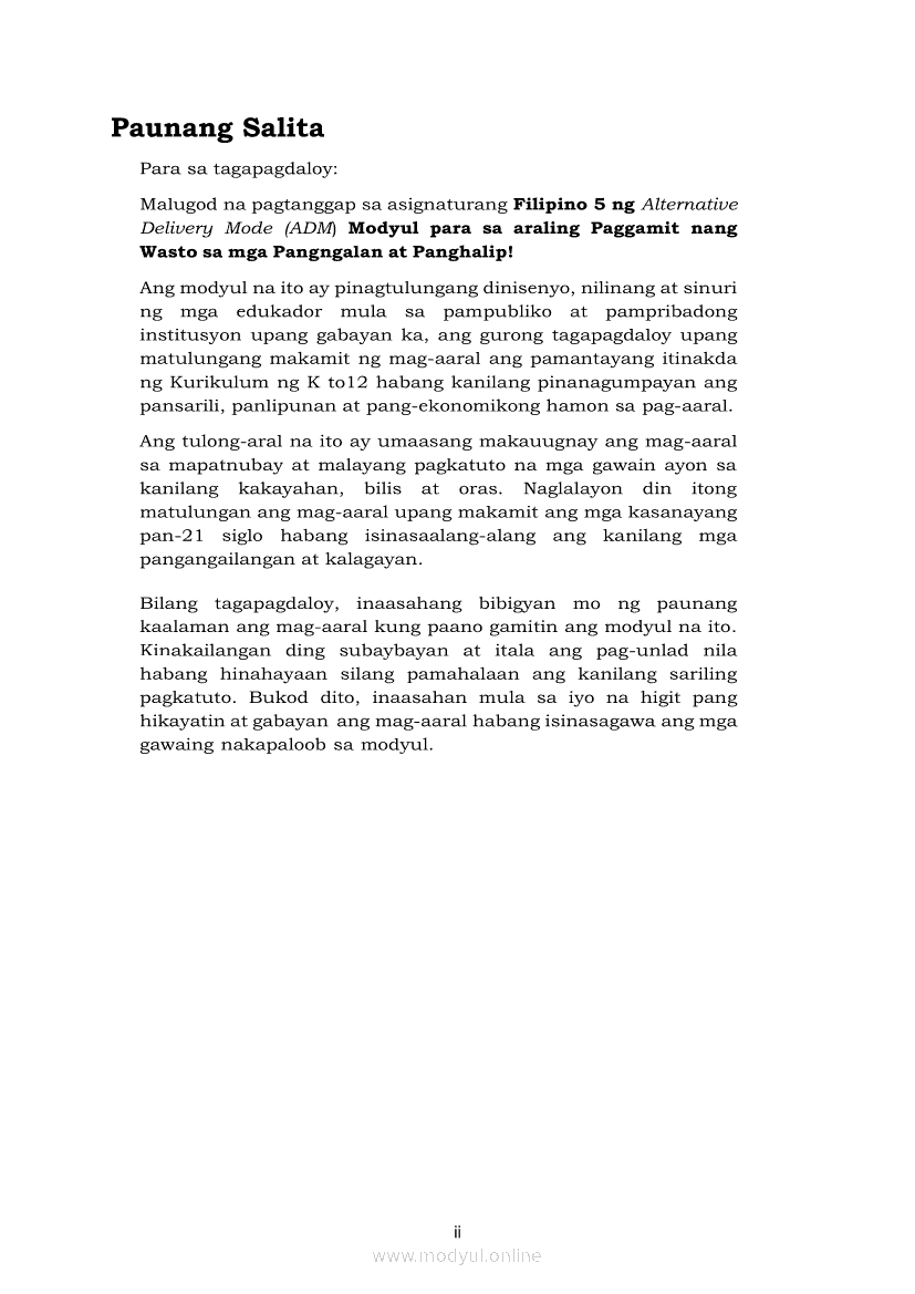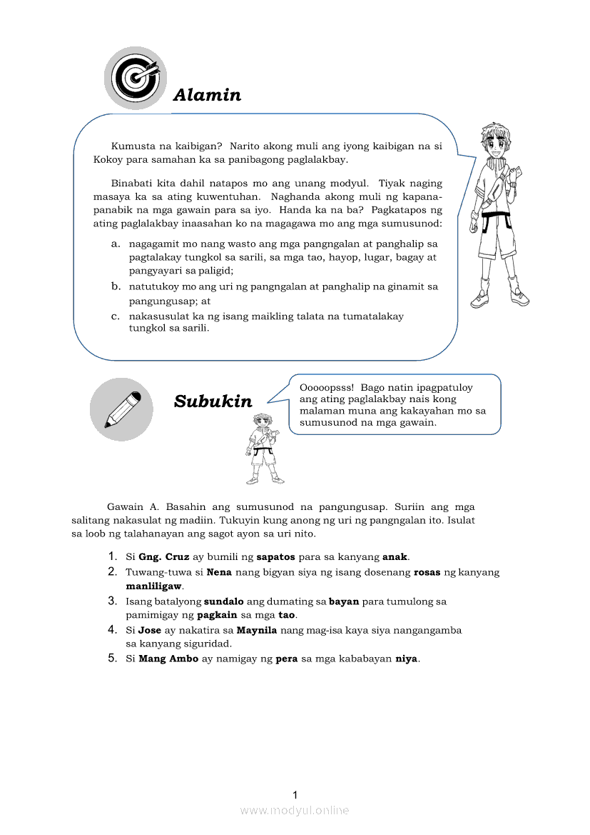 Filipino 5 Modyul 2: Paggamit nang Wasto sa mga Pangngalan at PanghalipApr 22, 2021 Grade 5Kiumo M901 Tablet for Kids — comprehensive protection in learning, safety, and entertainment for as low as **₱2,399!. Filipino 5RelatedFilipino 5 Ikaapat na Markahan – Modyul 2 Paggamit ng Iba’t Ibang Uri ng Pangungusap sa Pagsasalaysay ng Napakinggang Balita at Pakikipagdebate Tungkol sa Isang IsyuFilipino 5 Ikaapat na Markahan – Modyul 1 Paggawa ng Dayagram ng Ugnayang Sanhi at Bunga Mula sa Tekstong Napakinggan o NabasaFilipino 5 Ikalawang Markahan-Modyul 4 Pagbigkas nang may Wastong Tono, Diin, Antala at Damdamin sa Napakinggang TulaFilipino 5 Ikalawang Markahan-Modyul 3 Pagbibigay ng Paksa, Layunin o Angkop na Pamagat sa Napakinggang Kuwento, Usapan o Talata at sa Napanood na DokumentaryoFilipino 5 Modyul 5: Pagpapahayag ng Sariling Opinyon o Reaksiyon sa Isang Napakinggang Balita, Isyu o Usapan