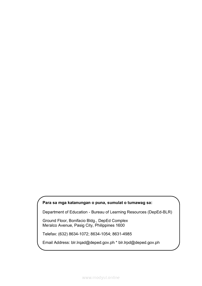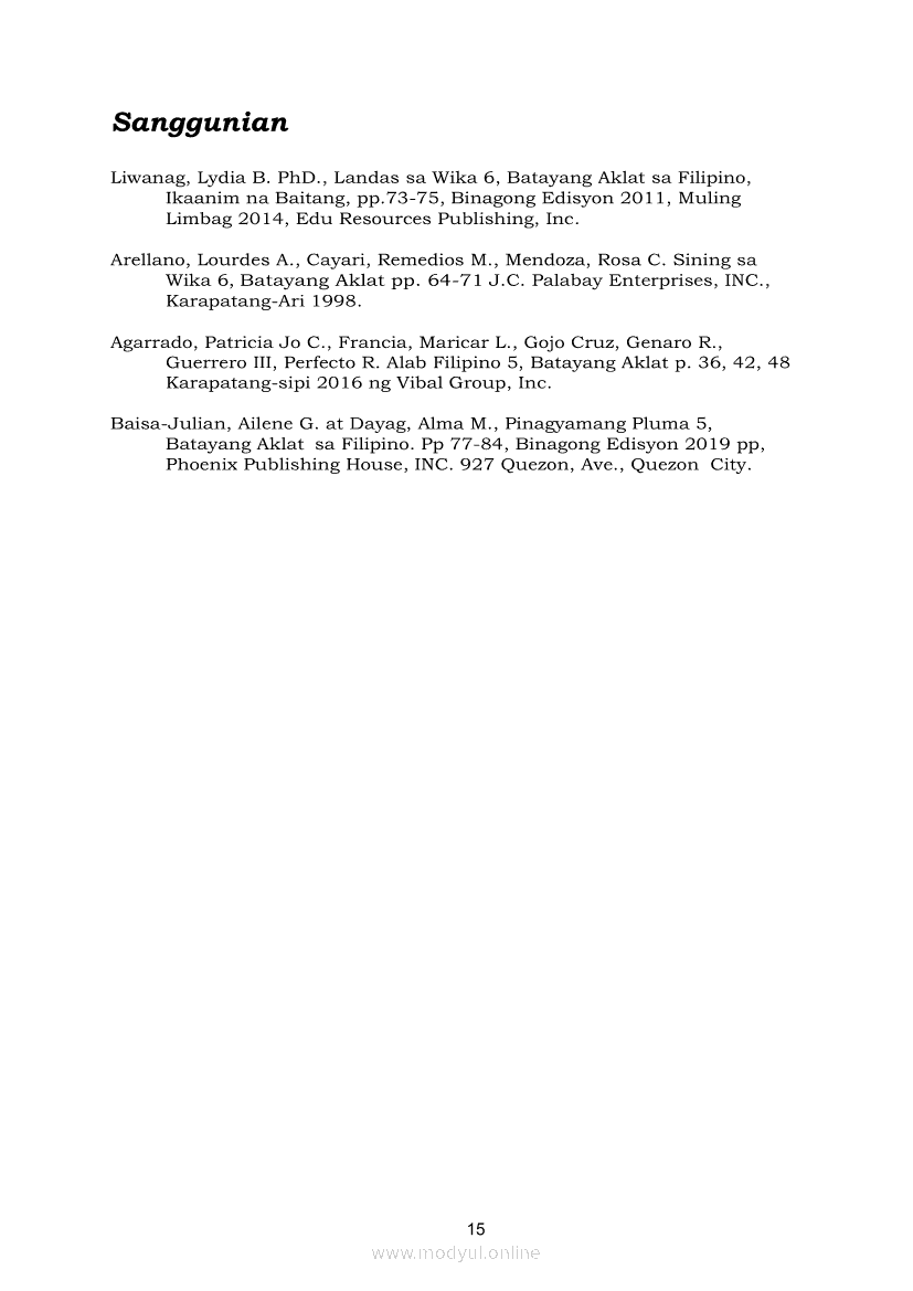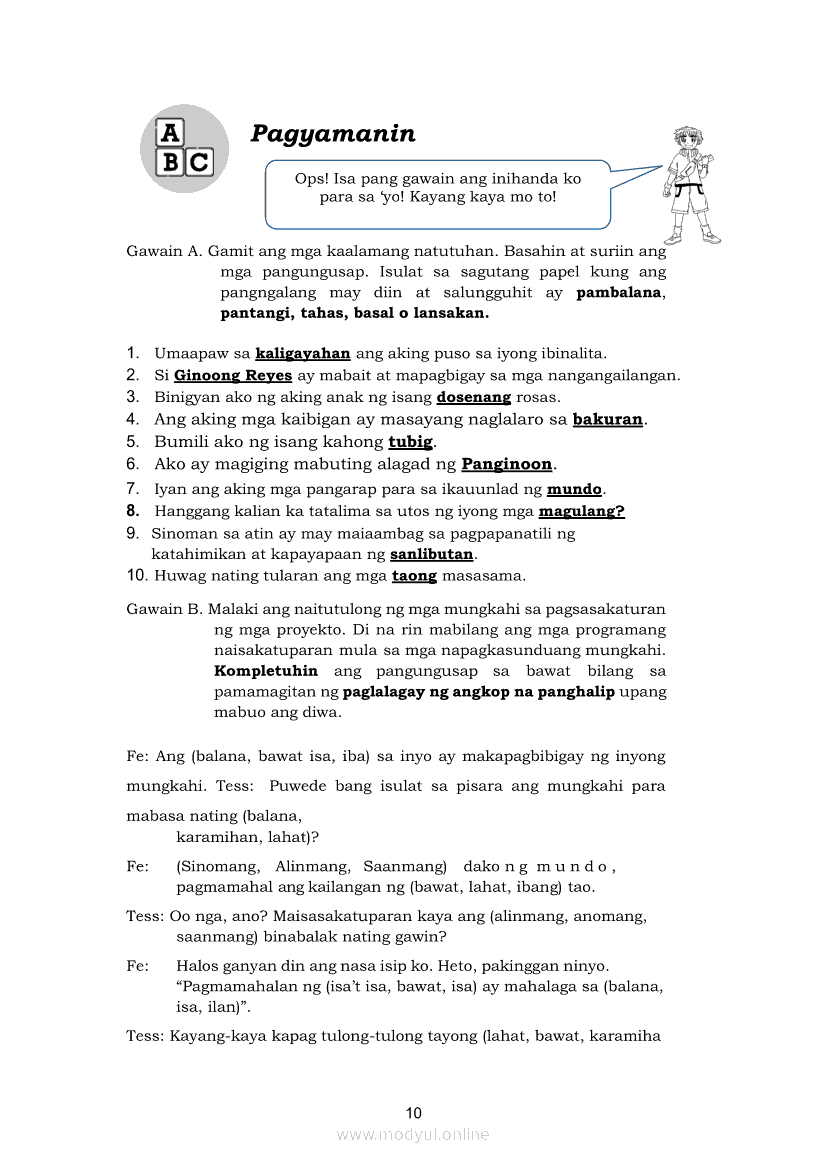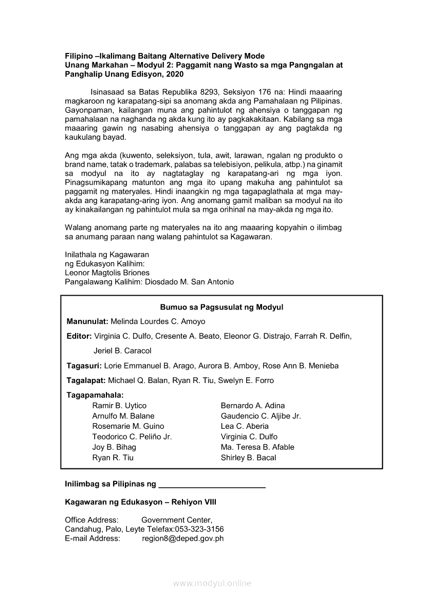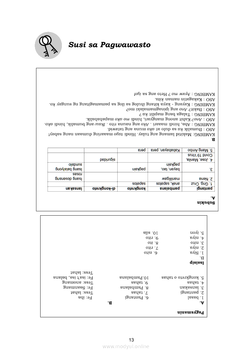 Filipino 5 Modyul 2: Paggamit nang Wasto sa mga Pangngalan at PanghalipApr 22, 2021 Grade 5Kiumo M901 Tablet for Kids — comprehensive protection in learning, safety, and entertainment for as low as **₱2,399!. Filipino 5RelatedFilipino 5 Ikaapat na Markahan – Modyul 2 Paggamit ng Iba’t Ibang Uri ng Pangungusap sa Pagsasalaysay ng Napakinggang Balita at Pakikipagdebate Tungkol sa Isang IsyuFilipino 5 Ikaapat na Markahan – Modyul 1 Paggawa ng Dayagram ng Ugnayang Sanhi at Bunga Mula sa Tekstong Napakinggan o NabasaFilipino 5 Ikalawang Markahan-Modyul 4 Pagbigkas nang may Wastong Tono, Diin, Antala at Damdamin sa Napakinggang TulaFilipino 5 Ikalawang Markahan-Modyul 3 Pagbibigay ng Paksa, Layunin o Angkop na Pamagat sa Napakinggang Kuwento, Usapan o Talata at sa Napanood na DokumentaryoFilipino 5 Modyul 5: Pagpapahayag ng Sariling Opinyon o Reaksiyon sa Isang Napakinggang Balita, Isyu o Usapan