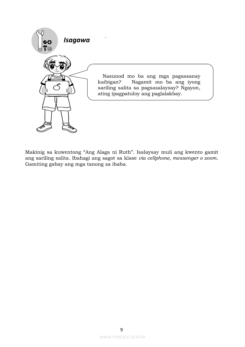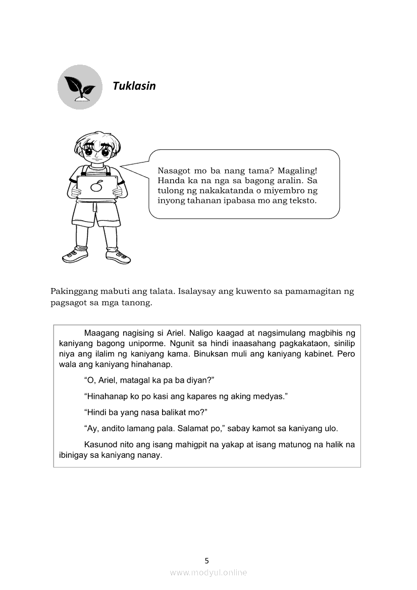 Filipino 5 Modyul 6: Pagsasalaysay Muli sa Napakinggang Teksto Gamit ang Sariling SalitaApr 22, 2021 Grade 5Kiumo M901 Tablet for Kids — comprehensive protection in learning, safety, and entertainment for as low as **₱2,399!. Filipino 5RelatedFilipino 5 Ikaapat na Markahan – Modyul 2 Paggamit ng Iba’t Ibang Uri ng Pangungusap sa Pagsasalaysay ng Napakinggang Balita at Pakikipagdebate Tungkol sa Isang IsyuFilipino 5 Ikaapat na Markahan – Modyul 1 Paggawa ng Dayagram ng Ugnayang Sanhi at Bunga Mula sa Tekstong Napakinggan o NabasaFilipino 5 Modyul 7: Pagsasalaysay Muli sa Napakinggang Teksto sa Tulong ng mga PangungusapFilipino 5 Modyul 10: Pagbibigay-kahulugan sa Bar Graph, Pie Graph, Talahanayan at Iba paFilipino 5 Modyul 1: Pag-uugnay ng Sariling Karanasan sa Napakinggang Teksto