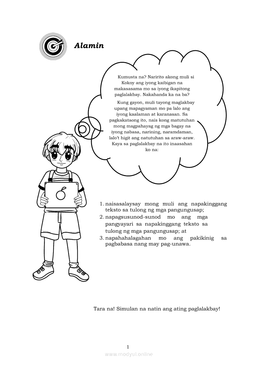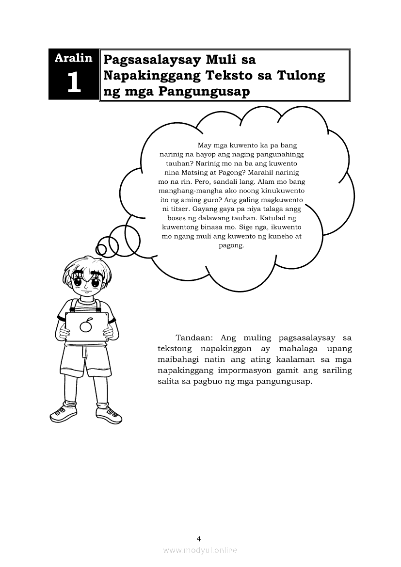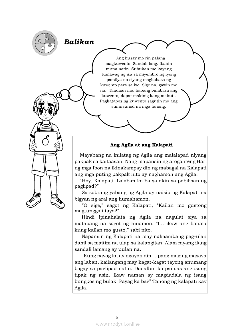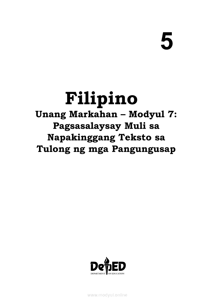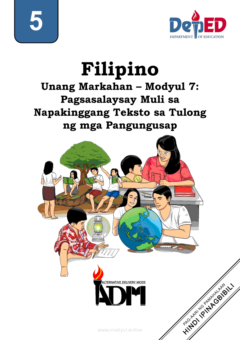 Filipino 5 Modyul 7: Pagsasalaysay Muli sa Napakinggang Teksto sa Tulong ng mga PangungusapApr 22, 2021 Grade 5Kiumo M901 Tablet for Kids — comprehensive protection in learning, safety, and entertainment for as low as **₱2,399!. Filipino 5RelatedFilipino 5 Ikaapat na Markahan – Modyul 2 Paggamit ng Iba’t Ibang Uri ng Pangungusap sa Pagsasalaysay ng Napakinggang Balita at Pakikipagdebate Tungkol sa Isang IsyuFilipino 5 Ikaapat na Markahan – Modyul 1 Paggawa ng Dayagram ng Ugnayang Sanhi at Bunga Mula sa Tekstong Napakinggan o NabasaFilipino 5 Ikalawang Markahan-Modyul 4 Pagbigkas nang may Wastong Tono, Diin, Antala at Damdamin sa Napakinggang TulaFilipino 5 Ikalawang Markahan-Modyul 3 Pagbibigay ng Paksa, Layunin o Angkop na Pamagat sa Napakinggang Kuwento, Usapan o Talata at sa Napanood na DokumentaryoFilipino 5 Modyul 10: Pagbibigay-kahulugan sa Bar Graph, Pie Graph, Talahanayan at Iba pa