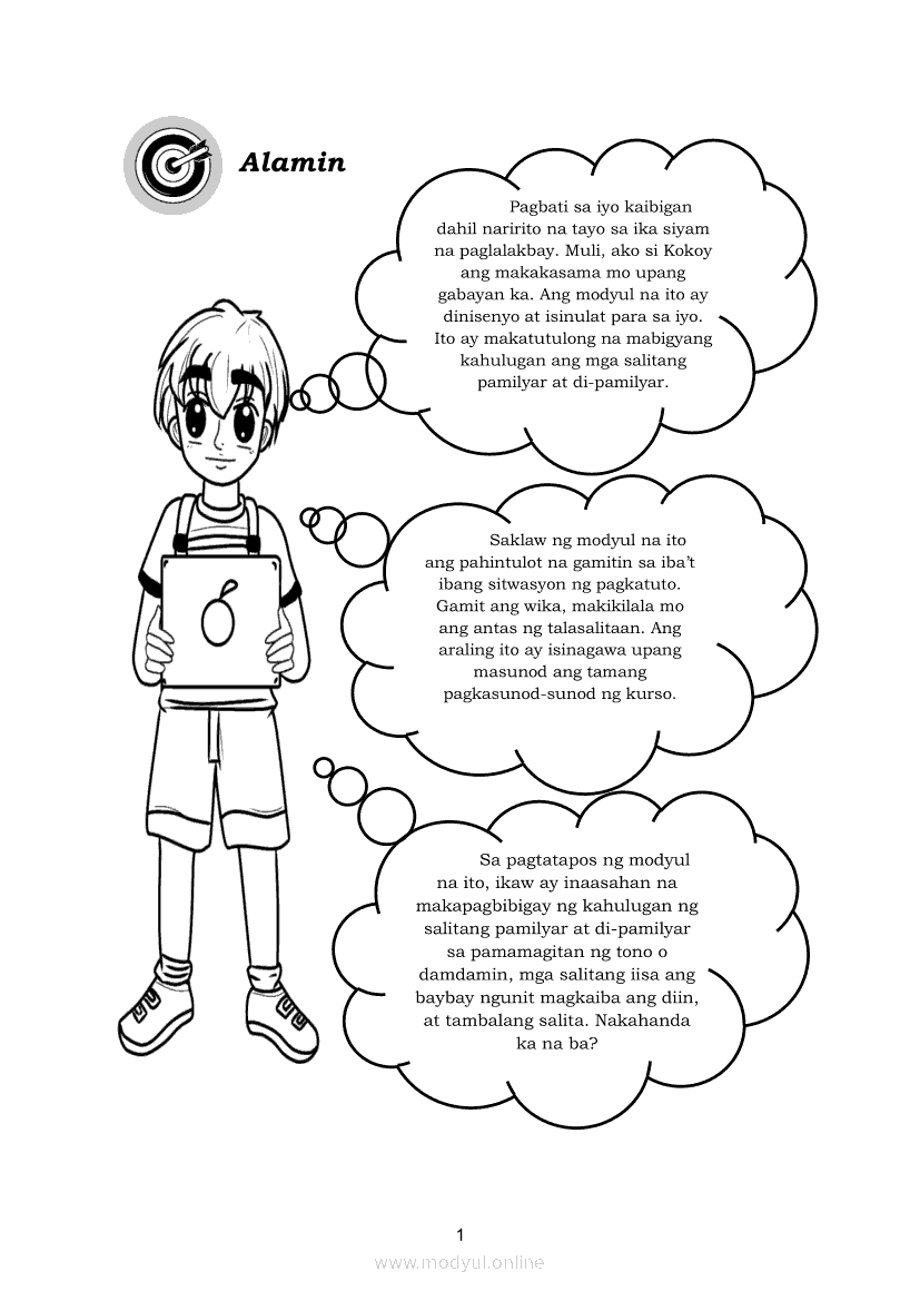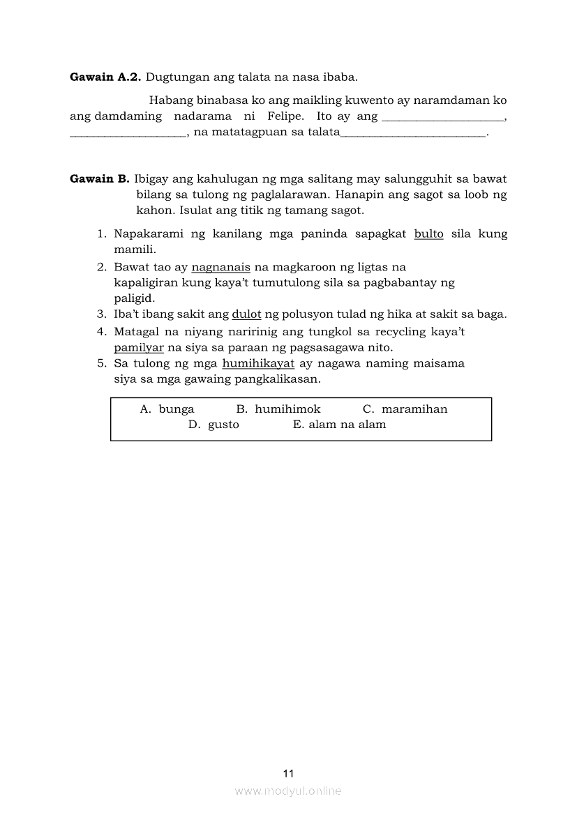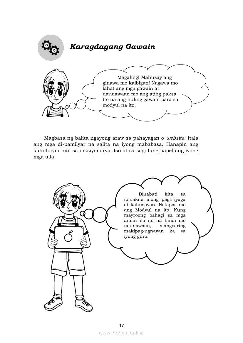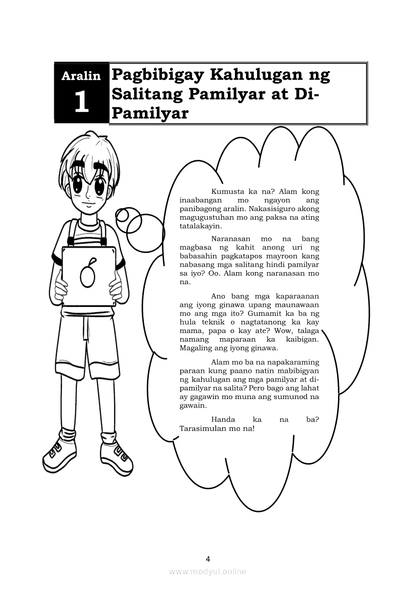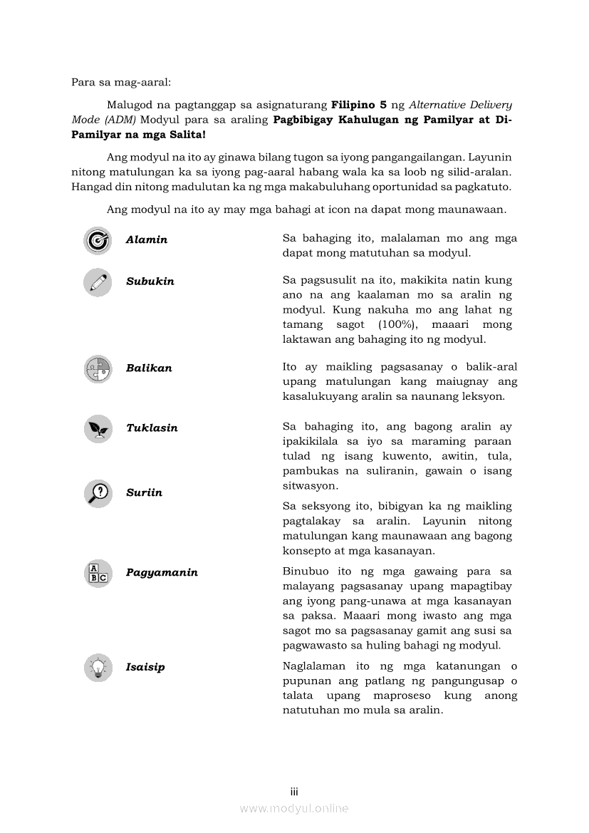 Filipino 5 Modyul 9: Pagbibigay Kahulugan ng Pamilyar at Di-Pamilyar na mga SalitaApr 22, 2021 Grade 5Kiumo M901 Tablet for Kids — comprehensive protection in learning, safety, and entertainment for as low as **₱2,399!. Filipino 5RelatedFilipino 5 Ikaapat na Markahan – Modyul 2 Paggamit ng Iba’t Ibang Uri ng Pangungusap sa Pagsasalaysay ng Napakinggang Balita at Pakikipagdebate Tungkol sa Isang IsyuFilipino 5 Ikaapat na Markahan – Modyul 1 Paggawa ng Dayagram ng Ugnayang Sanhi at Bunga Mula sa Tekstong Napakinggan o NabasaFilipino 5 Ikalawang Markahan – Modyul 5: Pagbabahagi ng Isang Pangyayaring Nasaksihan o Naobserbahan/ Pagpapahayag ng Sariling Opinyon o Reaksyon sa Isang Napakinggang Balita, Isyu o UsapanFilipino 5 PIVOT Module FilipinoFilipino 5 Modyul 4: Pagsulat ng Isang Maikling Tula, Talatang Nagsasalaysay at Talambuhay