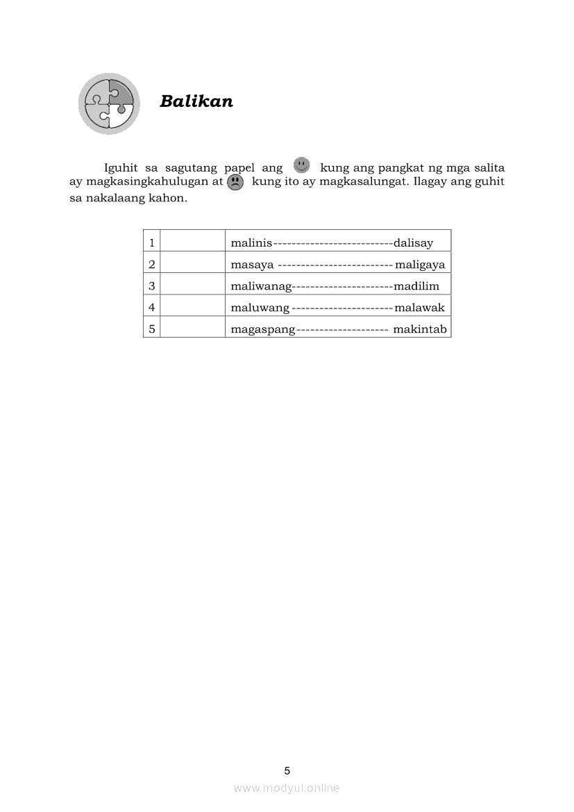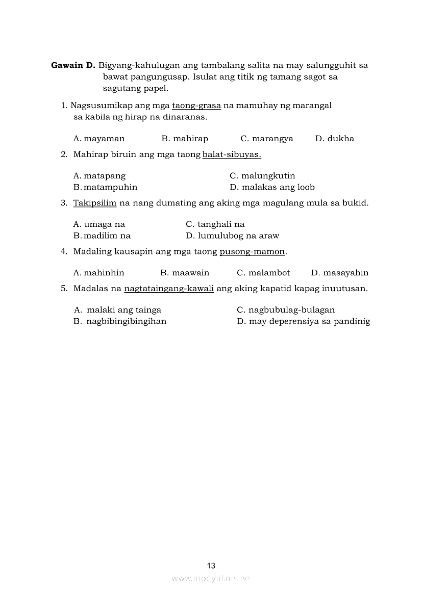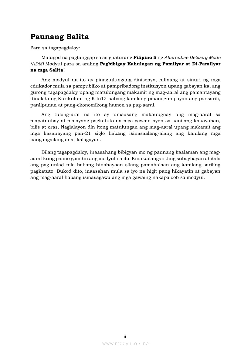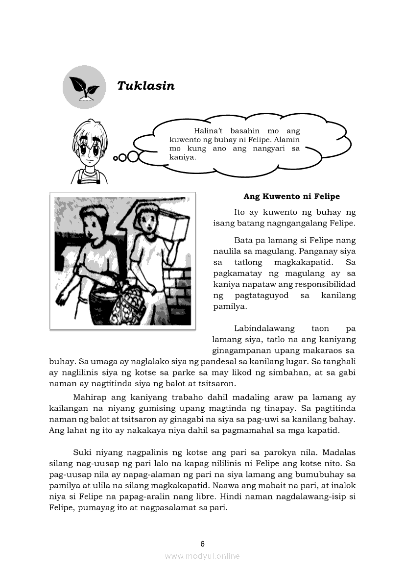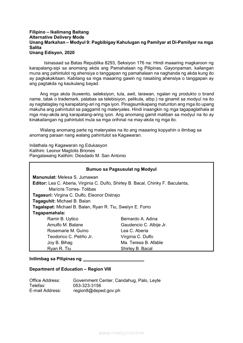 Filipino 5 Modyul 9: Pagbibigay Kahulugan ng Pamilyar at Di-Pamilyar na mga SalitaApr 22, 2021 Grade 5Kiumo M901 Tablet for Kids — comprehensive protection in learning, safety, and entertainment for as low as **₱2,399!. Filipino 5RelatedFilipino 5 Ikaapat na Markahan – Modyul 2 Paggamit ng Iba’t Ibang Uri ng Pangungusap sa Pagsasalaysay ng Napakinggang Balita at Pakikipagdebate Tungkol sa Isang IsyuFilipino 5 Ikaapat na Markahan – Modyul 1 Paggawa ng Dayagram ng Ugnayang Sanhi at Bunga Mula sa Tekstong Napakinggan o NabasaFilipino 5 Ikalawang Markahan – Modyul 5: Pagbabahagi ng Isang Pangyayaring Nasaksihan o Naobserbahan/ Pagpapahayag ng Sariling Opinyon o Reaksyon sa Isang Napakinggang Balita, Isyu o UsapanFilipino 5 PIVOT Module FilipinoFilipino 5 Modyul 4: Pagsulat ng Isang Maikling Tula, Talatang Nagsasalaysay at Talambuhay