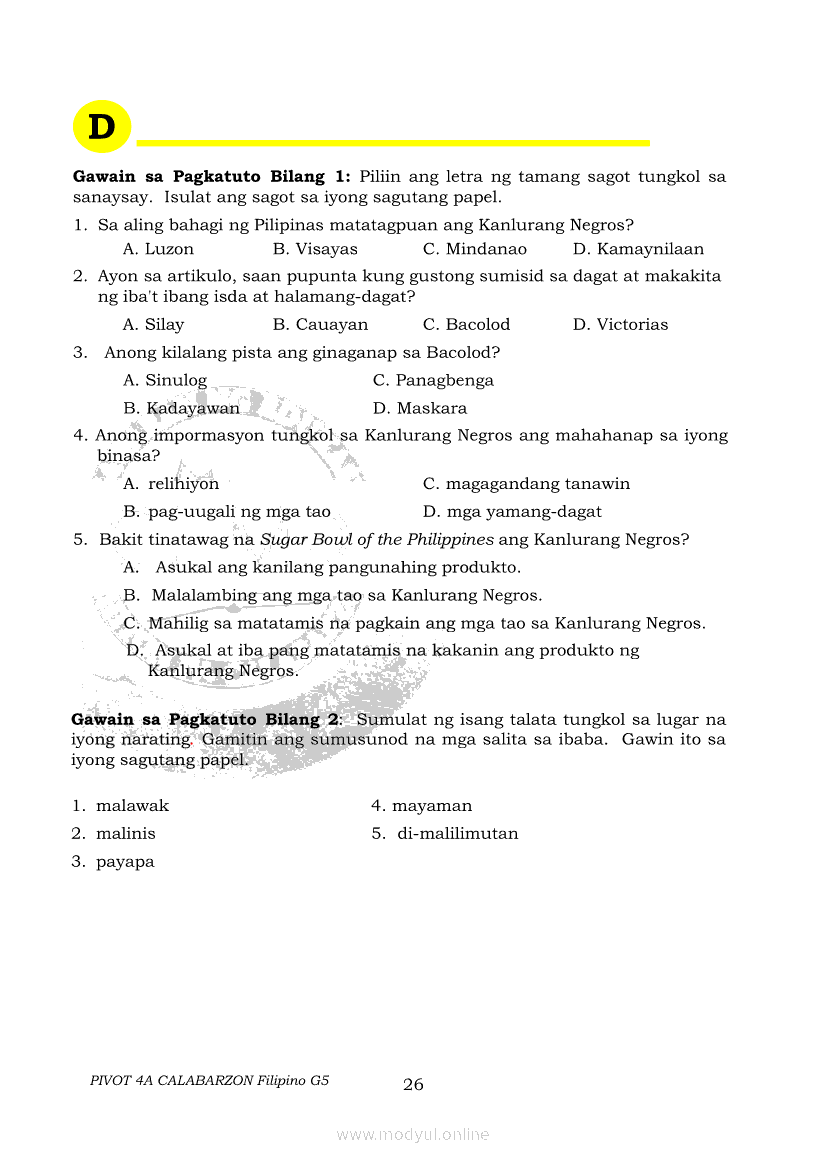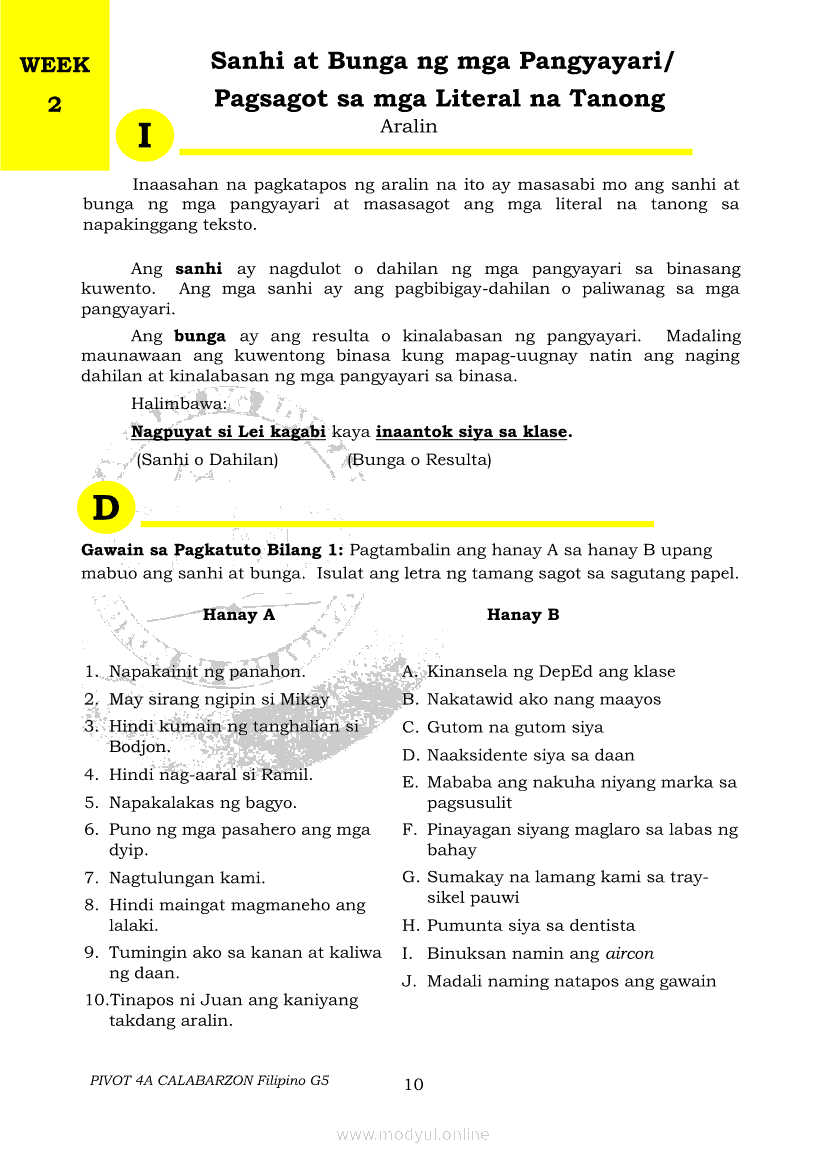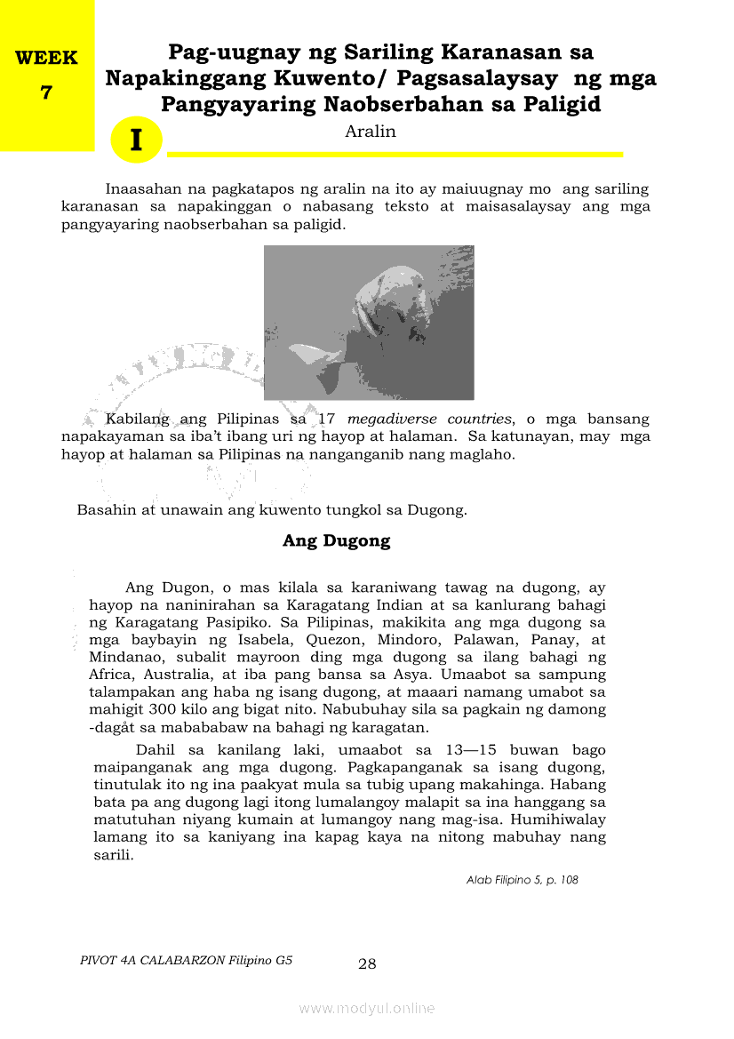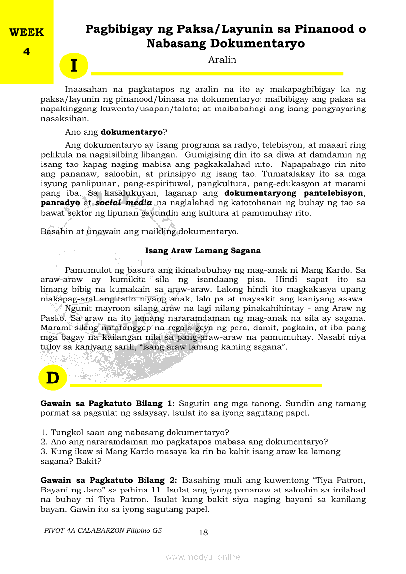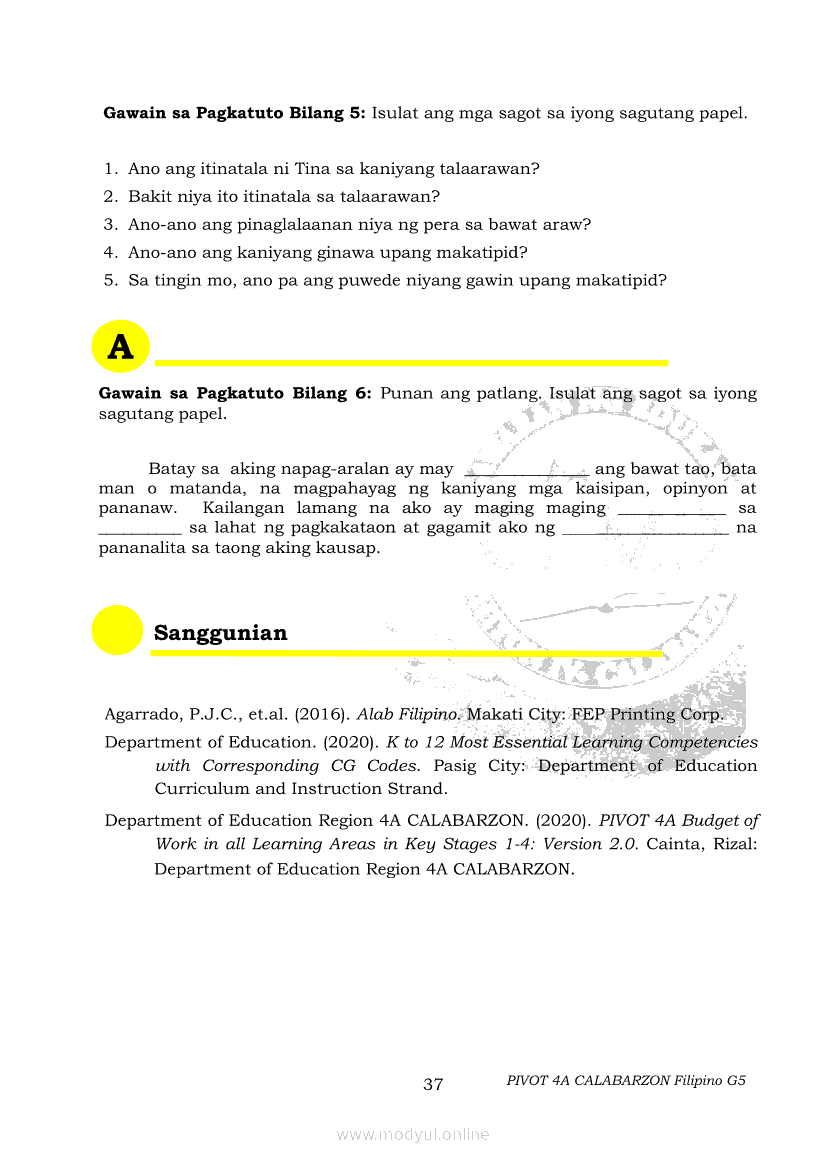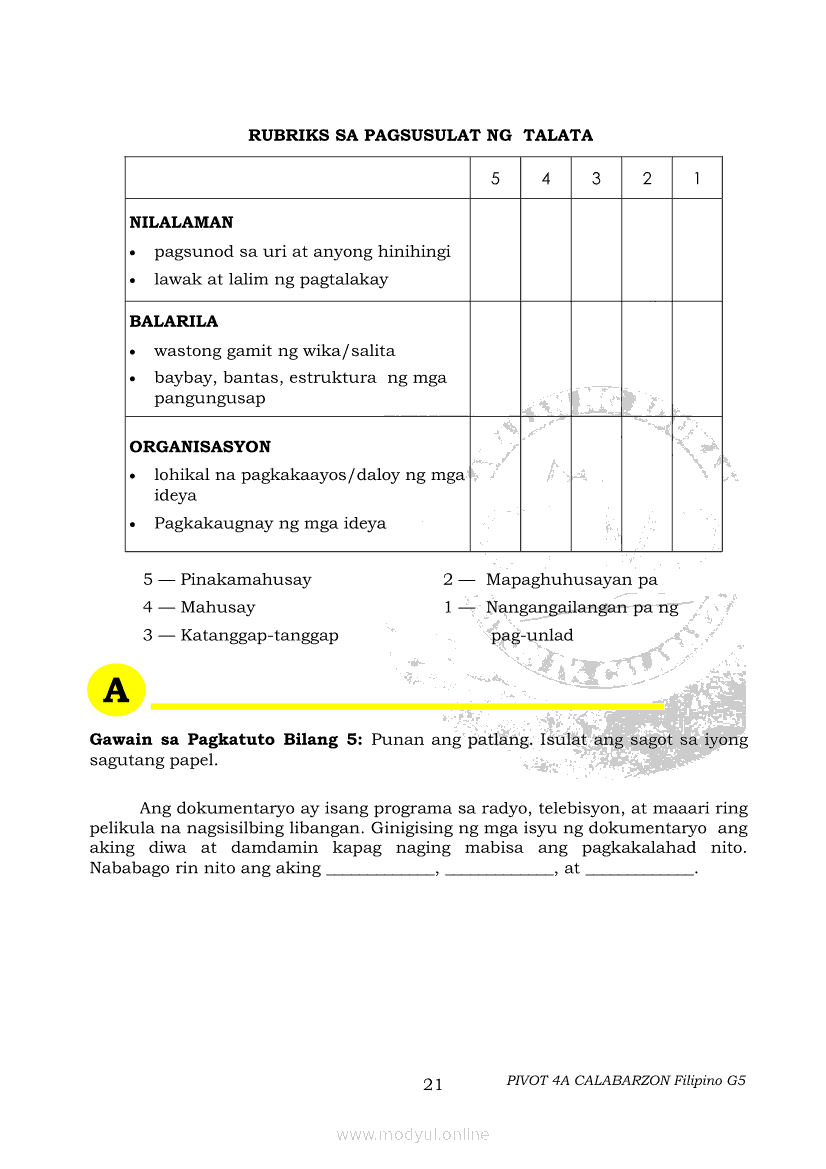 Filipino 5 Modyul para sa Ikalawang Markahan (PIVOT)Apr 22, 2021 Grade 5Kiumo M901 Tablet for Kids — comprehensive protection in learning, safety, and entertainment for as low as **₱2,399!. Filipino 5RelatedFilipino 5 Ikaapat na Markahan – Modyul 1 Paggawa ng Dayagram ng Ugnayang Sanhi at Bunga Mula sa Tekstong Napakinggan o NabasaFilipino 5 Ikaapat na Markahan – Modyul 2 Paggamit ng Iba’t Ibang Uri ng Pangungusap sa Pagsasalaysay ng Napakinggang Balita at Pakikipagdebate Tungkol sa Isang IsyuFilipino 5 Modyul 1: Pag-uugnay ng Sariling Karanasan sa Napakinggang TekstoFilipino 5 Ikalawang Markahan – Modyul 1: Pagbibigay ng Mahahalagang Pangyayari/Pagsagot sa Nabasang Talaarawan, Journal, Talambuhay at AnekdotaFilipino 5 Modyul 5: Pagpapahayag ng Sariling Opinyon o Reaksiyon sa Isang Napakinggang Balita, Isyu o Usapan