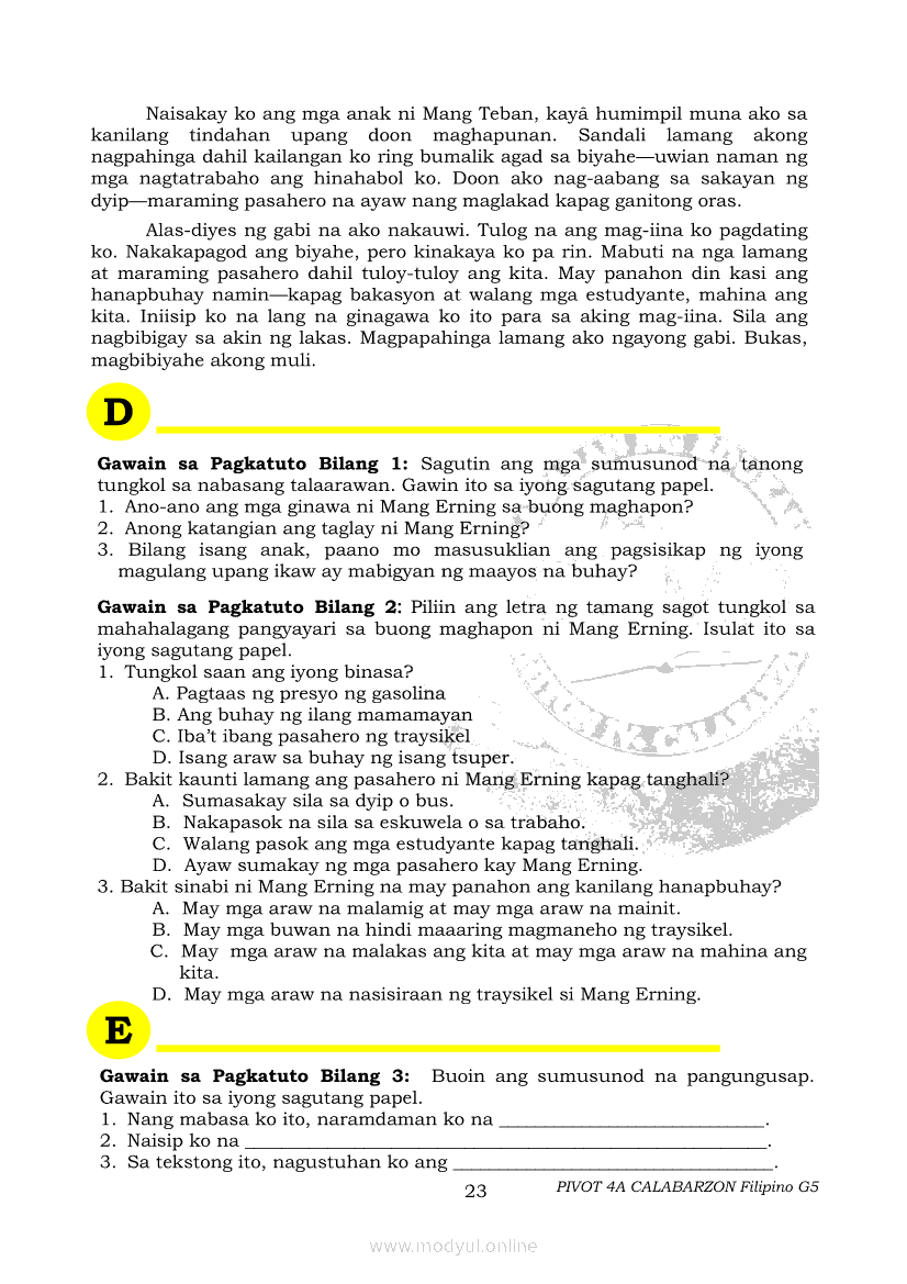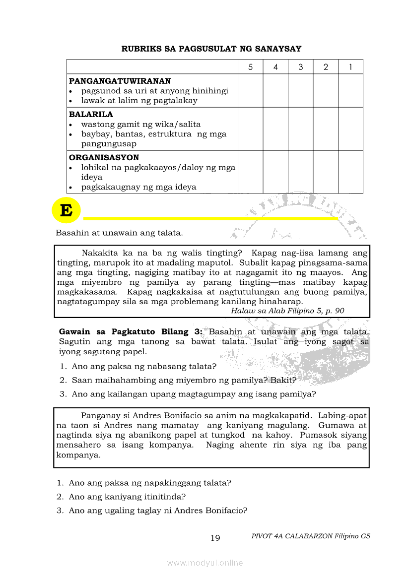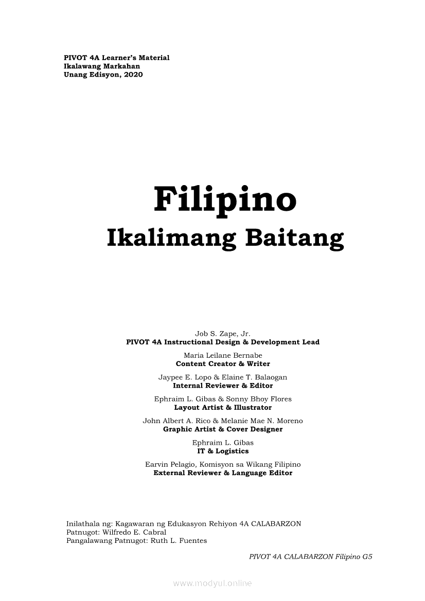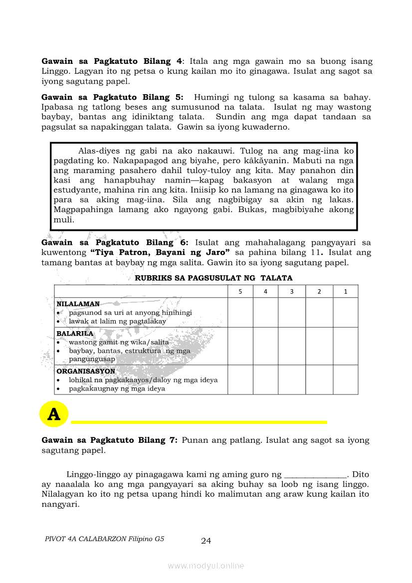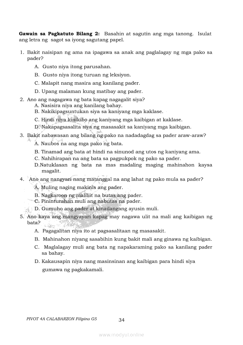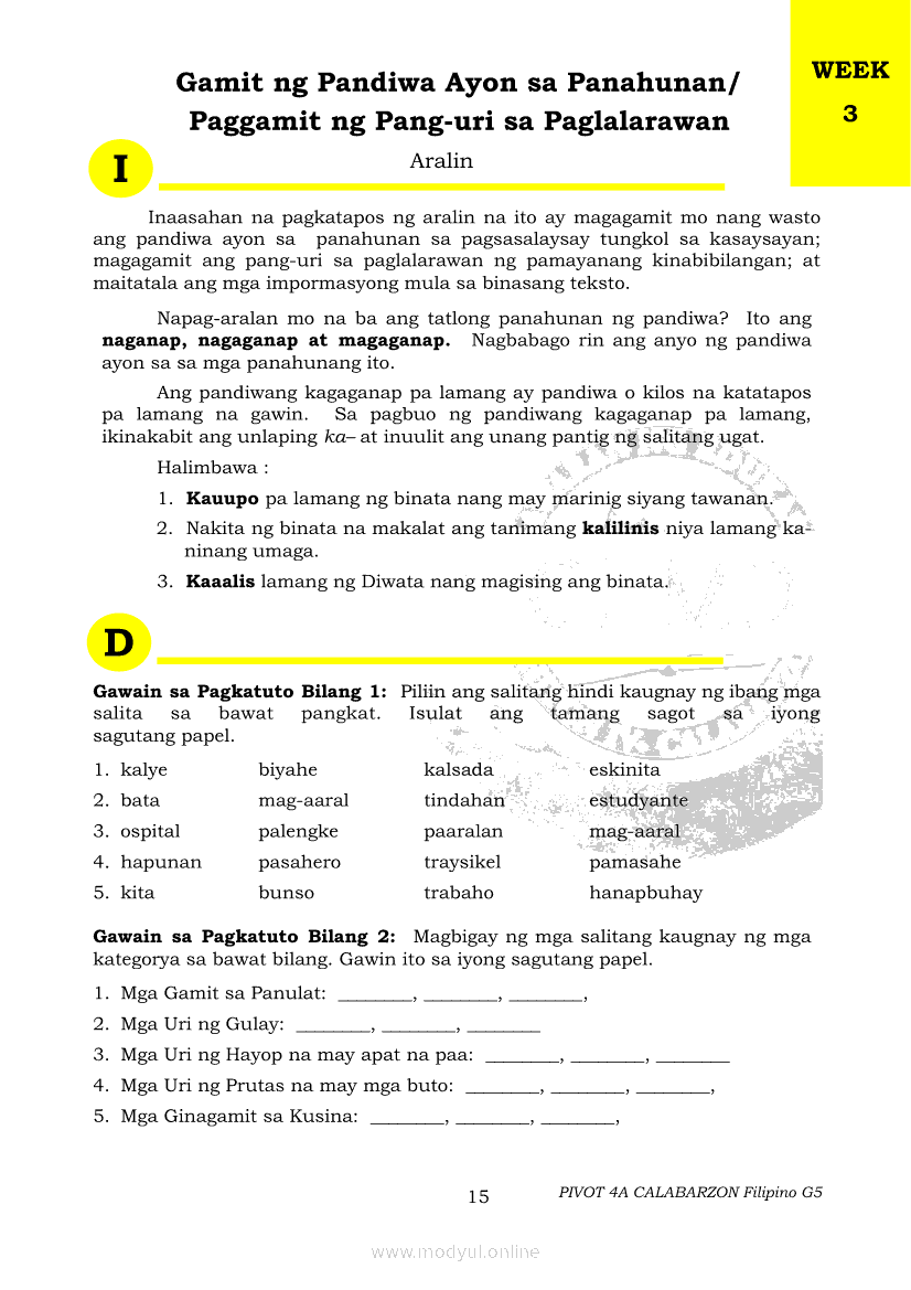 Filipino 5 Modyul para sa Ikalawang Markahan (PIVOT)Apr 22, 2021 Grade 5Kiumo M901 Tablet for Kids — comprehensive protection in learning, safety, and entertainment for as low as **₱2,399!. Filipino 5RelatedFilipino 5 Ikaapat na Markahan – Modyul 1 Paggawa ng Dayagram ng Ugnayang Sanhi at Bunga Mula sa Tekstong Napakinggan o NabasaFilipino 5 Ikaapat na Markahan – Modyul 2 Paggamit ng Iba’t Ibang Uri ng Pangungusap sa Pagsasalaysay ng Napakinggang Balita at Pakikipagdebate Tungkol sa Isang IsyuFilipino 5 Modyul 1: Pag-uugnay ng Sariling Karanasan sa Napakinggang TekstoFilipino 5 Ikalawang Markahan – Modyul 1: Pagbibigay ng Mahahalagang Pangyayari/Pagsagot sa Nabasang Talaarawan, Journal, Talambuhay at AnekdotaFilipino 5 Modyul 5: Pagpapahayag ng Sariling Opinyon o Reaksiyon sa Isang Napakinggang Balita, Isyu o Usapan