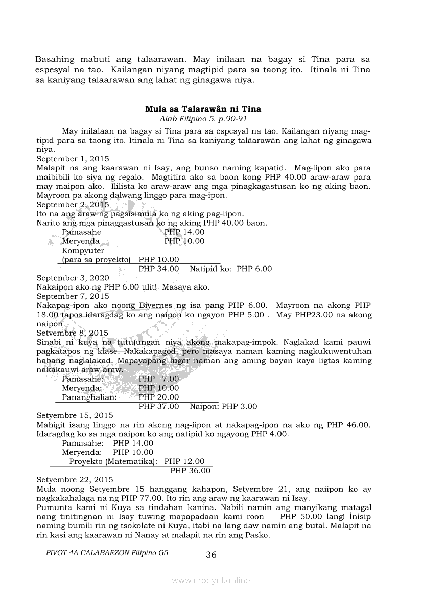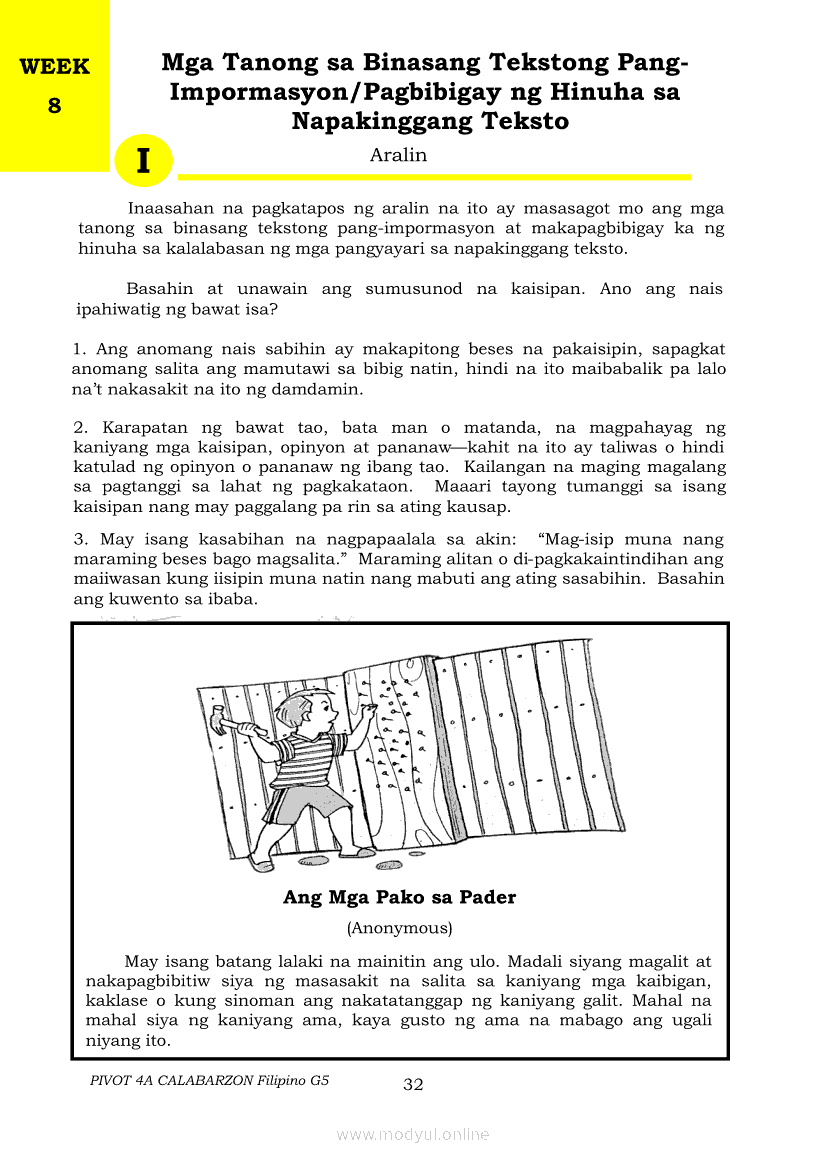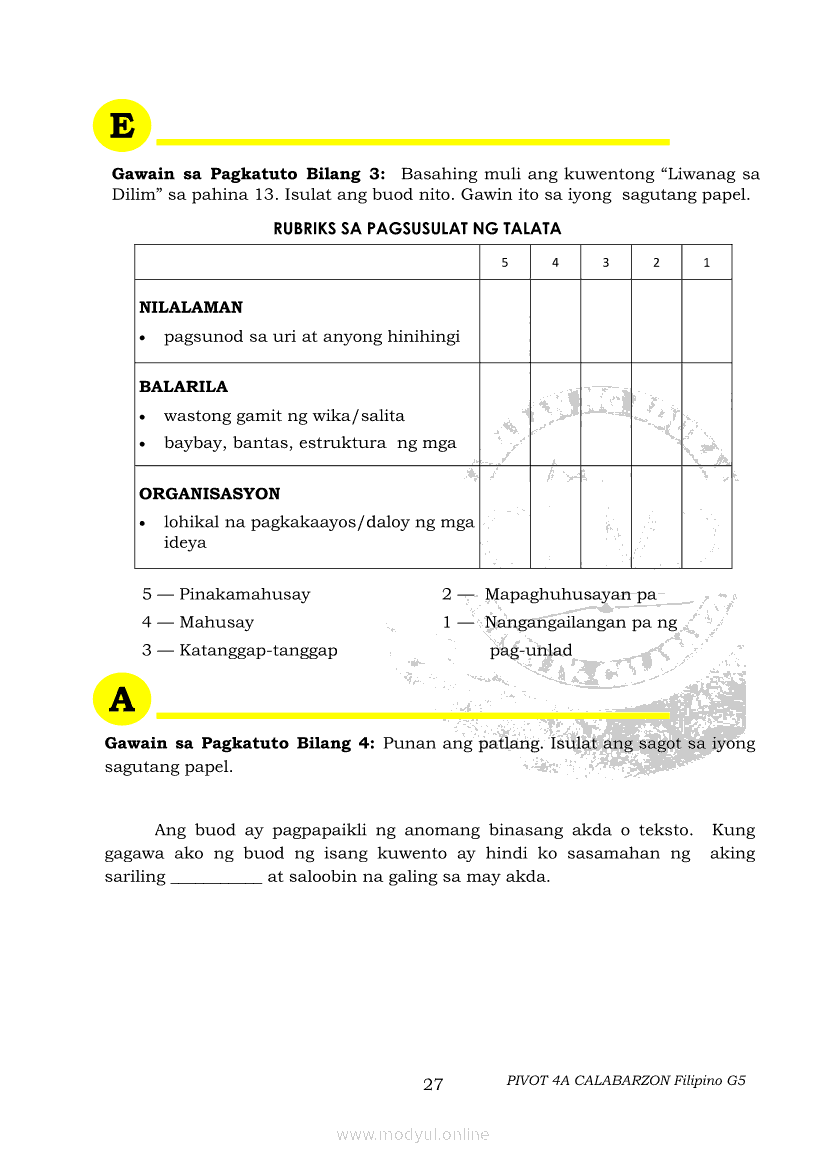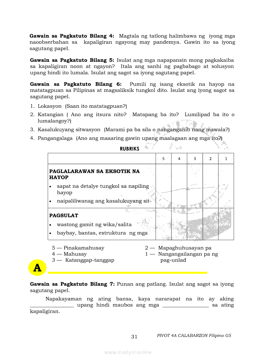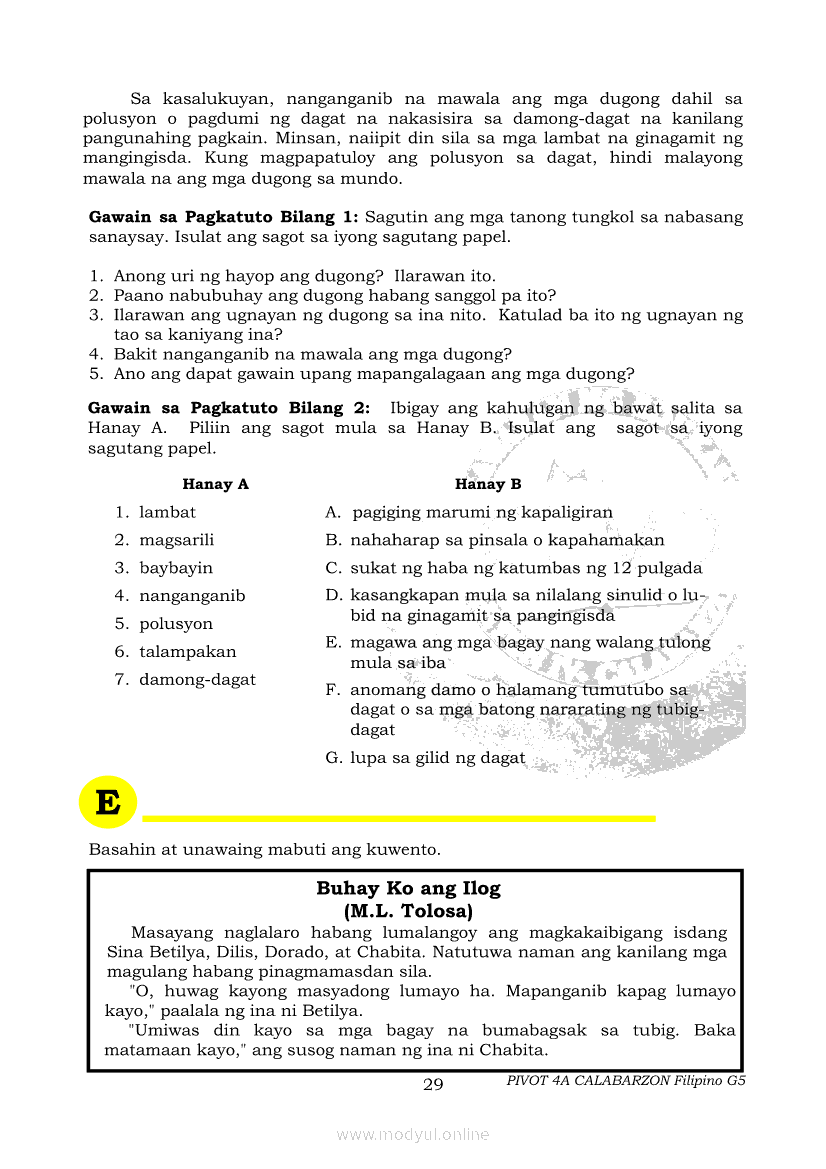 Filipino 5 Modyul para sa Ikalawang Markahan (PIVOT)Apr 22, 2021 Grade 5Kiumo M901 Tablet for Kids — comprehensive protection in learning, safety, and entertainment for as low as **₱2,399!. Filipino 5RelatedFilipino 5 Ikaapat na Markahan – Modyul 1 Paggawa ng Dayagram ng Ugnayang Sanhi at Bunga Mula sa Tekstong Napakinggan o NabasaFilipino 5 Ikaapat na Markahan – Modyul 2 Paggamit ng Iba’t Ibang Uri ng Pangungusap sa Pagsasalaysay ng Napakinggang Balita at Pakikipagdebate Tungkol sa Isang IsyuFilipino 5 Modyul 1: Pag-uugnay ng Sariling Karanasan sa Napakinggang TekstoFilipino 5 Ikalawang Markahan – Modyul 1: Pagbibigay ng Mahahalagang Pangyayari/Pagsagot sa Nabasang Talaarawan, Journal, Talambuhay at AnekdotaFilipino 5 Modyul 5: Pagpapahayag ng Sariling Opinyon o Reaksiyon sa Isang Napakinggang Balita, Isyu o Usapan