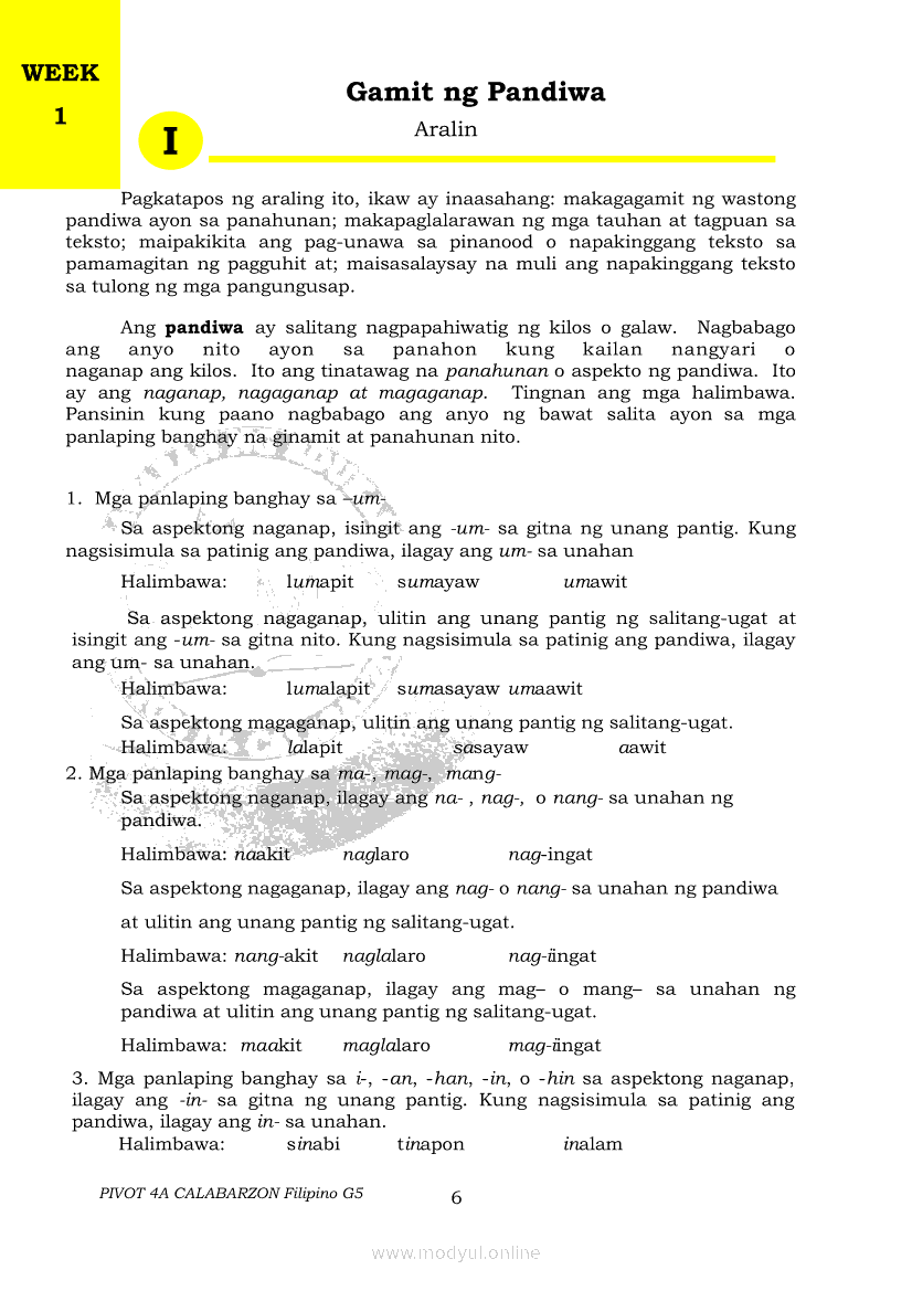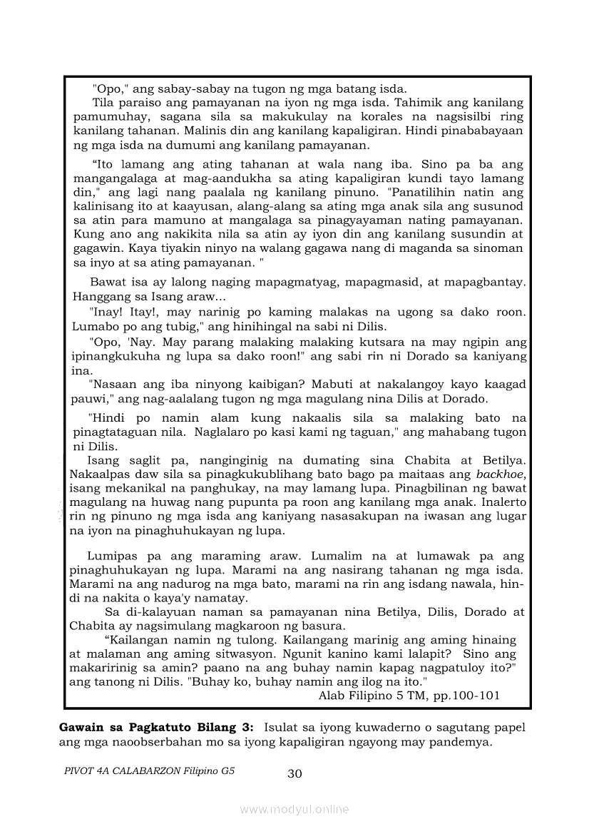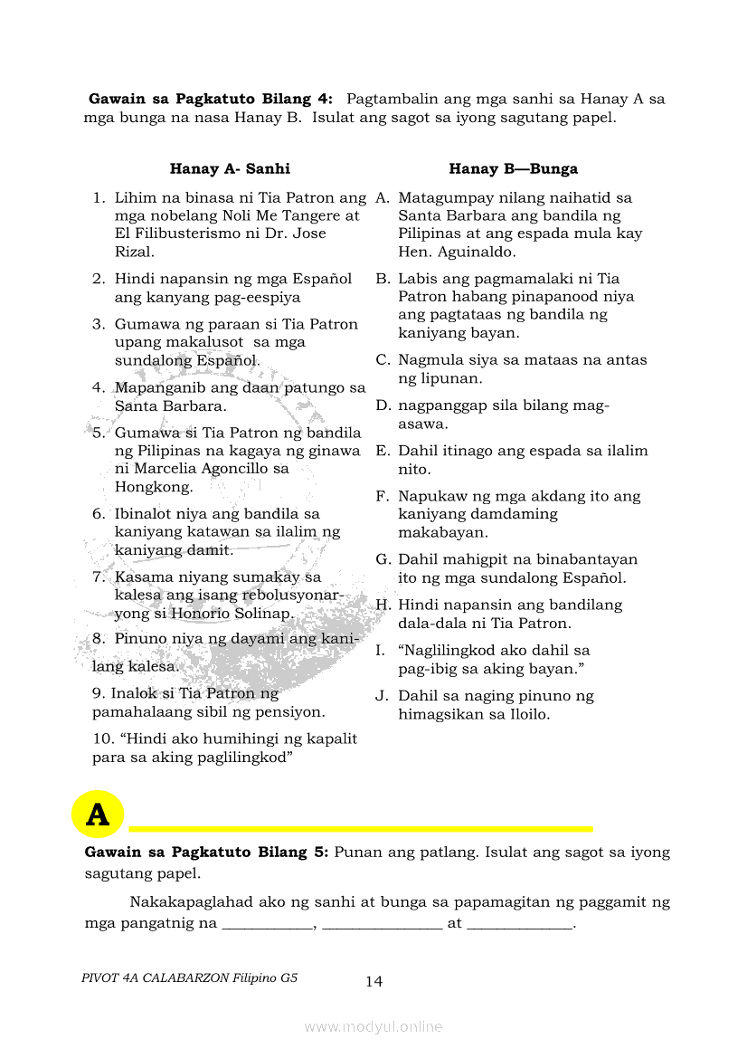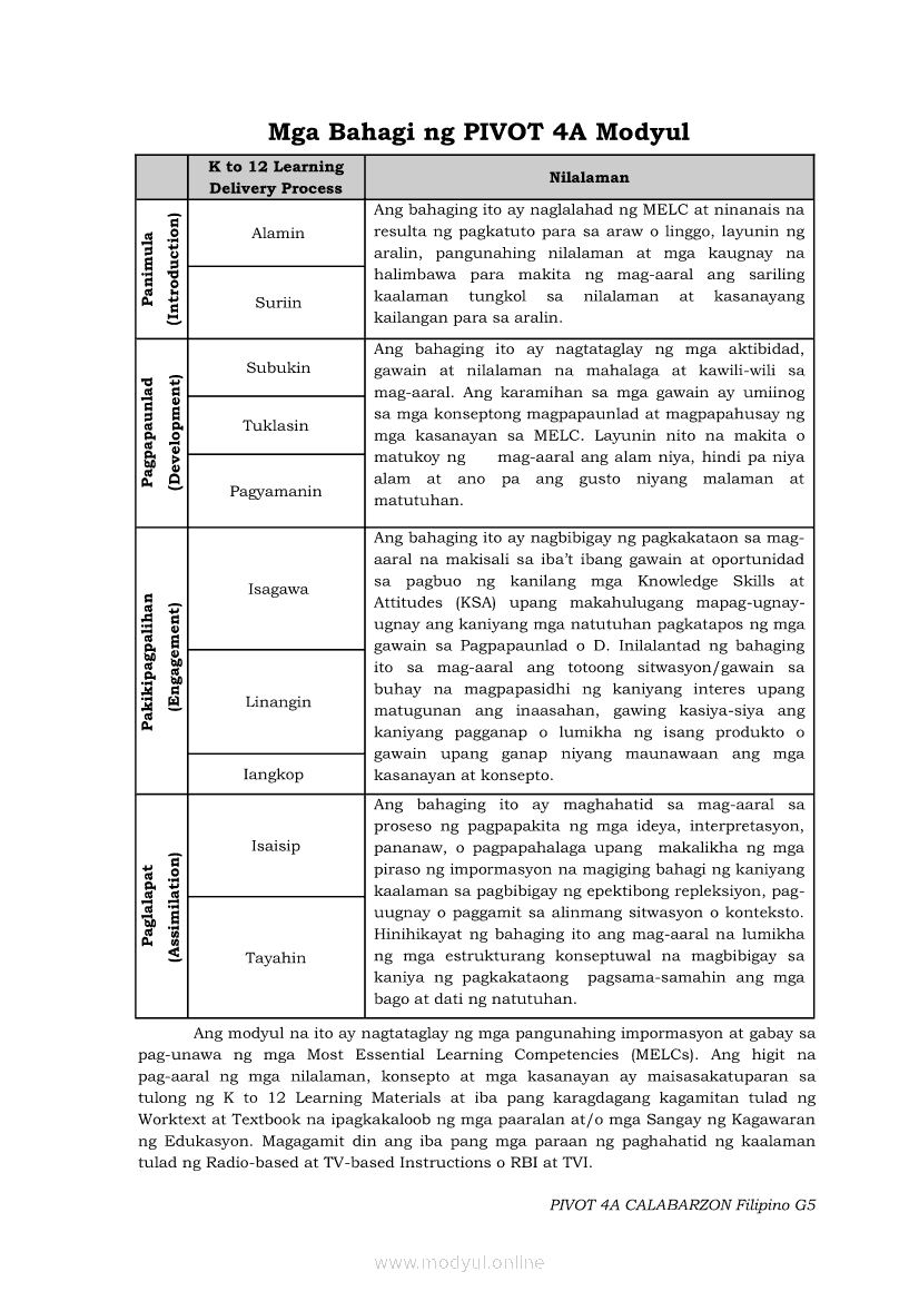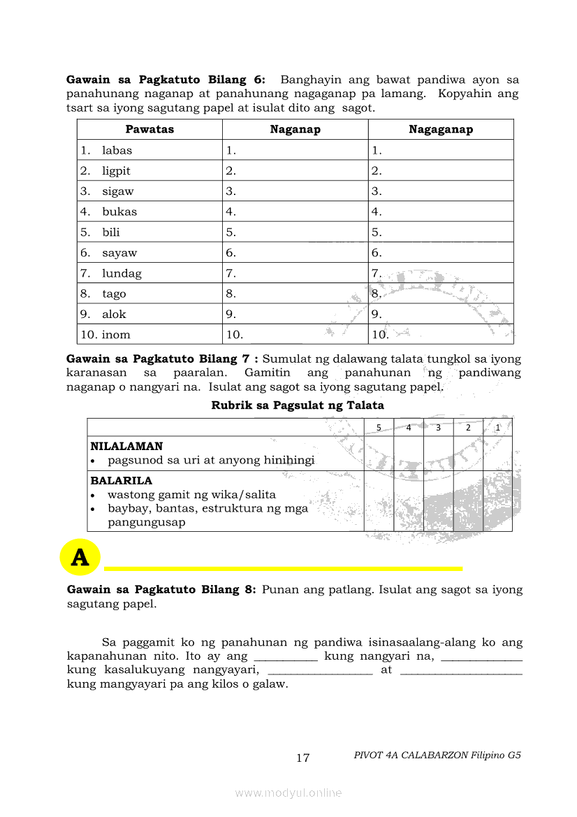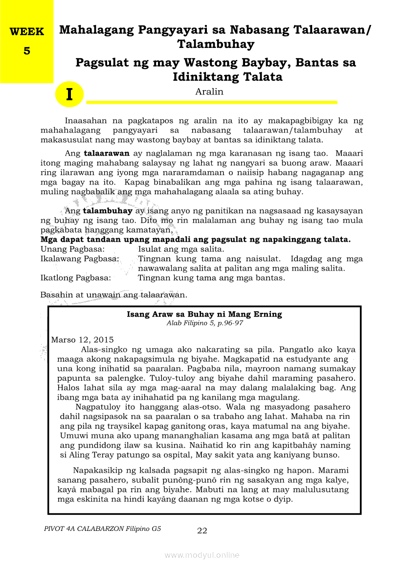 Filipino 5 Modyul para sa Ikalawang Markahan (PIVOT)Apr 22, 2021 Grade 5Kiumo M901 Tablet for Kids — comprehensive protection in learning, safety, and entertainment for as low as **₱2,399!. Filipino 5RelatedFilipino 5 Ikaapat na Markahan – Modyul 1 Paggawa ng Dayagram ng Ugnayang Sanhi at Bunga Mula sa Tekstong Napakinggan o NabasaFilipino 5 Ikaapat na Markahan – Modyul 2 Paggamit ng Iba’t Ibang Uri ng Pangungusap sa Pagsasalaysay ng Napakinggang Balita at Pakikipagdebate Tungkol sa Isang IsyuFilipino 5 Modyul 1: Pag-uugnay ng Sariling Karanasan sa Napakinggang TekstoFilipino 5 Ikalawang Markahan – Modyul 1: Pagbibigay ng Mahahalagang Pangyayari/Pagsagot sa Nabasang Talaarawan, Journal, Talambuhay at AnekdotaFilipino 5 Modyul 5: Pagpapahayag ng Sariling Opinyon o Reaksiyon sa Isang Napakinggang Balita, Isyu o Usapan