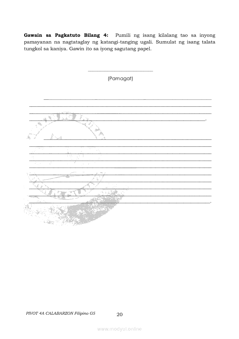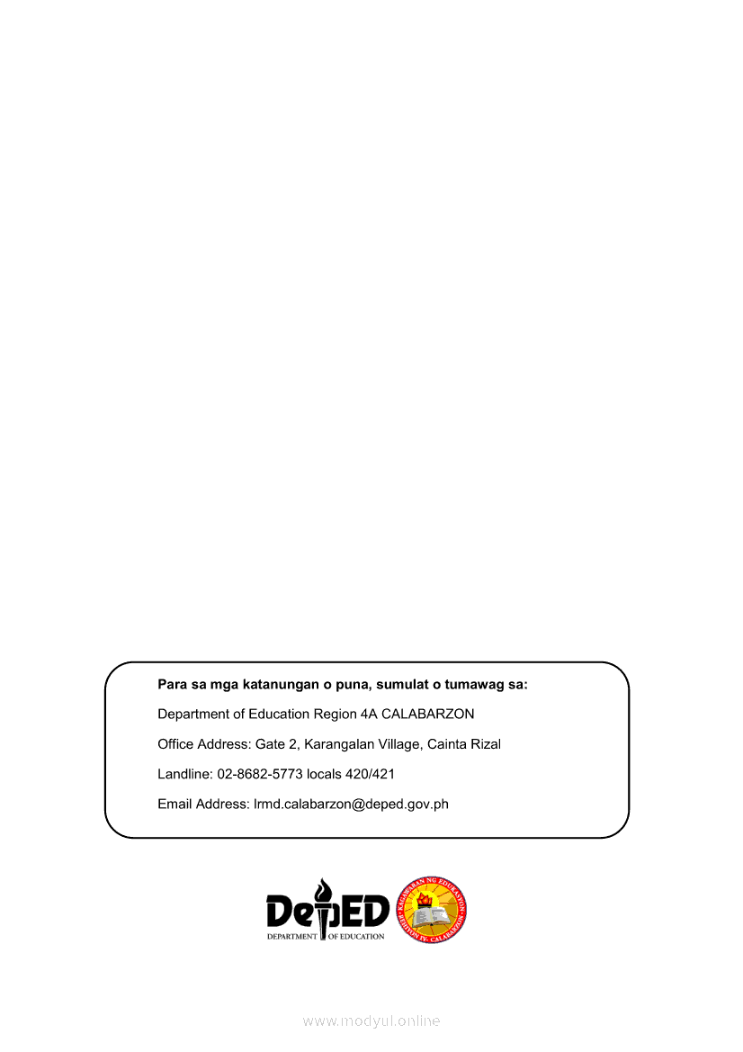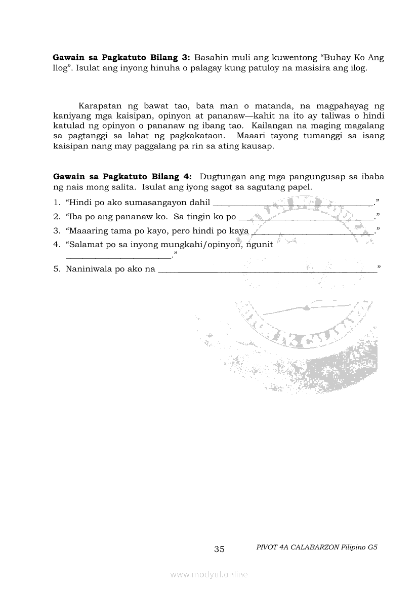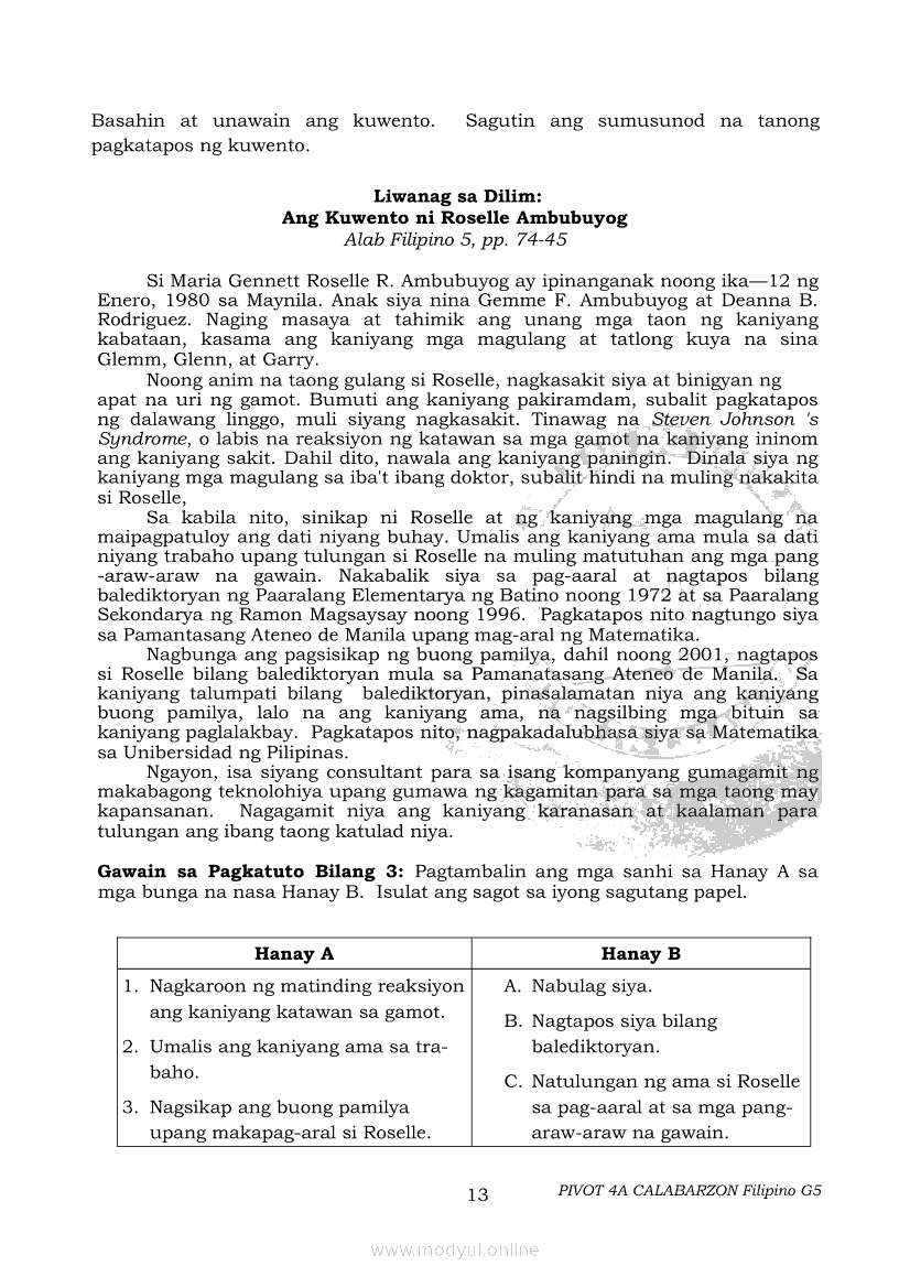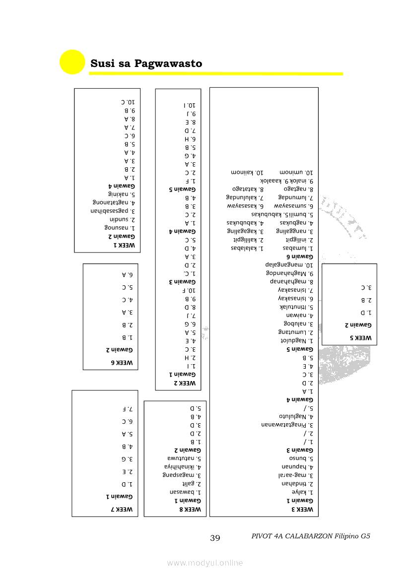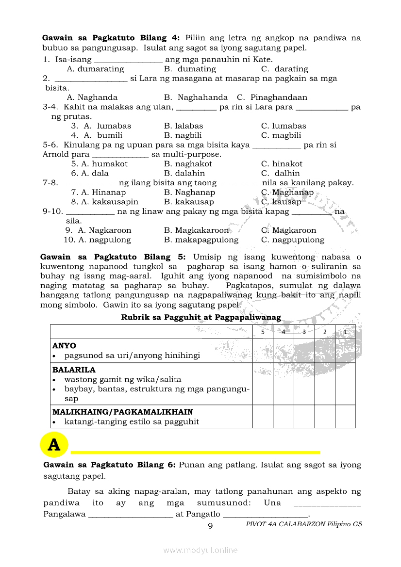 Filipino 5 Modyul para sa Ikalawang Markahan (PIVOT)Apr 22, 2021 Grade 5Kiumo M901 Tablet for Kids — comprehensive protection in learning, safety, and entertainment for as low as **₱2,399!. Filipino 5RelatedFilipino 5 Ikaapat na Markahan – Modyul 1 Paggawa ng Dayagram ng Ugnayang Sanhi at Bunga Mula sa Tekstong Napakinggan o NabasaFilipino 5 Ikaapat na Markahan – Modyul 2 Paggamit ng Iba’t Ibang Uri ng Pangungusap sa Pagsasalaysay ng Napakinggang Balita at Pakikipagdebate Tungkol sa Isang IsyuFilipino 5 Modyul 1: Pag-uugnay ng Sariling Karanasan sa Napakinggang TekstoFilipino 5 Ikalawang Markahan – Modyul 1: Pagbibigay ng Mahahalagang Pangyayari/Pagsagot sa Nabasang Talaarawan, Journal, Talambuhay at AnekdotaFilipino 5 Modyul 5: Pagpapahayag ng Sariling Opinyon o Reaksiyon sa Isang Napakinggang Balita, Isyu o Usapan
