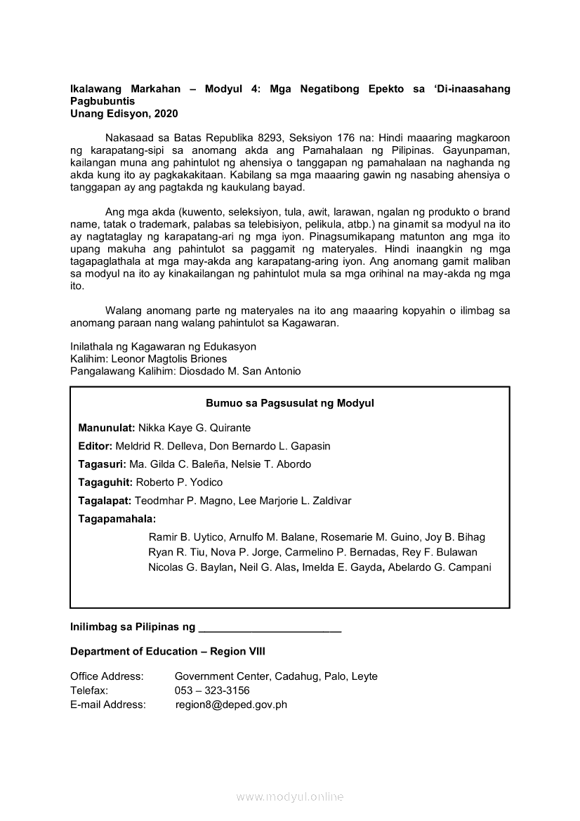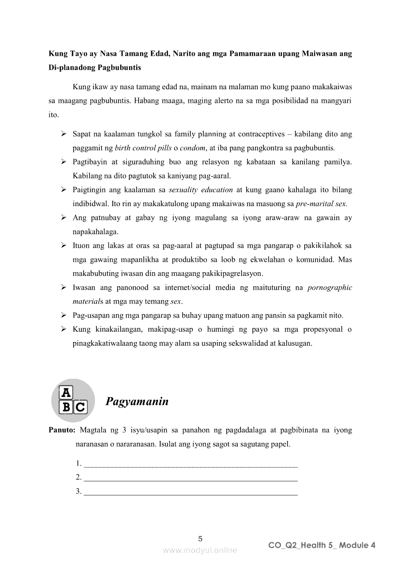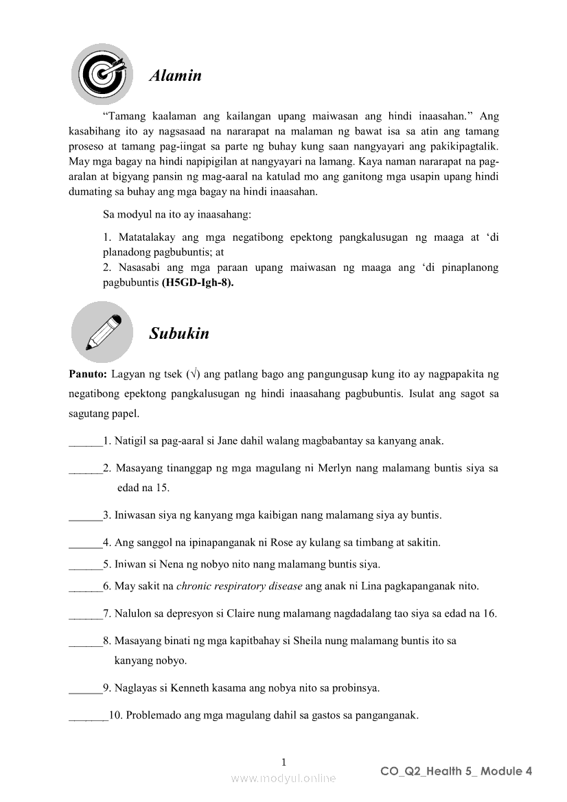 Health 5 Ikalawang Markahan – Modyul 4: Mga Negatibong Epekto sa Hindi-inaasahang PagbubuntisApr 22, 2021 Grade 5Kiumo M901 Tablet for Kids — comprehensive protection in learning, safety, and entertainment for as low as **₱2,399!. Health 5RelatedHEALTH Ikaapat na Markahan – Modyul 4b: Pangunang Lunas para sa mga Karaniwang Pinsala at KondisyonHEALTH Ikaapat na Markahan – Modyul 4a: Mga Katangian, Layunin, at Panuntunan ng Pangunang LunasHealth 5 Modyul para sa Ikalawang Markahan (PIVOT)Health 5 Ikalawang Markahan – Modyul 7: Gampaning Pangkasarian: Paano ka ba dapat?Health 5 Modyul 2: Pagpapaunlad at Pagpapanatili ng Maganda a ng Kalusugan ng Damdamin at Isipan