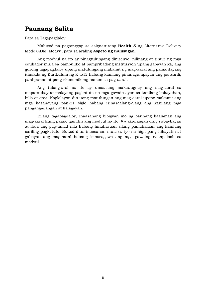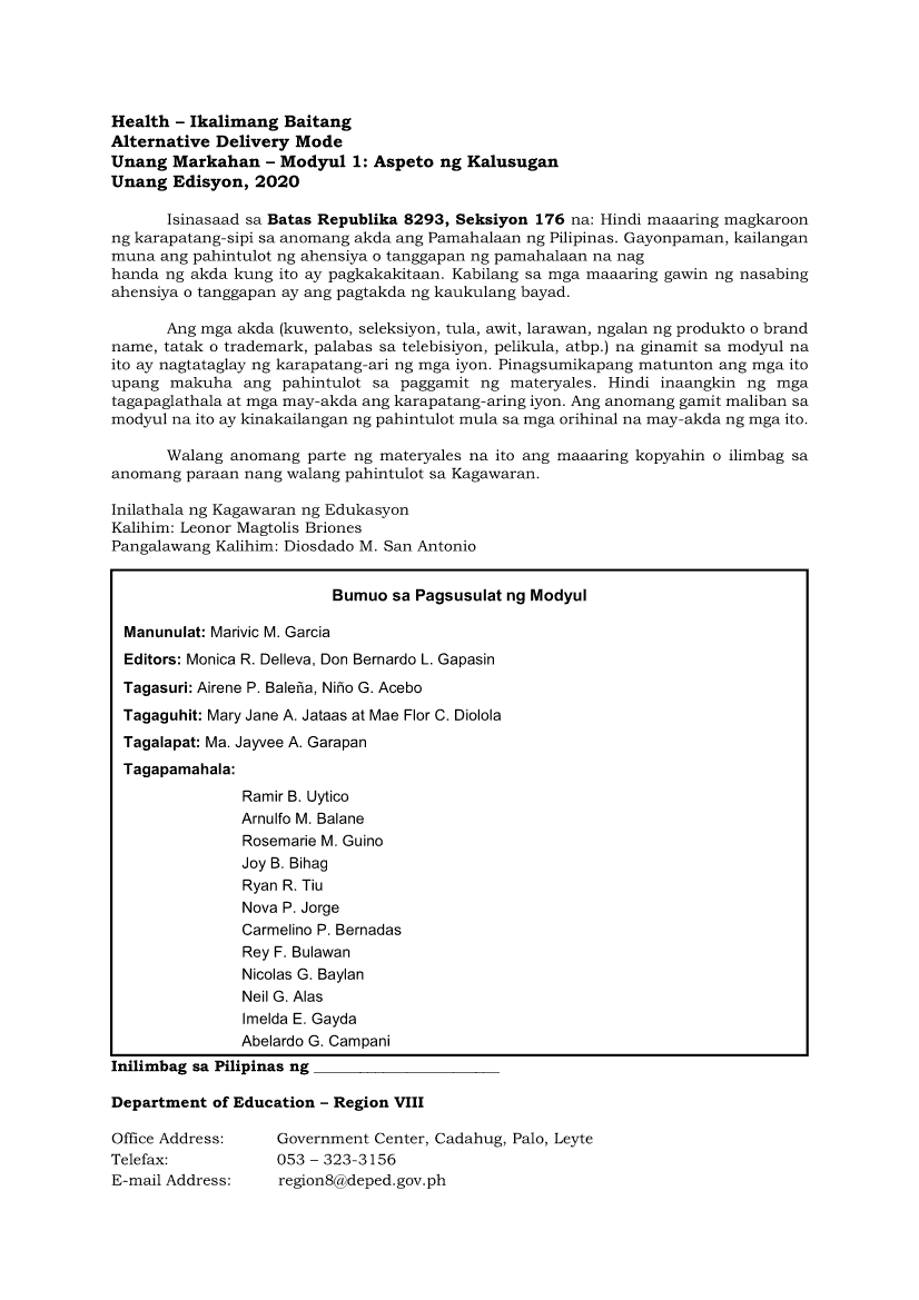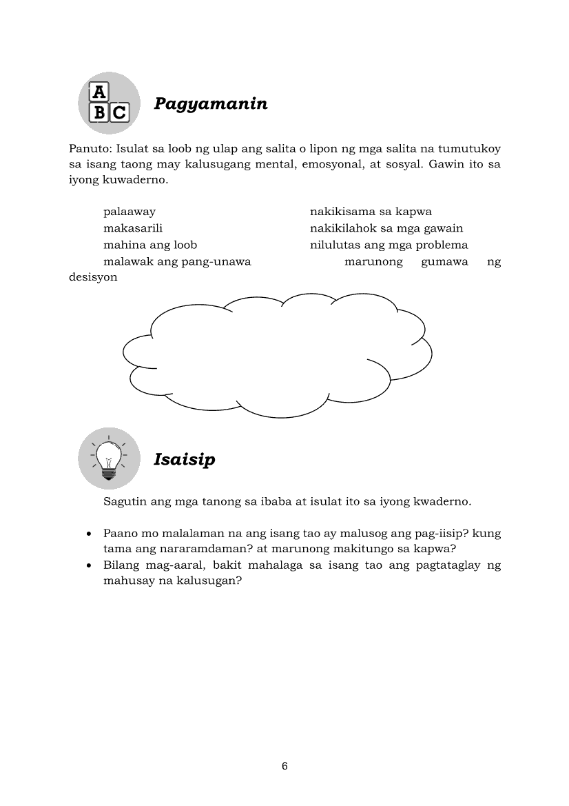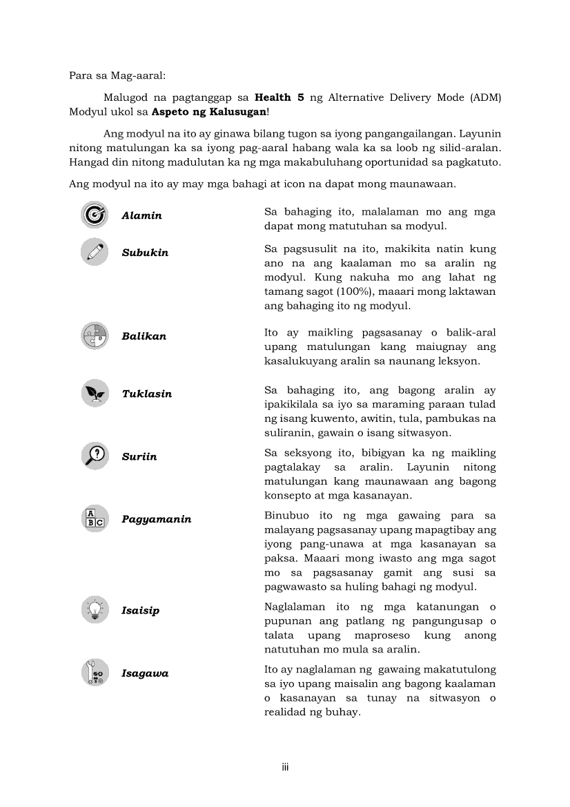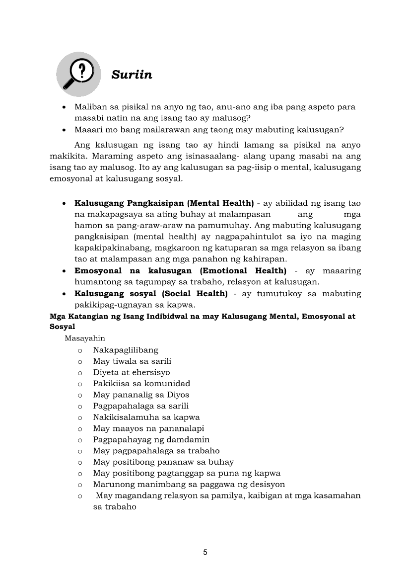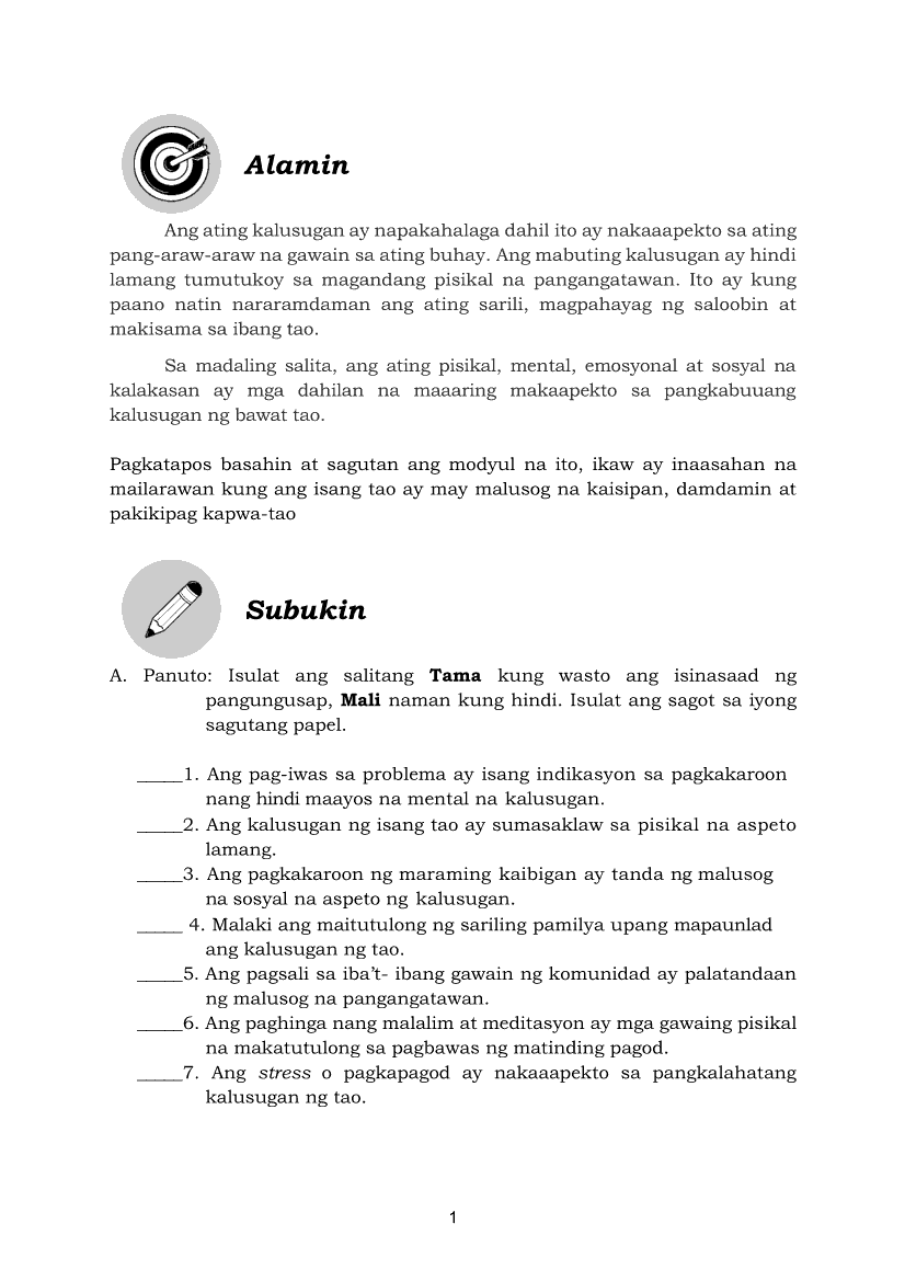 Health 5 Modyul 1: Aspeto ng KalusuganApr 22, 2021 Grade 5Kiumo M901 Tablet for Kids — comprehensive protection in learning, safety, and entertainment for as low as **₱2,399!. Health 5RelatedHEALTH Ikaapat na Markahan – Modyul 4a: Mga Katangian, Layunin, at Panuntunan ng Pangunang LunasHEALTH Ikaapat na Markahan – Modyul 4b: Pangunang Lunas para sa mga Karaniwang Pinsala at KondisyonHealth 5 Ikalawang Markahan – Modyul 2: Mga Maling Kaisipan sa Pagbibinata at PagdadalagaHealth 5 Modyul 3: Mabuti at Di-Mabuting Pakikipag-ugnayanHealth 5 Modyul 4: Positibong Naidudulot ng Mabuting Samahan sa Kalusugan
