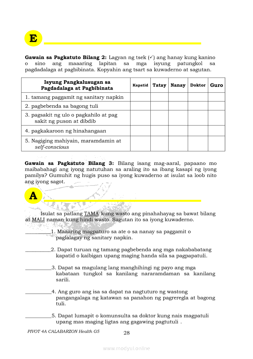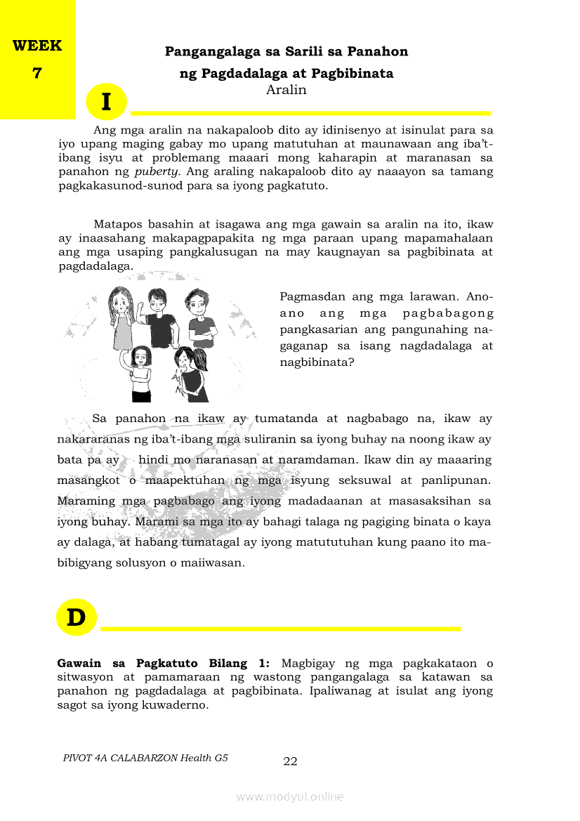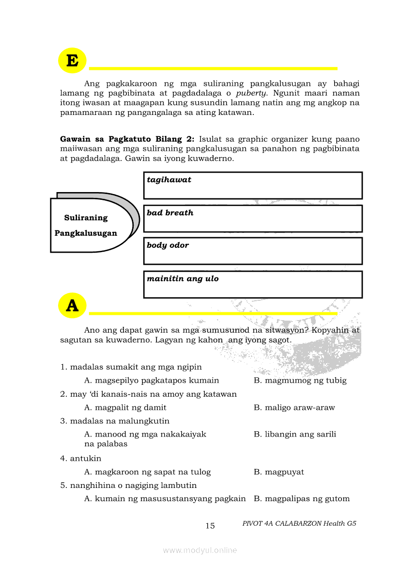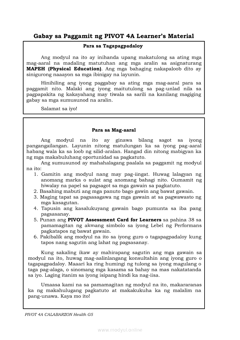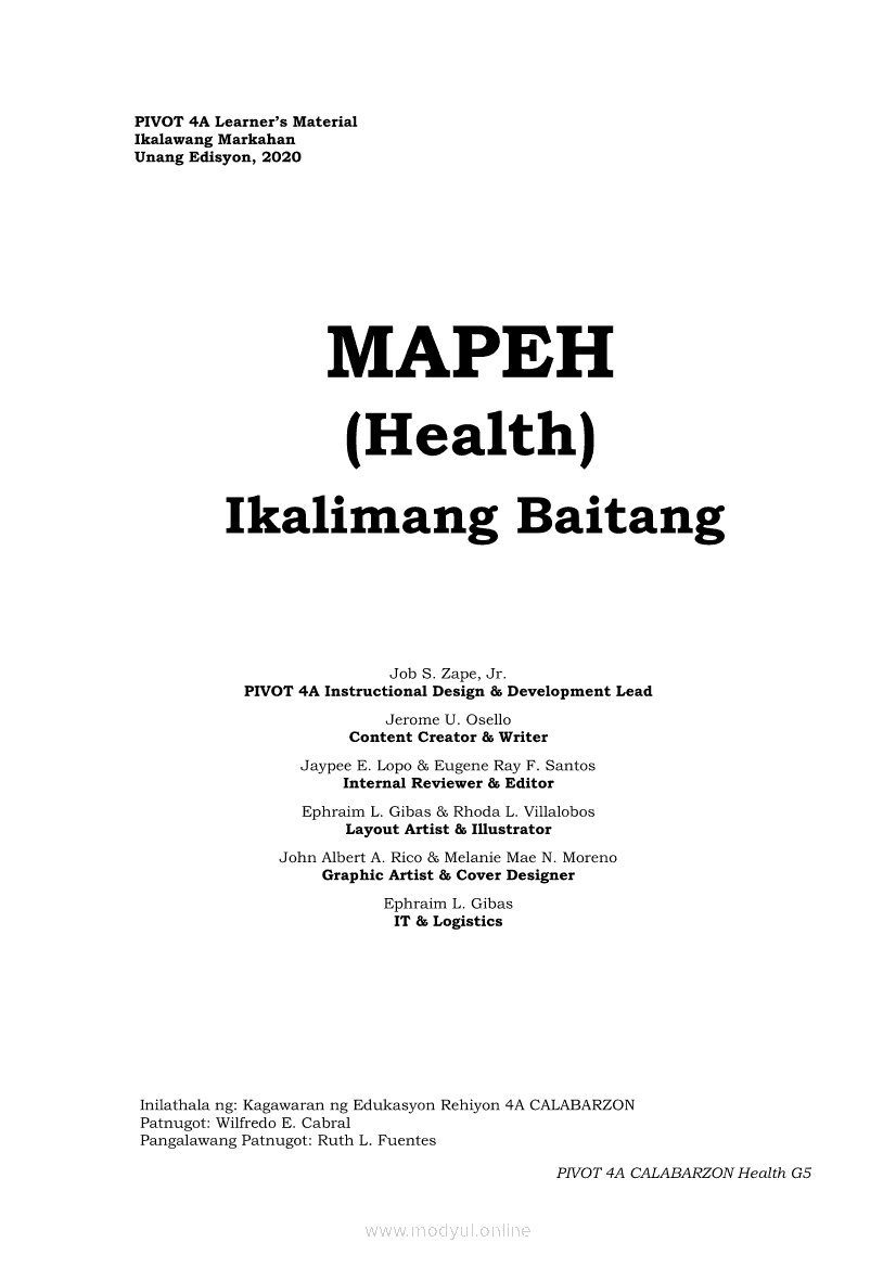 Health 5 Modyul para sa Ikalawang Markahan (PIVOT)Apr 22, 2021 Grade 5Kiumo M901 Tablet for Kids — comprehensive protection in learning, safety, and entertainment for as low as **₱2,399!. Health 5RelatedHEALTH Ikaapat na Markahan – Modyul 4b: Pangunang Lunas para sa mga Karaniwang Pinsala at KondisyonHEALTH Ikaapat na Markahan – Modyul 4a: Mga Katangian, Layunin, at Panuntunan ng Pangunang LunasHealth 5 Modyul 8: Problemang Mental, Emosyonal at Sosyal: Sino-Sino ang Makatutulong?Health 5 Ikalawang Markahan – Modyul 5: Pangangalaga sa Sarili ng Nagdadalaga at NagbibinataHealth 5 Modyul 5: Mga Pamamaraan Upang Mapabuti ang Pakikipag-ugnayan sa Kapwa