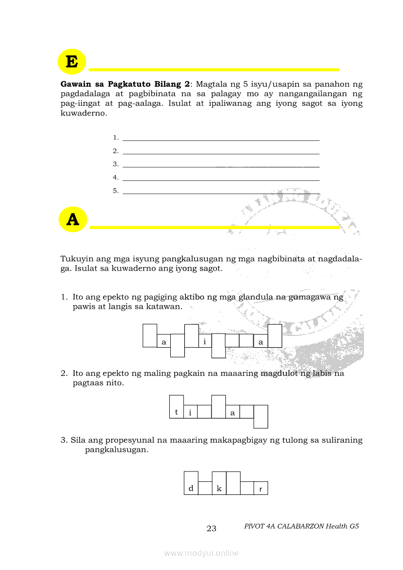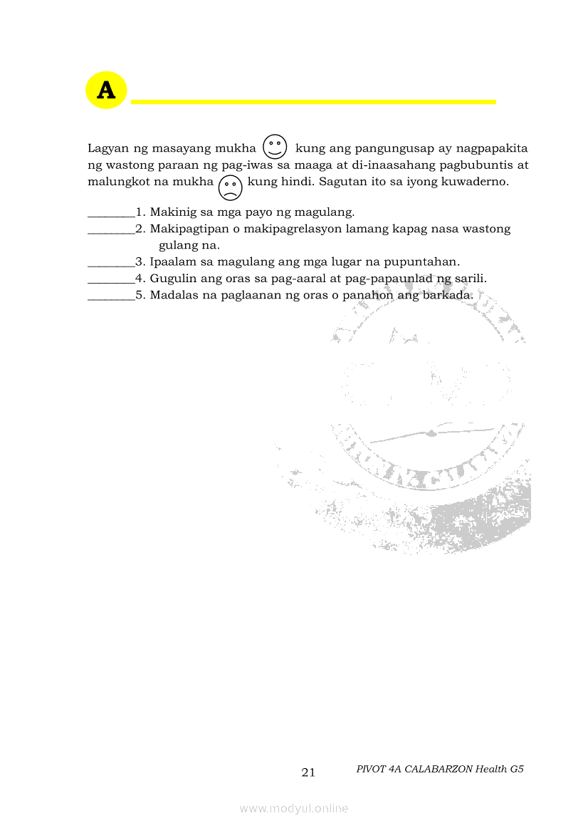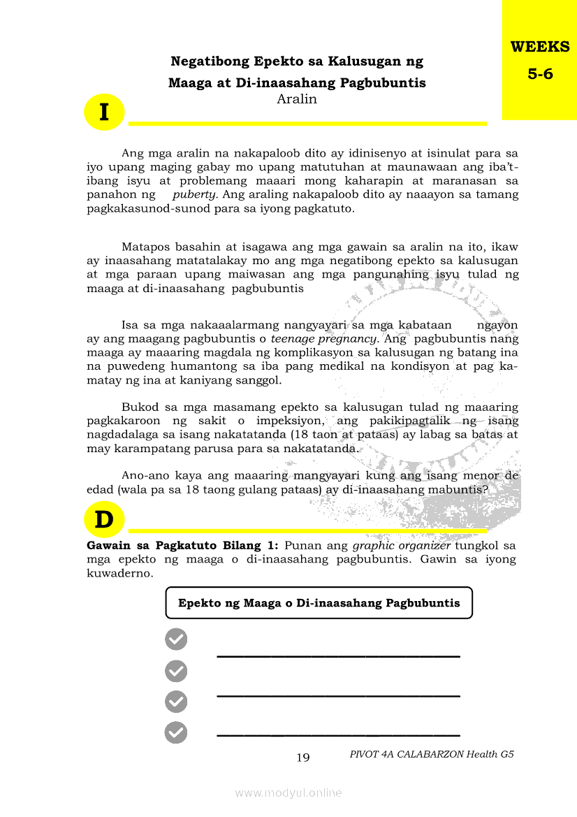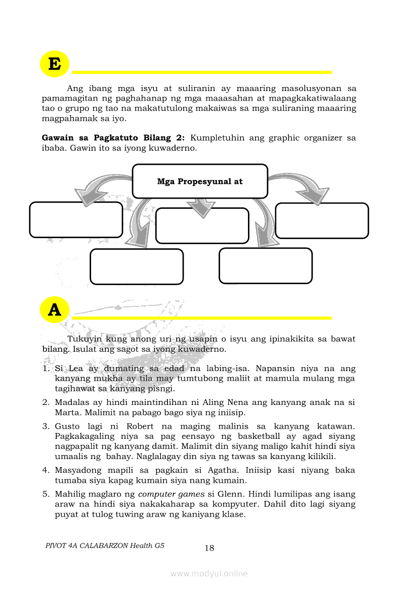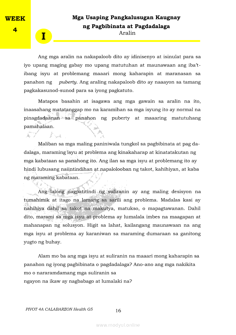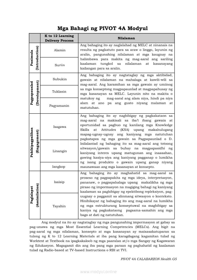 Health 5 Modyul para sa Ikalawang Markahan (PIVOT)Apr 22, 2021 Grade 5Kiumo M901 Tablet for Kids — comprehensive protection in learning, safety, and entertainment for as low as **₱2,399!. Health 5RelatedHEALTH Ikaapat na Markahan – Modyul 4b: Pangunang Lunas para sa mga Karaniwang Pinsala at KondisyonHEALTH Ikaapat na Markahan – Modyul 4a: Mga Katangian, Layunin, at Panuntunan ng Pangunang LunasHealth 5 Modyul 8: Problemang Mental, Emosyonal at Sosyal: Sino-Sino ang Makatutulong?Health 5 Ikalawang Markahan – Modyul 5: Pangangalaga sa Sarili ng Nagdadalaga at NagbibinataHealth 5 Modyul 5: Mga Pamamaraan Upang Mapabuti ang Pakikipag-ugnayan sa Kapwa