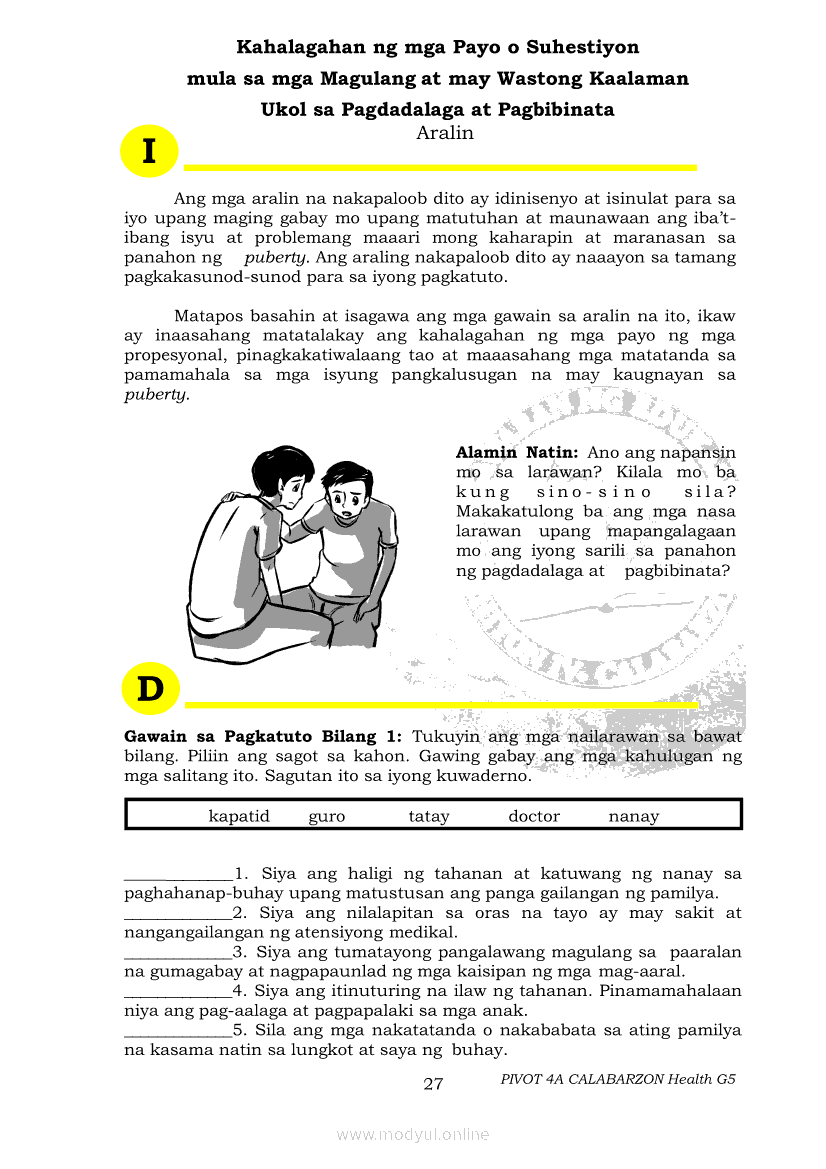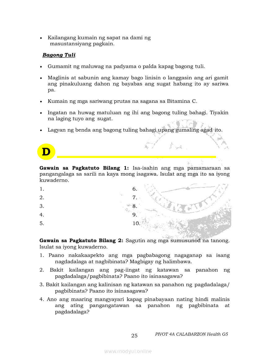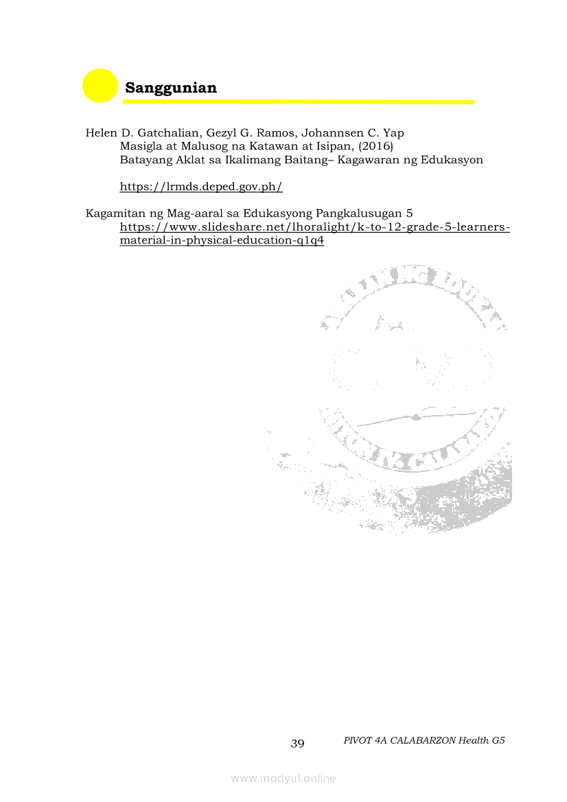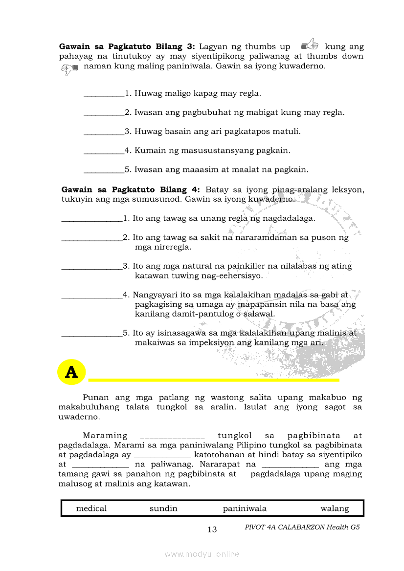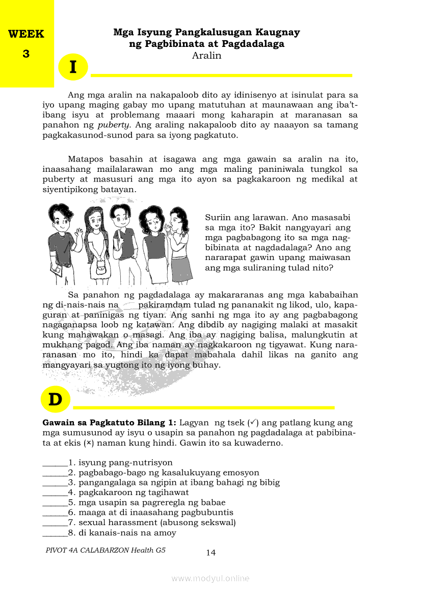 Health 5 Modyul para sa Ikalawang Markahan (PIVOT)Apr 22, 2021 Grade 5Kiumo M901 Tablet for Kids — comprehensive protection in learning, safety, and entertainment for as low as **₱2,399!. Health 5RelatedHEALTH Ikaapat na Markahan – Modyul 4b: Pangunang Lunas para sa mga Karaniwang Pinsala at KondisyonHEALTH Ikaapat na Markahan – Modyul 4a: Mga Katangian, Layunin, at Panuntunan ng Pangunang LunasHealth 5 Modyul 8: Problemang Mental, Emosyonal at Sosyal: Sino-Sino ang Makatutulong?Health 5 Ikalawang Markahan – Modyul 5: Pangangalaga sa Sarili ng Nagdadalaga at NagbibinataHealth 5 Modyul 5: Mga Pamamaraan Upang Mapabuti ang Pakikipag-ugnayan sa Kapwa