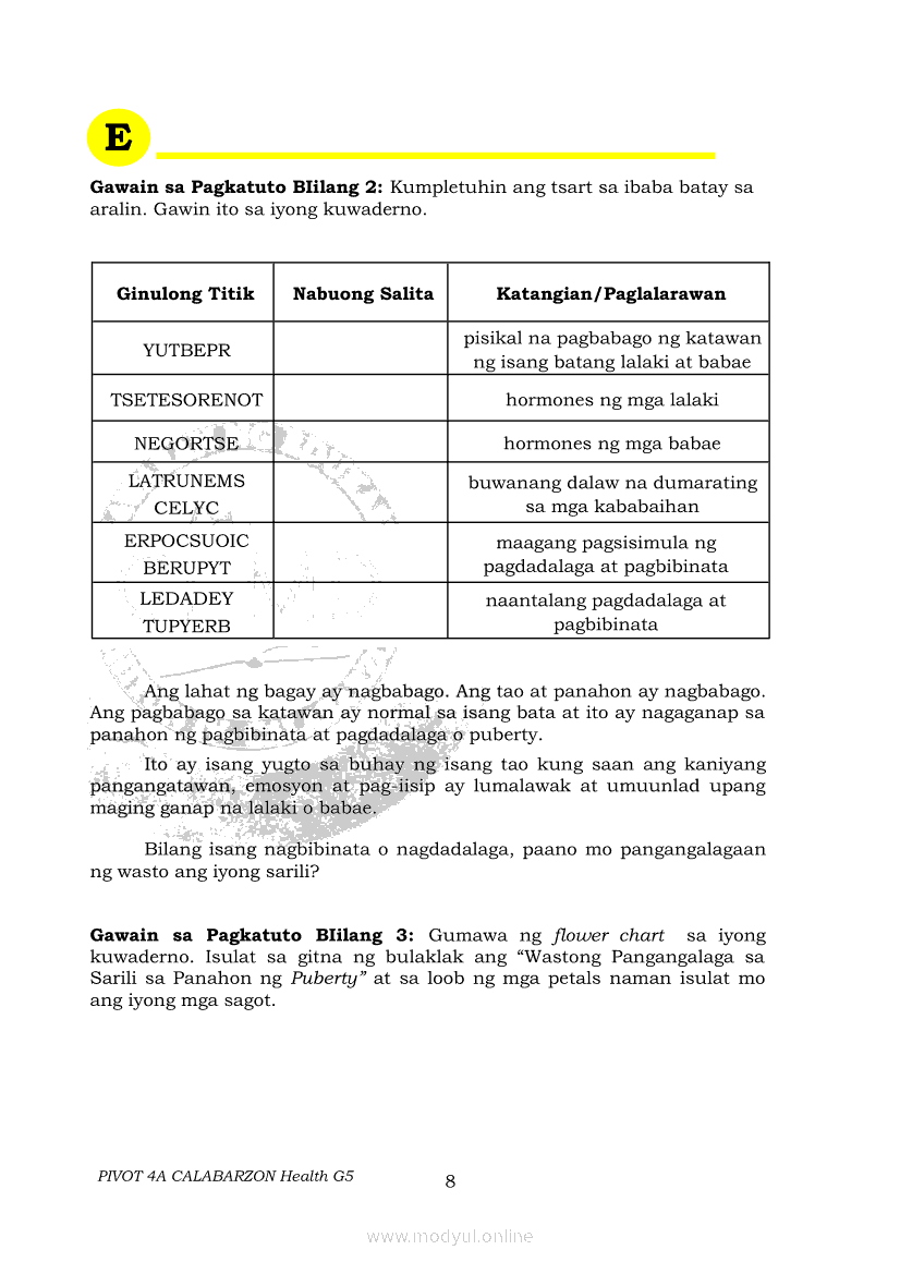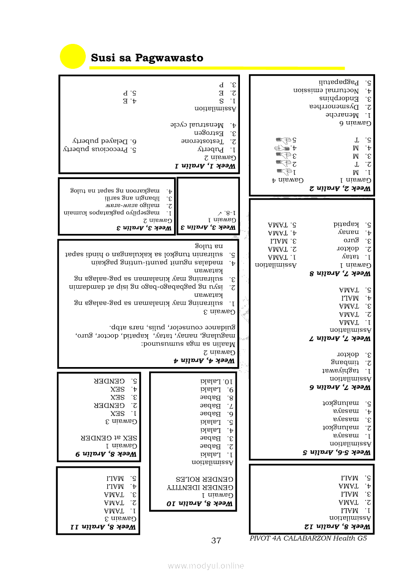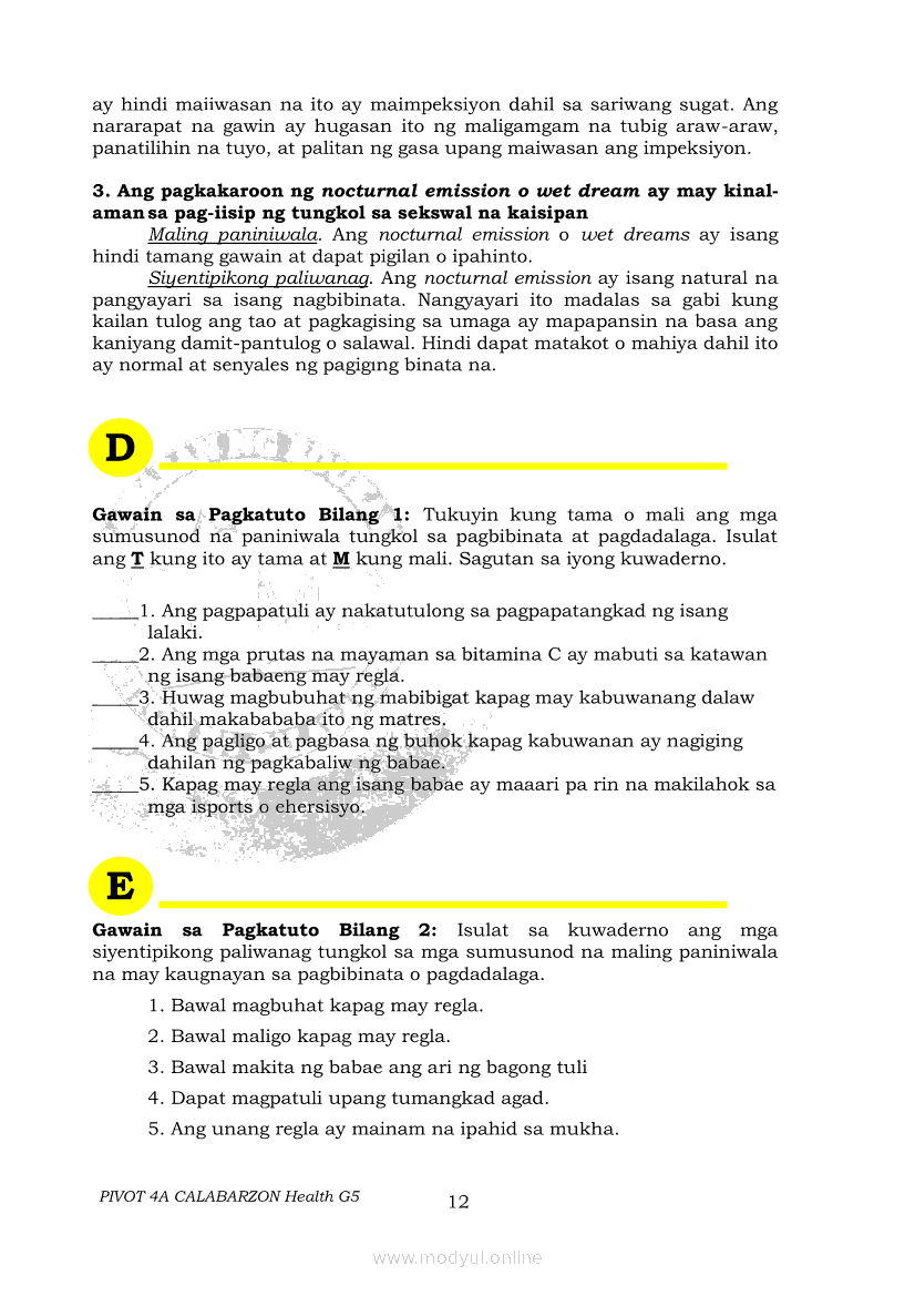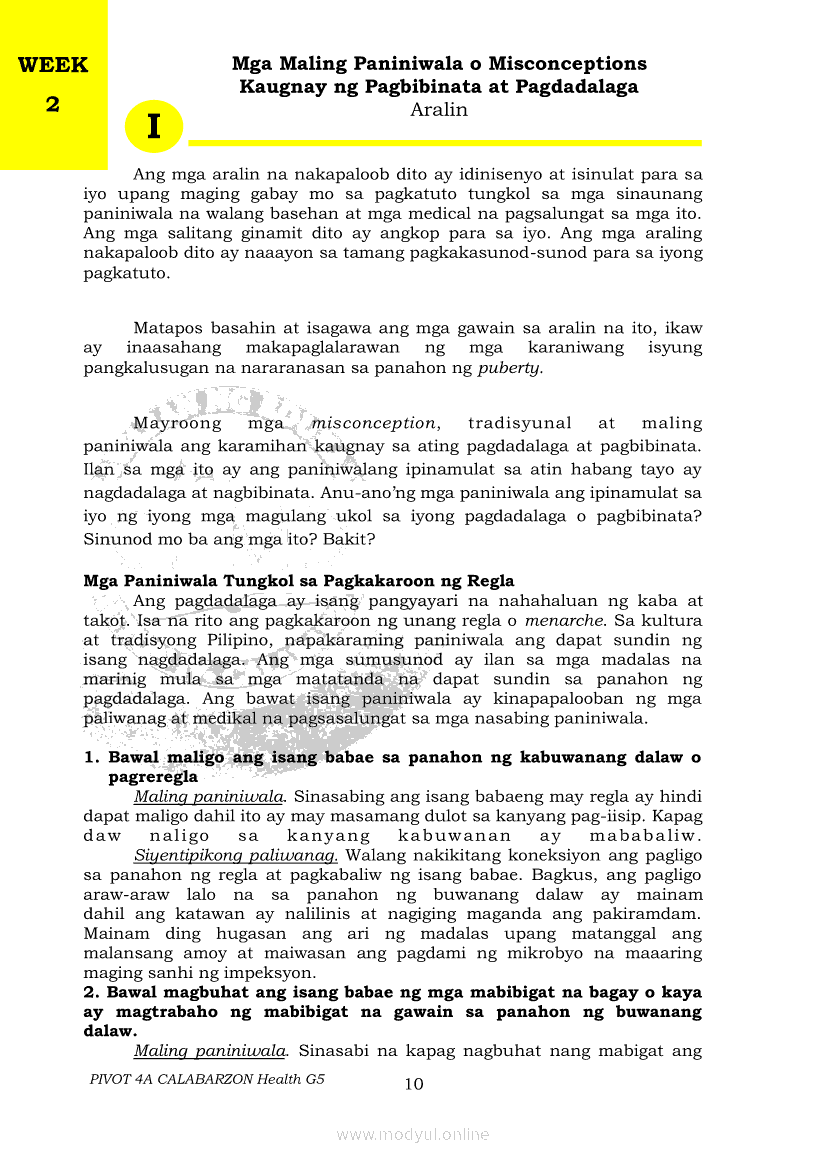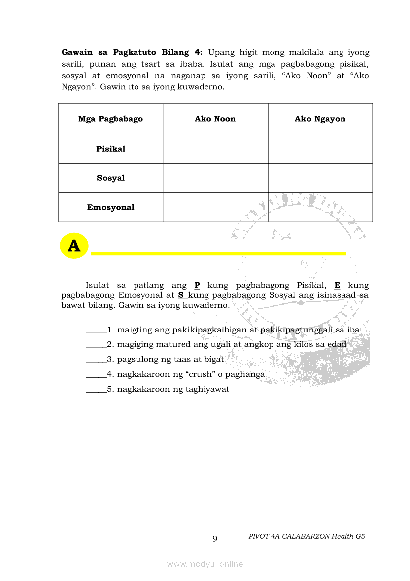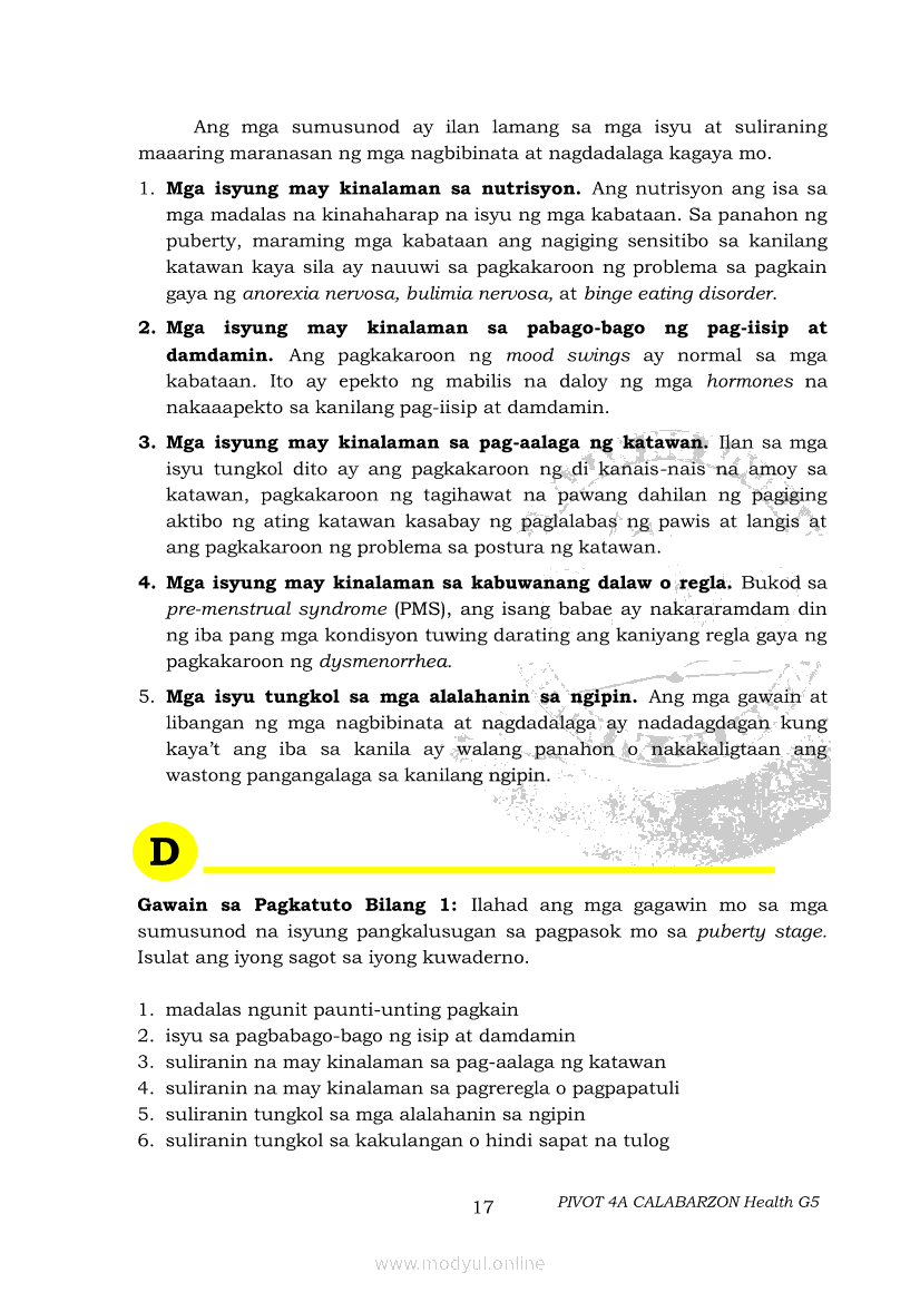 Health 5 Modyul para sa Ikalawang Markahan (PIVOT)Apr 22, 2021 Grade 5Kiumo M901 Tablet for Kids — comprehensive protection in learning, safety, and entertainment for as low as **₱2,399!. Health 5RelatedHEALTH Ikaapat na Markahan – Modyul 4b: Pangunang Lunas para sa mga Karaniwang Pinsala at KondisyonHEALTH Ikaapat na Markahan – Modyul 4a: Mga Katangian, Layunin, at Panuntunan ng Pangunang LunasHealth 5 Modyul 8: Problemang Mental, Emosyonal at Sosyal: Sino-Sino ang Makatutulong?Health 5 Ikalawang Markahan – Modyul 5: Pangangalaga sa Sarili ng Nagdadalaga at NagbibinataHealth 5 Modyul 5: Mga Pamamaraan Upang Mapabuti ang Pakikipag-ugnayan sa Kapwa