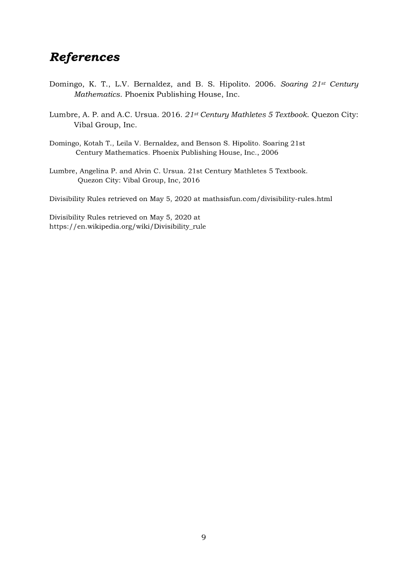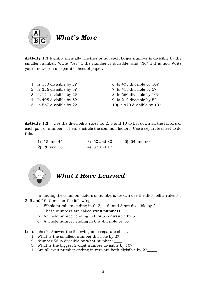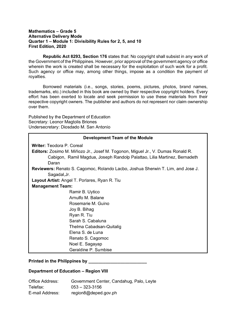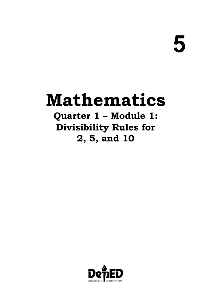 Math 5 Module 1-Divisibility Rules for 2, 5, and 10Apr 22, 2021 Grade 5Kiumo M901 Tablet for Kids — comprehensive protection in learning, safety, and entertainment for as low as **₱2,399!. Math 5RelatedMATHEMATICS Quarter 4 - Module 6 Solving Routine, Non-Routine Problems and Drawing Inferences Based on the Data Presented in a Line GraphMATHEMATICS Quarter 4: Module 1 Finding and Solving Routine and Non-Routine Problems Involving Area of a Given CircleMATHEMATICS Quarter 4: Module 3 Finding and Solving Problems Involving Volume of a Cube and Rectangular PrismMATHEMATICS Quarter 4 - Module 7 Describing, Performing and Recording Result of an Experimental ProbabilityMATHEMATICS Quarter 4 – Module 8 Analyzing and Solving Routine and Non-Routine Problems Involving Experimental Probability