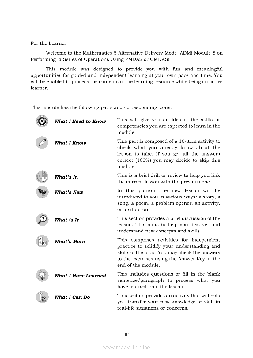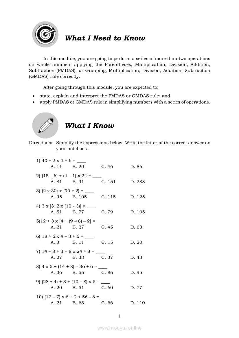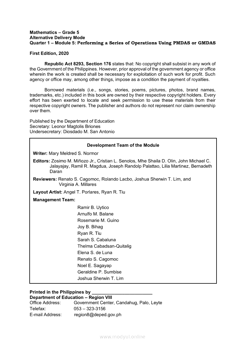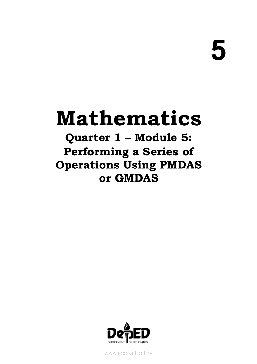Math 5 Module 5: Performing a Series of Operations Using PMDAS or GMDASApr 22, 2021 Grade 5Kiumo M901 Tablet for Kids — comprehensive protection in learning, safety, and entertainment for as low as **₱2,399!. Math 5RelatedMATHEMATICS Quarter 4: Module 4 Reading, Measuring and Solving Routine and Non-Routine Problems Involving Temperature in Real-Life SituationsMATHEMATICS Quarter 4: Module 1 Finding and Solving Routine and Non-Routine Problems Involving Area of a Given CircleMATHEMATICS Quarter 4 – Module 8 Analyzing and Solving Routine and Non-Routine Problems Involving Experimental ProbabilityMATHEMATICS Quarter 4: Module 2 Visualizing Volume of a Cube and Rectangular PrismMATHEMATICS Quarter 4: Module 5 Organizing, Presenting and Interpreting Data in a Line Graph