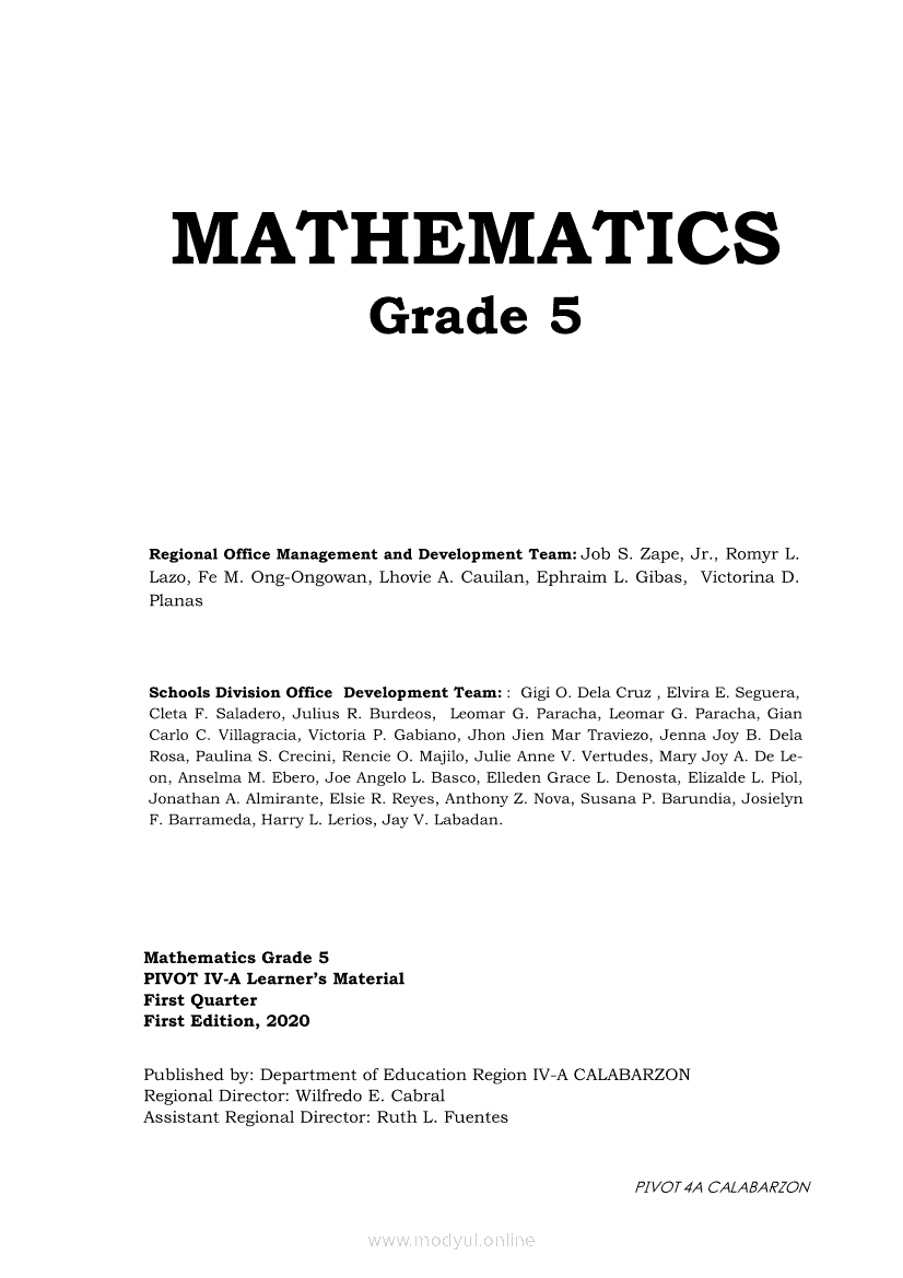 Math 5 PIVOT Module MathApr 22, 2021 Grade 5Kiumo M901 Tablet for Kids — comprehensive protection in learning, safety, and entertainment for as low as **₱2,399!. Math 5RelatedMATHEMATICS Quarter 4 - Module 6 Solving Routine, Non-Routine Problems and Drawing Inferences Based on the Data Presented in a Line GraphMATHEMATICS Quarter 4: Module 5 Organizing, Presenting and Interpreting Data in a Line GraphMATHEMATICS Quarter 4: Module 1 Finding and Solving Routine and Non-Routine Problems Involving Area of a Given CircleMATHEMATICS Quarter 4: Module 2 Visualizing Volume of a Cube and Rectangular PrismMATHEMATICS Quarter 4 - Module 7 Describing, Performing and Recording Result of an Experimental Probability