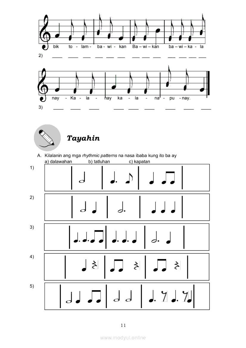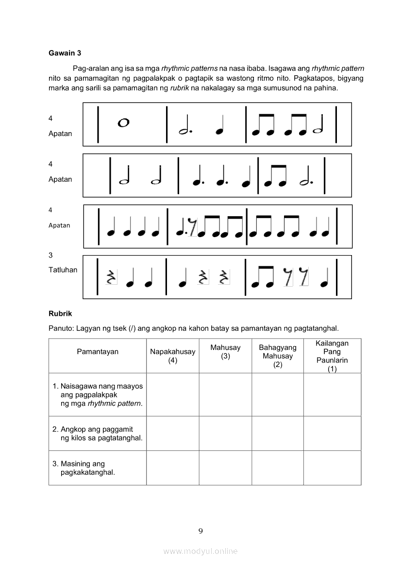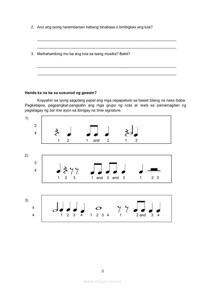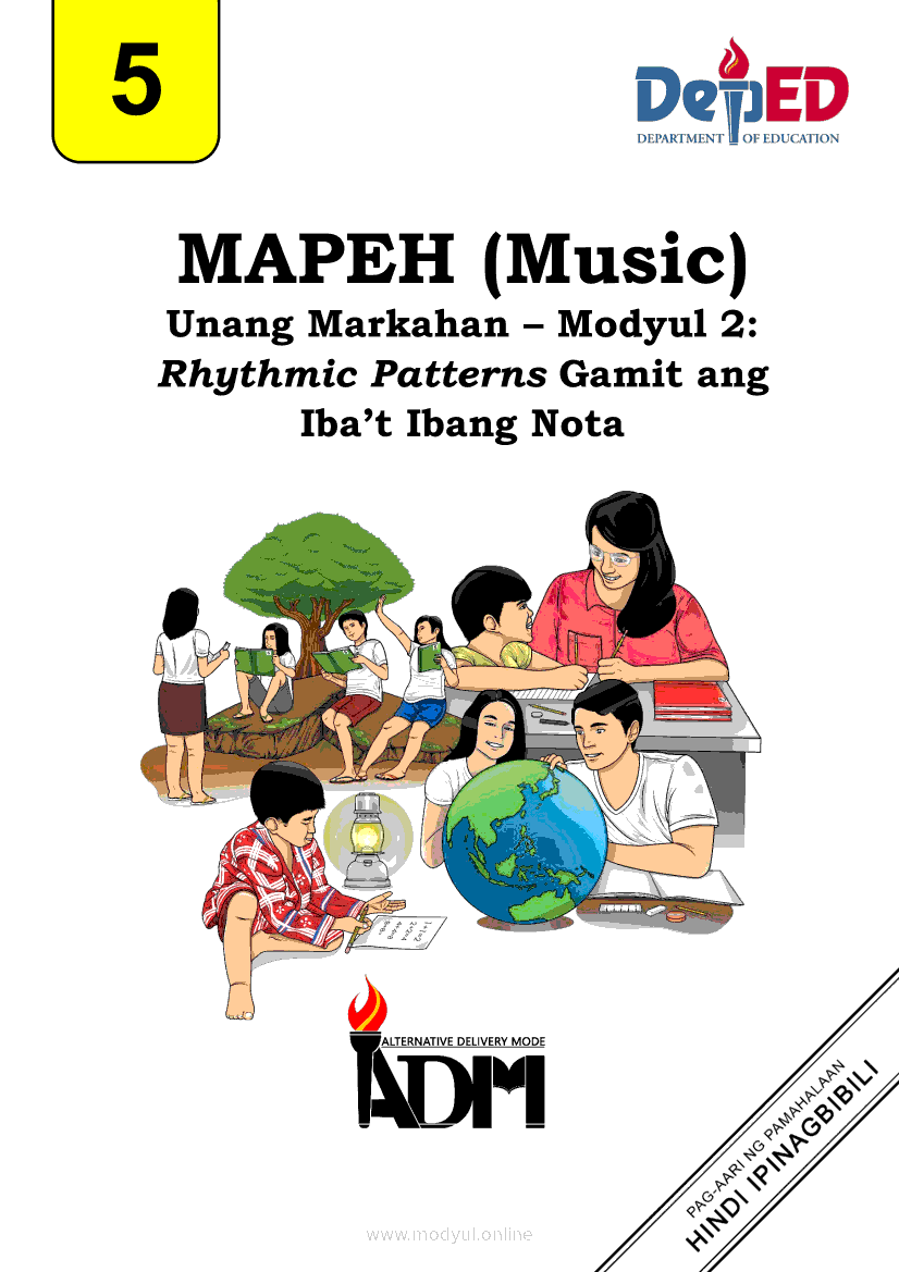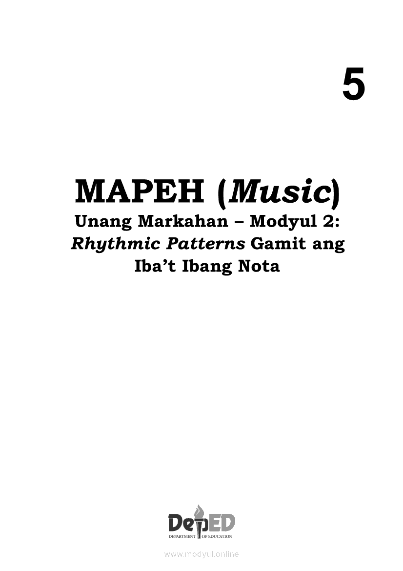 Music 5 Modyul 2: Rhythmic Patterns Gamit ang Iba’t Ibang Nota 5Apr 22, 2021 Grade 5Kiumo M901 Tablet for Kids — comprehensive protection in learning, safety, and entertainment for as low as **₱2,399!. Music 5RelatedMUSIC Ikaapat na Markahan – Modyul 4a: Mga Antas ng Dynamics at TempoMUSIC Ikaapat Na Markahan – Modyul: 4b Texture at HarmonyMusic 5 Modyul 4: Ang mga Rhythmic PatternsMusic 5 Ikalawang Markahan – Modyul 1: Kahulugan at Gamit ng F-clef sa StaffMusic 5 Modyul para sa Ikalawang Markahan (PIVOT)