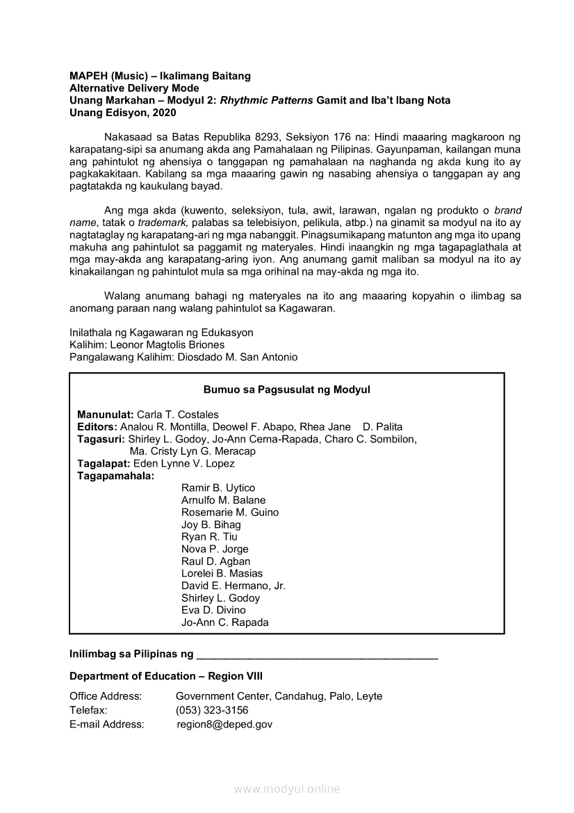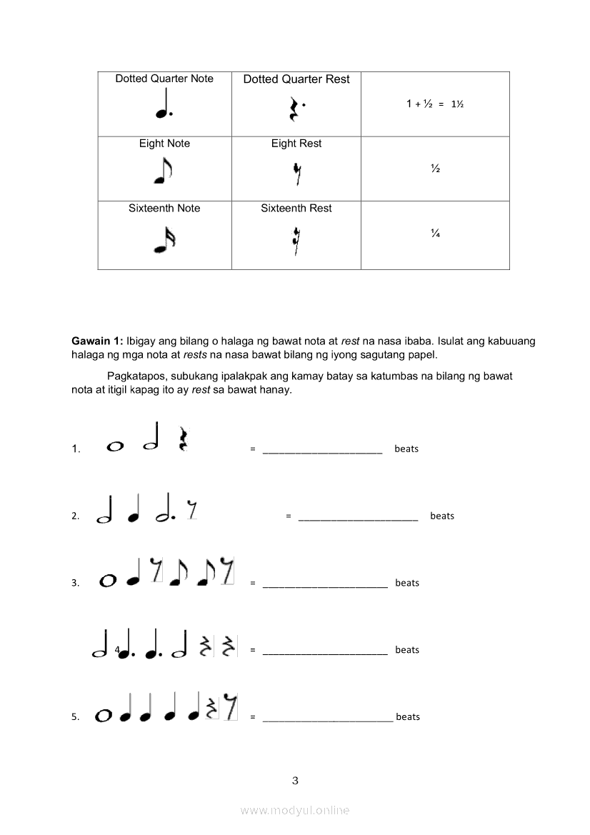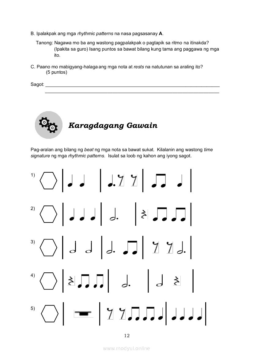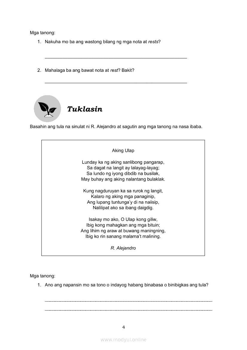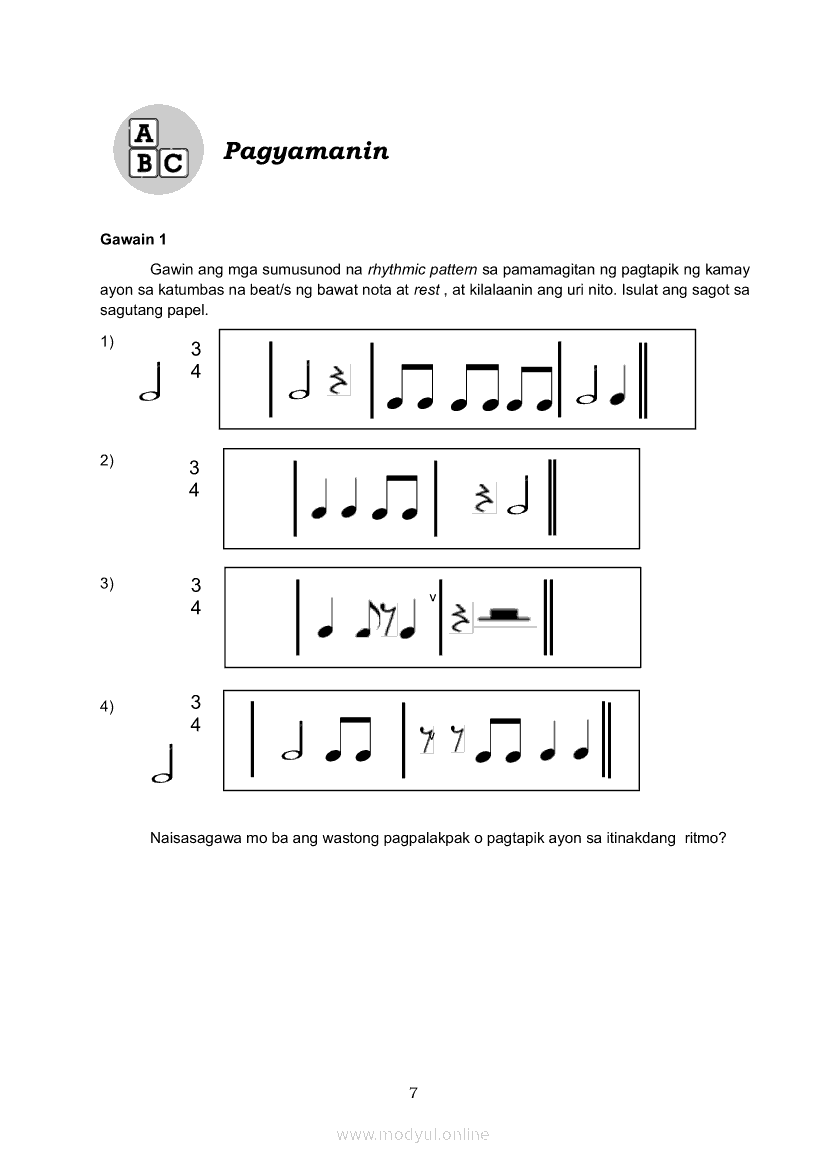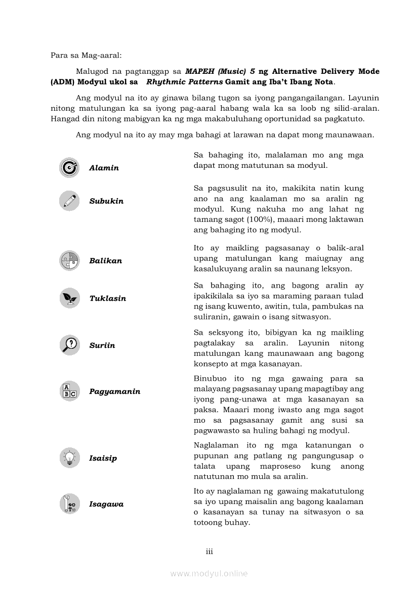 Music 5 Modyul 2: Rhythmic Patterns Gamit ang Iba’t Ibang Nota 5Apr 22, 2021 Grade 5Kiumo M901 Tablet for Kids — comprehensive protection in learning, safety, and entertainment for as low as **₱2,399!. Music 5RelatedMUSIC Ikaapat na Markahan – Modyul 4a: Mga Antas ng Dynamics at TempoMUSIC Ikaapat Na Markahan – Modyul: 4b Texture at HarmonyMusic 5 Modyul 4: Ang mga Rhythmic PatternsMusic 5 Ikalawang Markahan – Modyul 1: Kahulugan at Gamit ng F-clef sa StaffMusic 5 Modyul para sa Ikalawang Markahan (PIVOT)